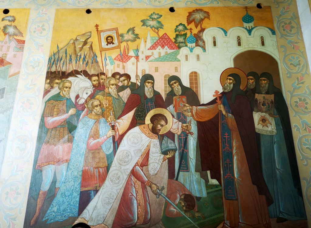 其中有一幅拱门走廊墙上壁画有关库里科沃会战,1380年圣谢尔盖为将赴战场的莫斯科大公德米特里·顿斯科伊祝福,预言俄军取胜,并派去两修士作谋士。蒙军大败,为俄摆脱蒙古统治奠定基础。