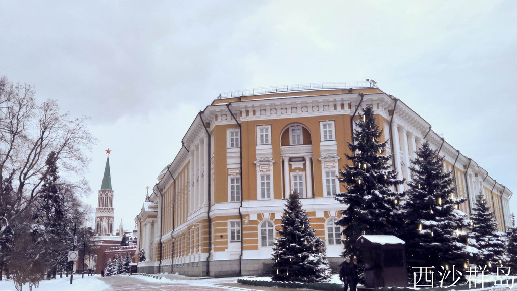 过了军械库,在路的左前方可以看到一座呈三角形的黄色三层建筑,这是建于18世纪的俄罗斯联邦参政院、元老院、前苏联部长会议大厦,现在是现任总统办公和居任的地方,普京大帝的办公室就在这座大楼,这里严格规定游人不得靠近。这里禁止靠近的哨音和警告声经常响起,告诉游客不准靠近。