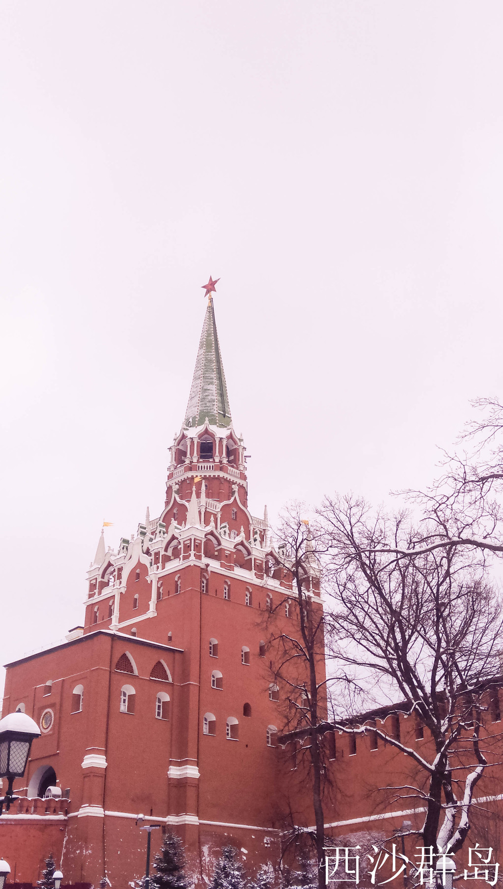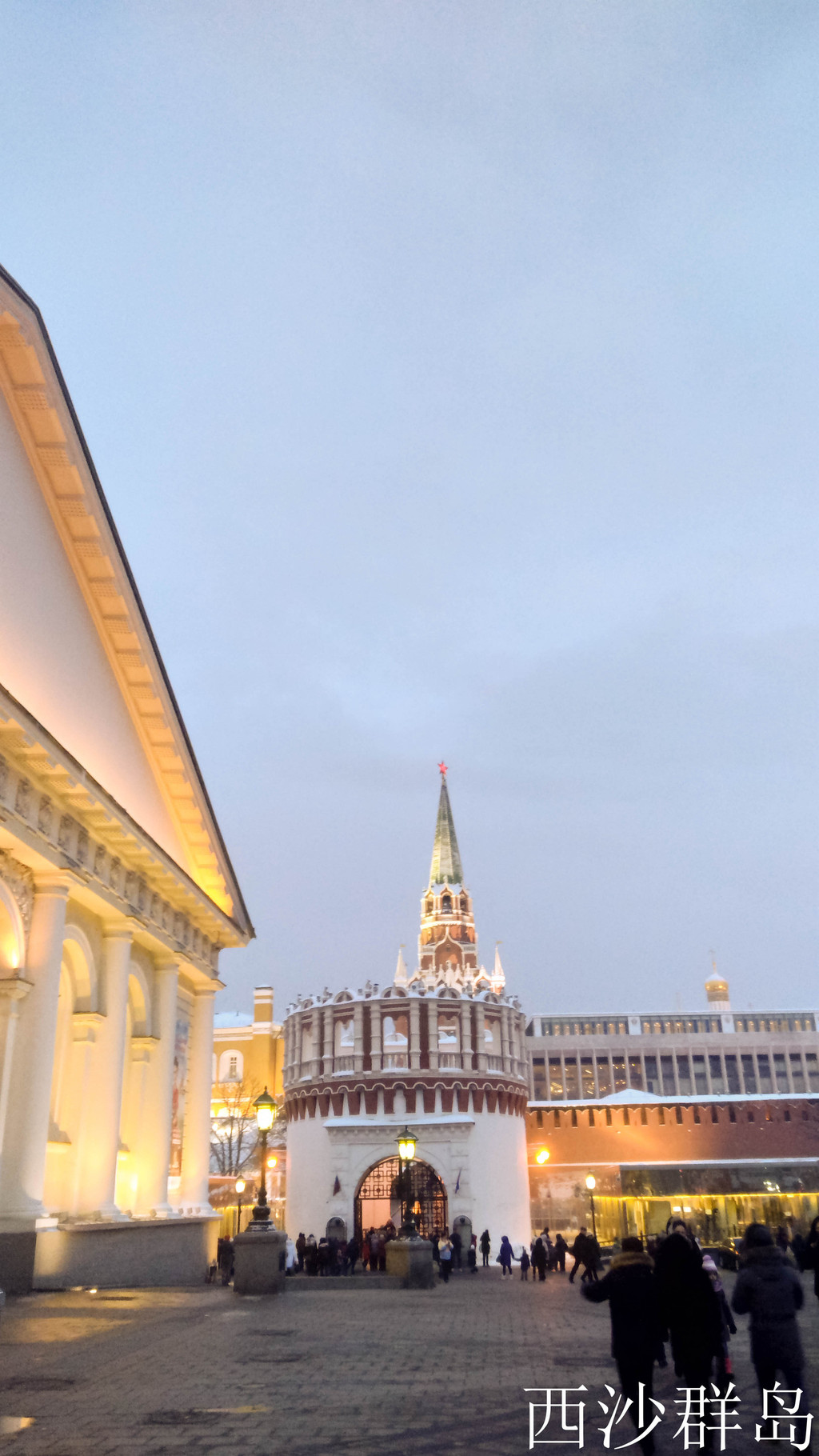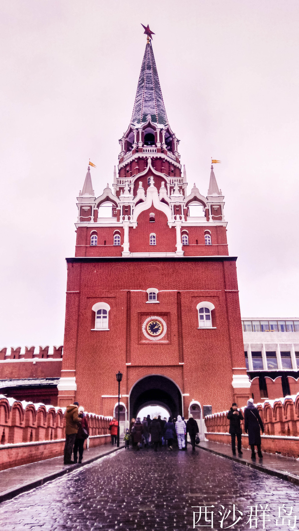 通过检票和安检,克里姆林宫入口的库塔菲亚塔楼是所有塔楼中唯一一个没有尖顶的塔楼,始建于1516年,它通过一座曾经横跨护城河的桥与特罗伊茨克塔楼相连。