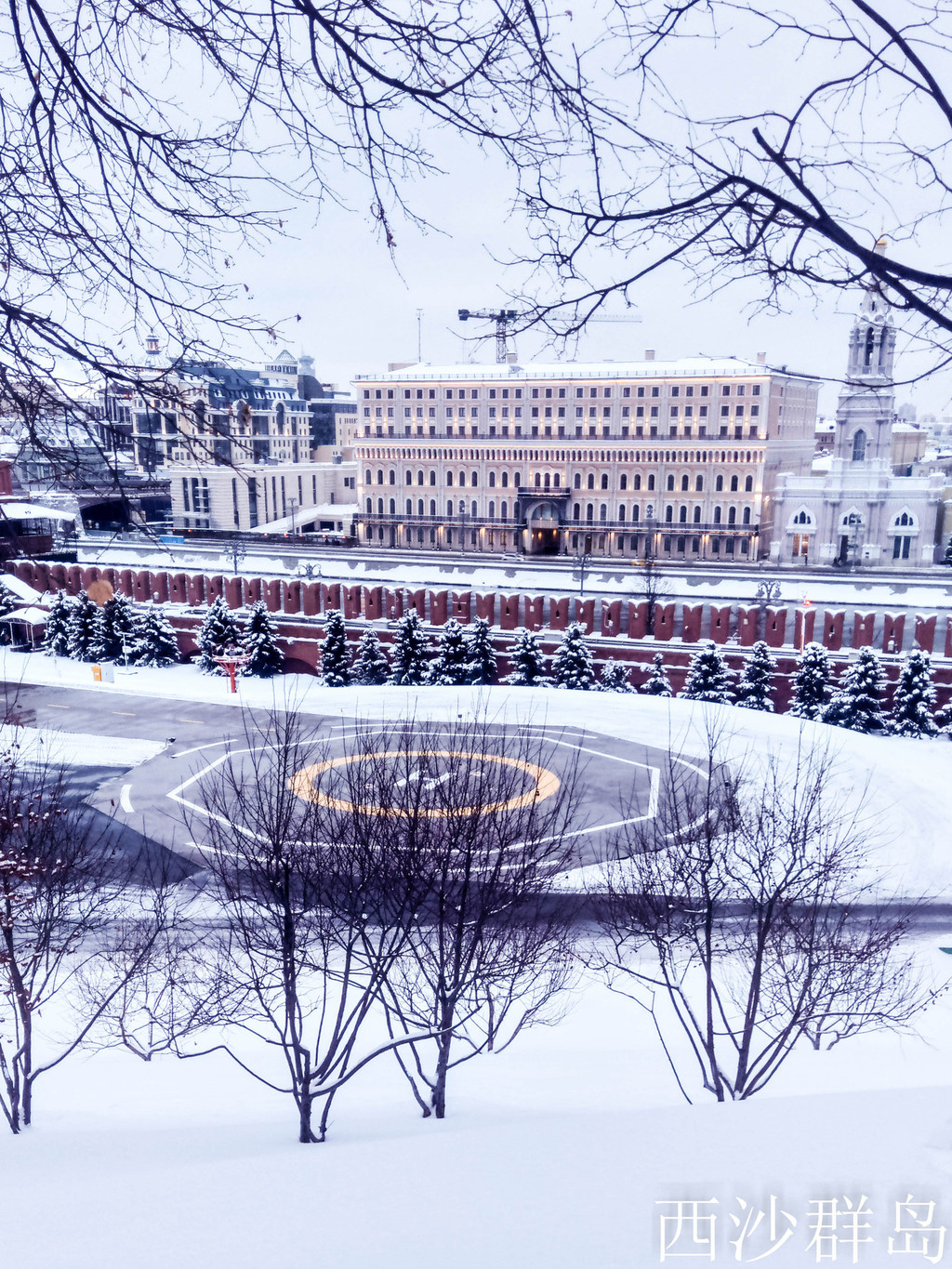 南边的秘塔花园,墙角部位有普京的专用直升飞机坪,直升飞机坪的墙外就是莫斯科河。
