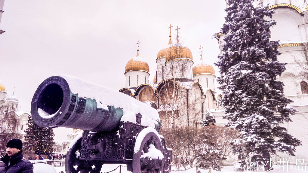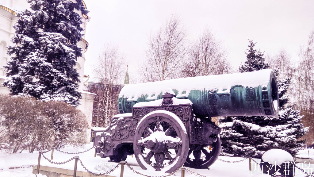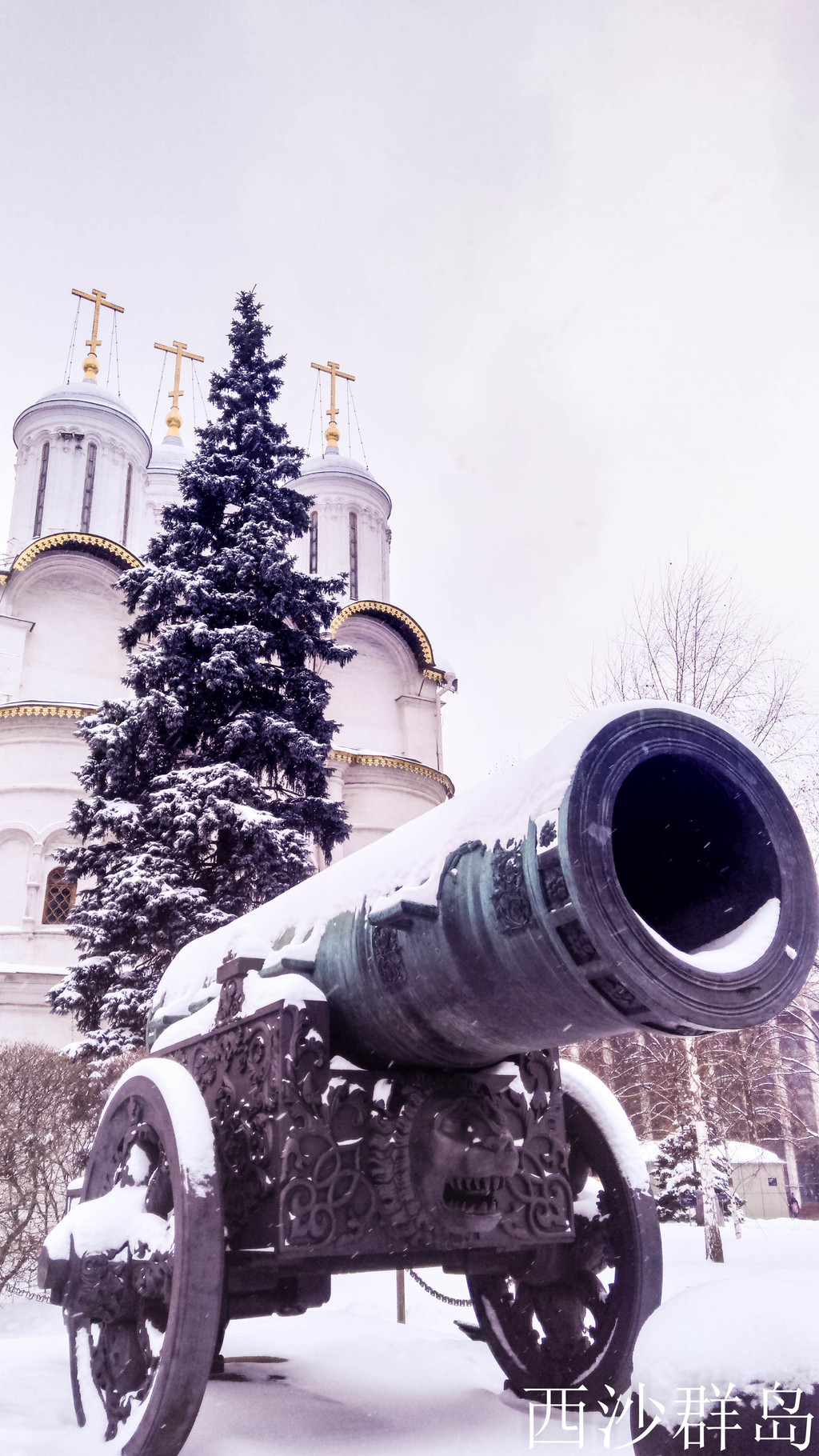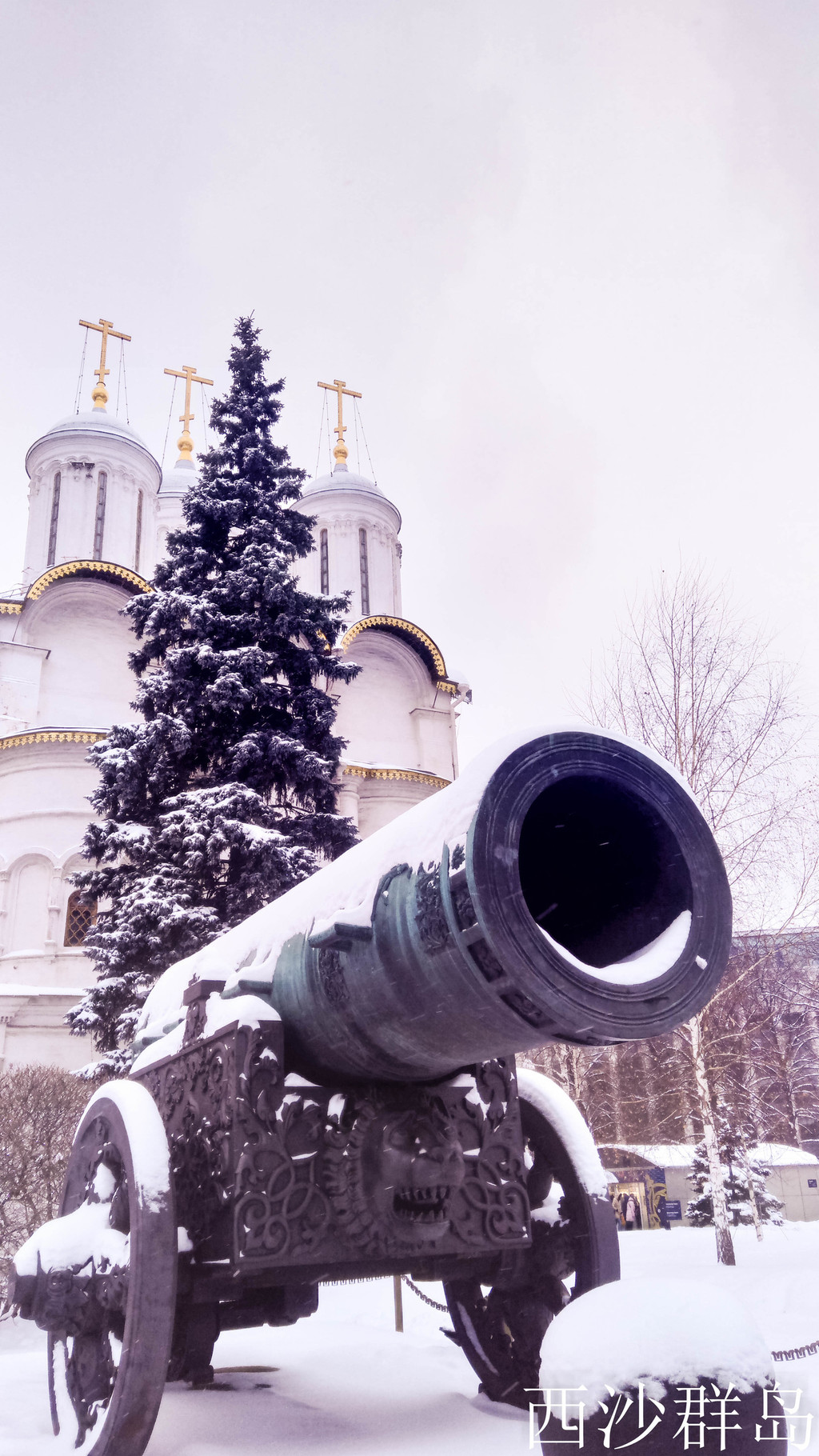 走过克里姆林剧院第一个看见沙皇巨炮,是一座重达39.312吨,长5.34米,口径800毫米,炮筒直径1200毫米的超级大炮。炮王由安德列·乔赫夫设计并于1586年建造。不过此炮从来沒有使用过,每个重达一吨多的四个炮弹也只是摆设,被拿来炫耀军事实力与其技术。