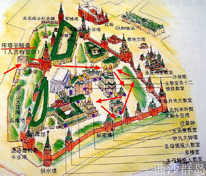 伊凡大帝钟楼-81米高的伊凡大帝钟楼,是克里姆林宫中最高的建筑物,站在此塔上可以俯瞰 莫斯科 方圆25~30公里以内的城市和郊区景色。建于16世纪初叶,原为三层,1600年增至五层,冠以金顶,从第三层往上逐渐变小,外貌呈面棱体层叠状,每棱面的拱形窗口,置有自鸣钟,1532一一1543年,在其北面又建四层立体钟塔楼。1624年夏,用白石修建了菲拉特列特钟塔楼。现在将其下层用做克里姆林宫博物馆,需要单独购票,票价250卢布。