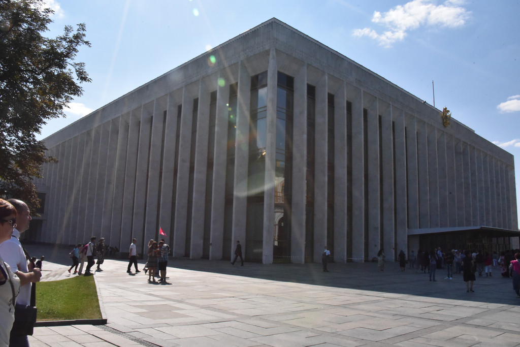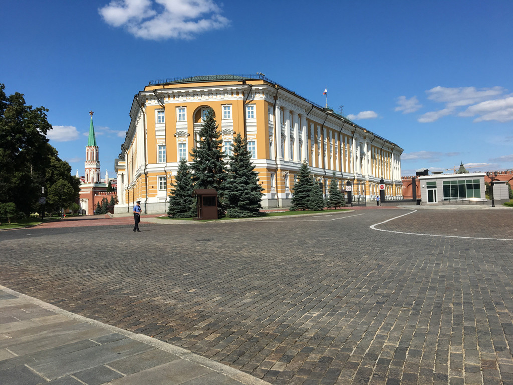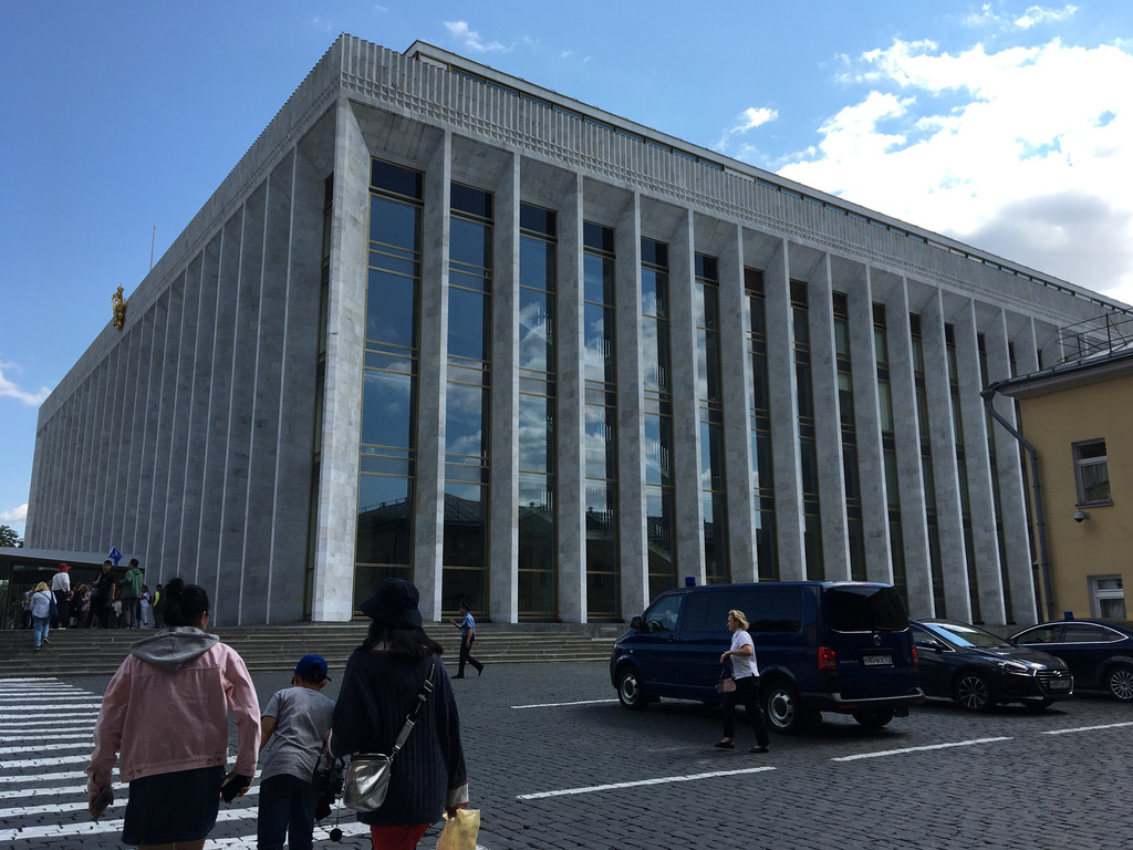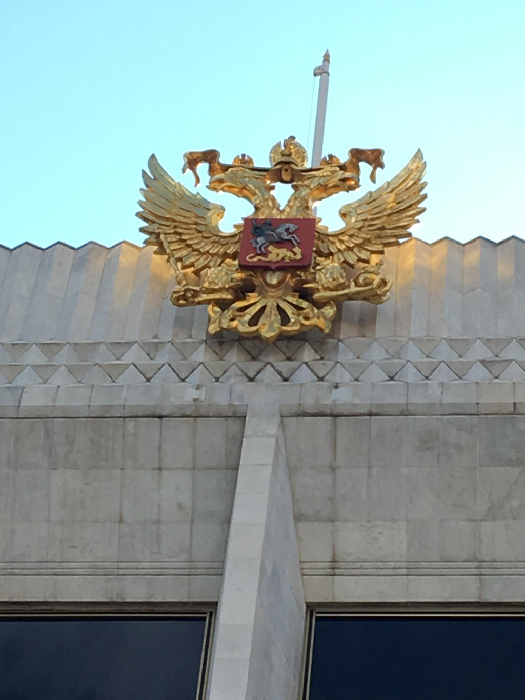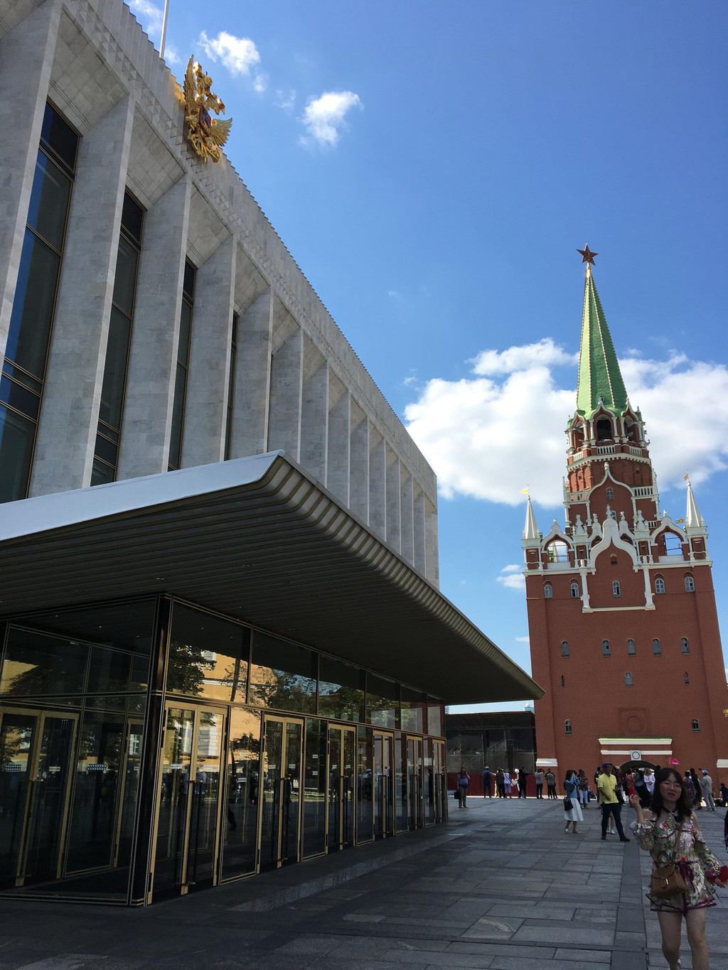 克里姆林宫分几个部分,进入园区右手部分是灰色大理石与玻璃组成的议会大厦,正面有双头鹰标志的俄罗斯国徽(前苏联时期这里曾是红色五角星),