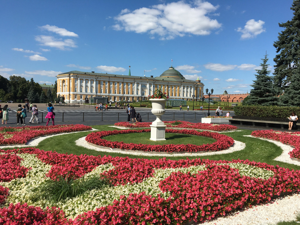 向前走不远来到一个三叉路口,对面一个独立的黄色建筑就是普京总统的工作所在地,隔着宽宽的马路,对面是漂亮的花坛,花坛外是直升机停机坪,这里有地下通道直通普京办公楼,