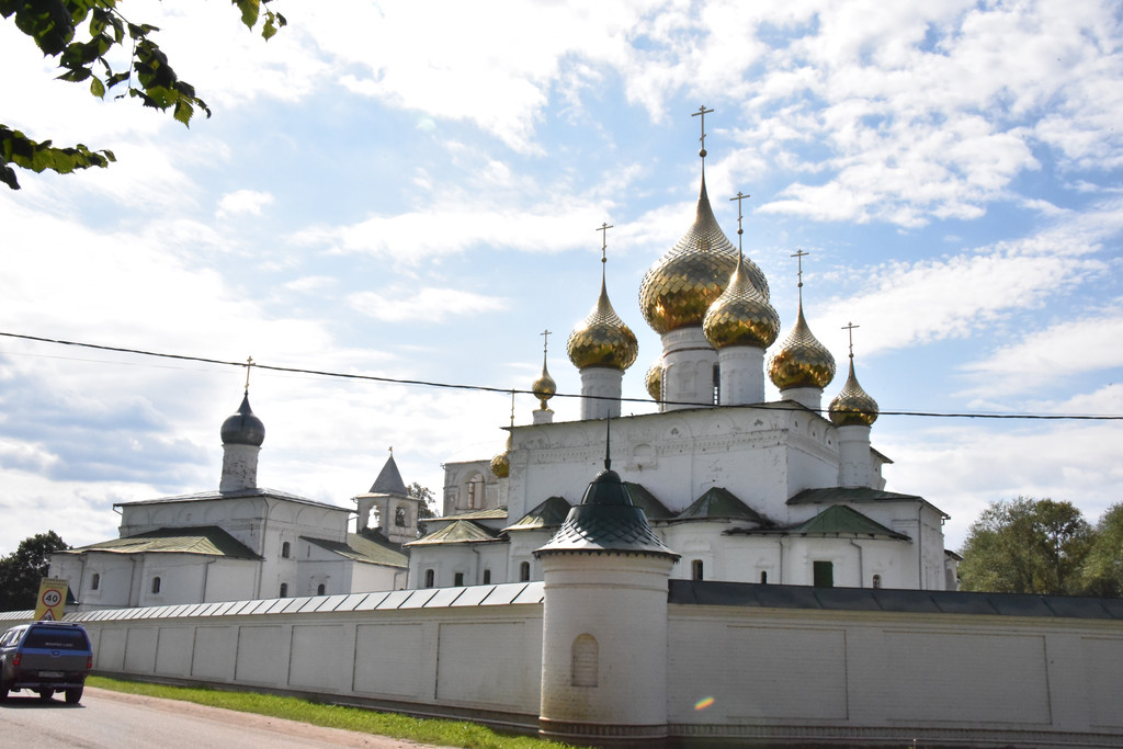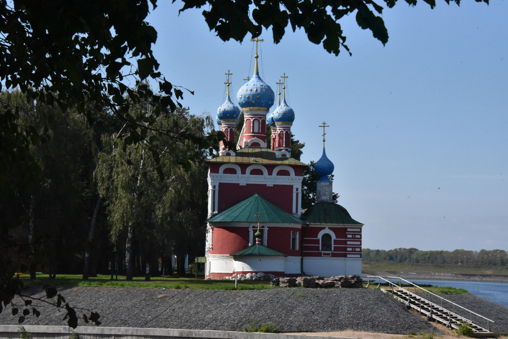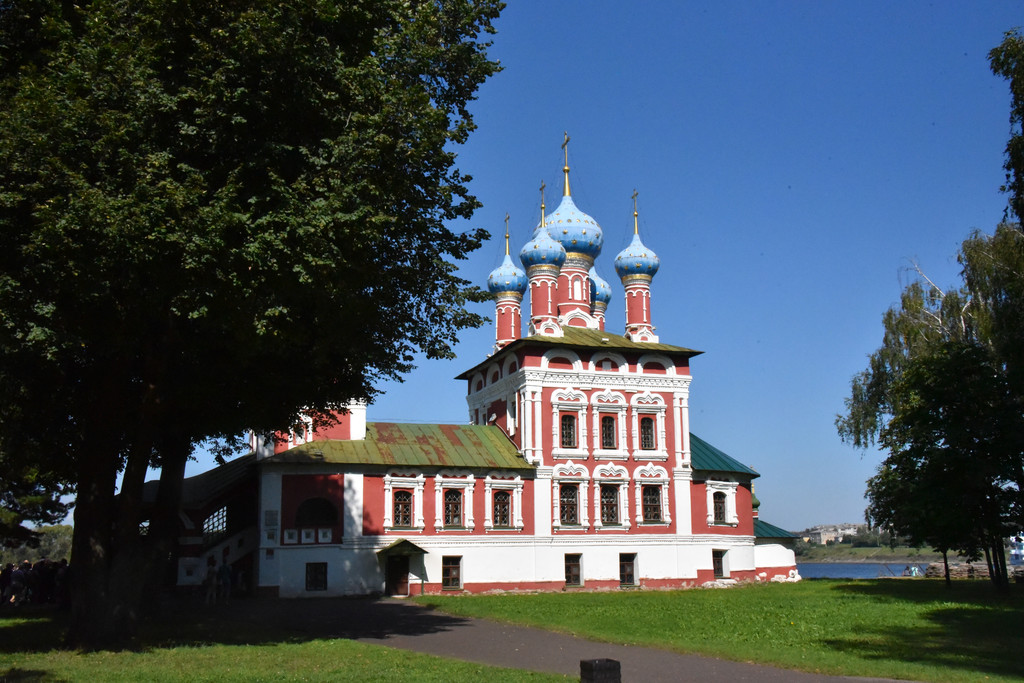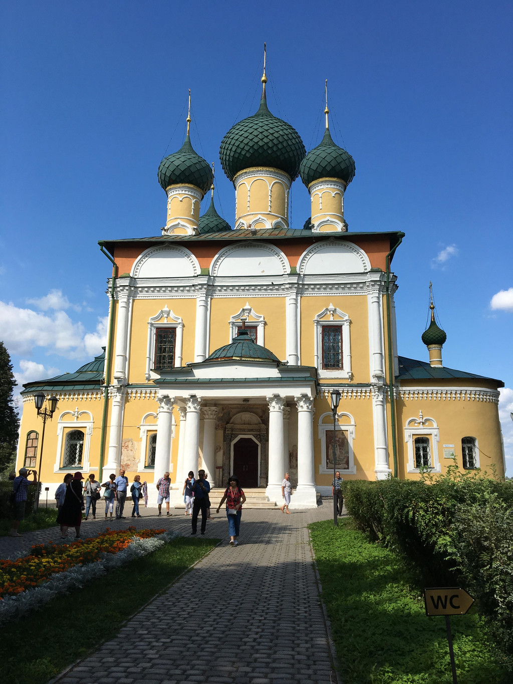 出门前行,到了我们要参观的重点了。乌格里奇是一座始建于公元937年的古城,俄罗斯历史上经历了两个沙皇王朝,留里克王朝和罗曼诺夫王朝,留里克王朝要追溯到公元862年,瓦良格首领留里克奥列格大公被邀请到这里管理和统治,开始了留里克王朝,这个王朝从862年创立到1598年结束共经历的736年,这其中包括了被蒙古金帐汗国(成吉思汗的后代)统治的240年,1480年,伊凡三世击败了蒙古人,使俄罗斯获得独立,伊凡四世伊凡雷帝1547年继承了王位并自称沙皇,这就是俄罗斯史上首位沙皇,死后将王位传给长子费多尔(在此之前死去的王子不算),这里距莫斯科不远,伊凡雷帝家族当时就住在乌格里奇,1591年,伊凡雷帝的小儿子德米特里王子在此地离奇死亡,七年后(1598年)德米特里的哥哥费多尔沙皇去世,因他没有子嗣,唯一有继承权的弟弟也先他而去,只能推举外戚继任沙皇,留里克王朝就此结束,开始了俄罗斯史上的大动乱时期(1598-1613)。有关德米特里王子死亡的原因有几个猜测,有说被刺杀,有说因癫痫发作不幸用匕首刺破了喉咙,德米特里身亡时年仅八岁,为纪念此事18世纪在沙皇家族当时居住的王宫对面建立了一座教堂-滴血教堂(俄罗斯共有三座滴血教堂,另外两座分别在圣彼得堡和叶琳堡),