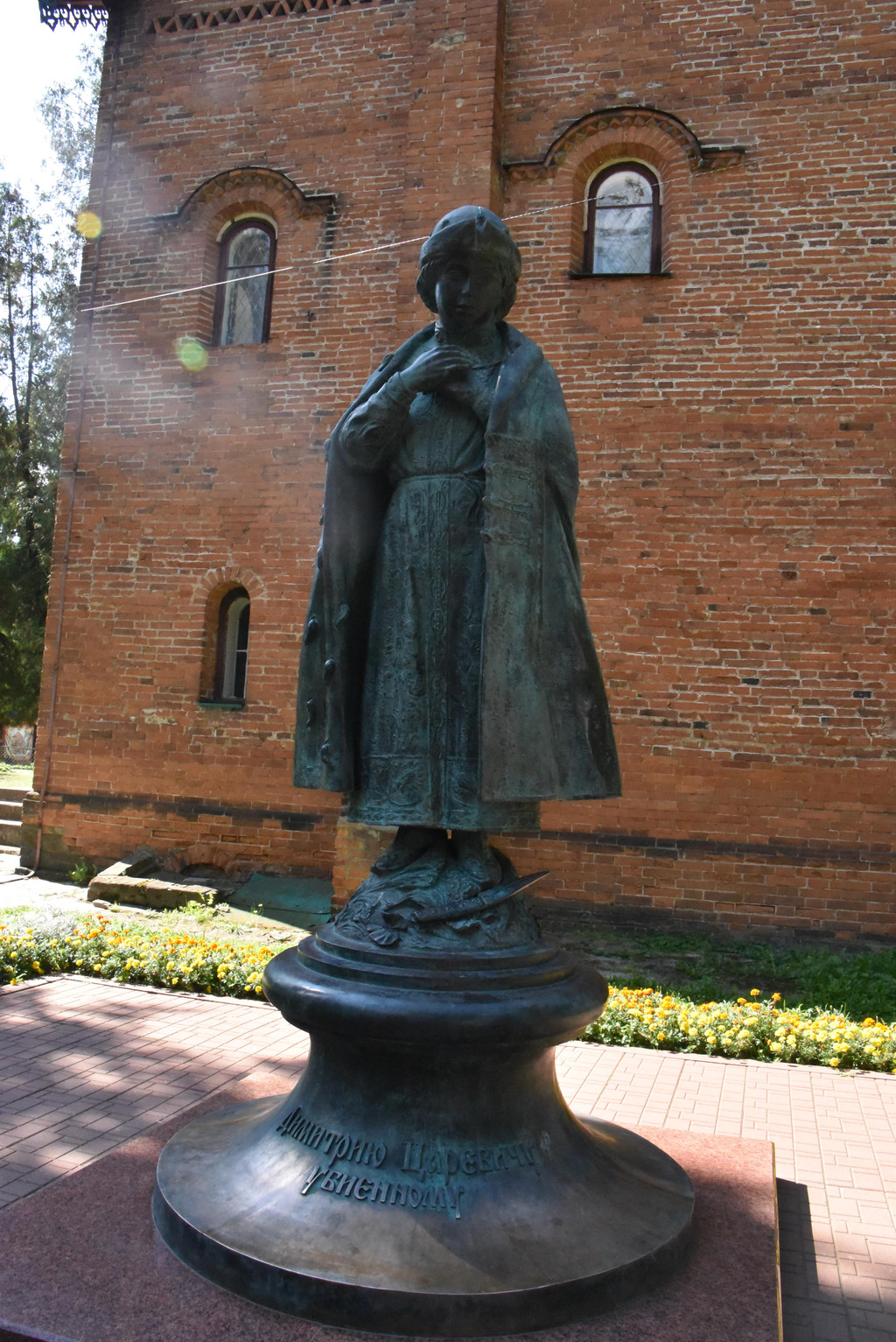 宫殿外墙立着一座铜像,德米特里小王子,在他的脚下放着一把匕首,提示人们他的非正常死亡。