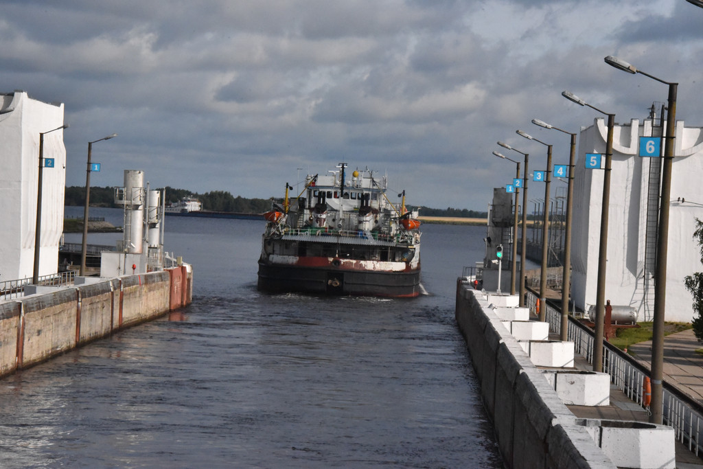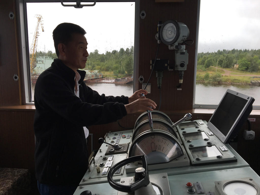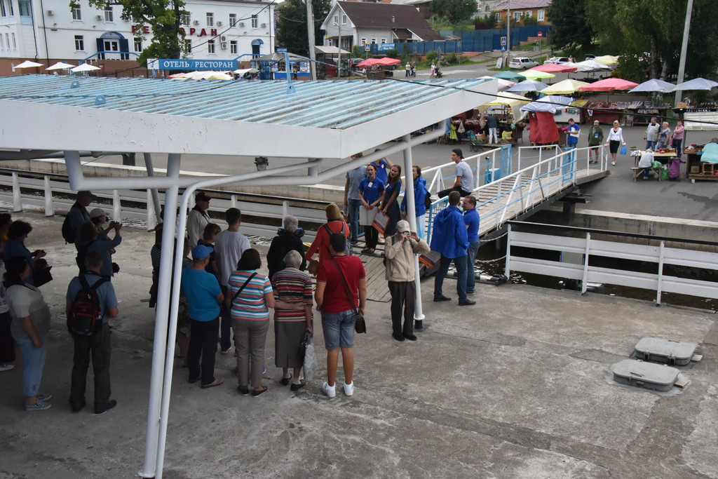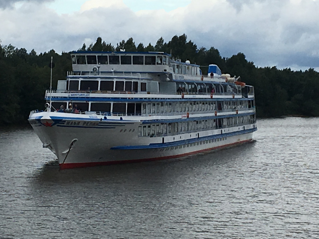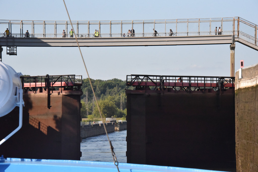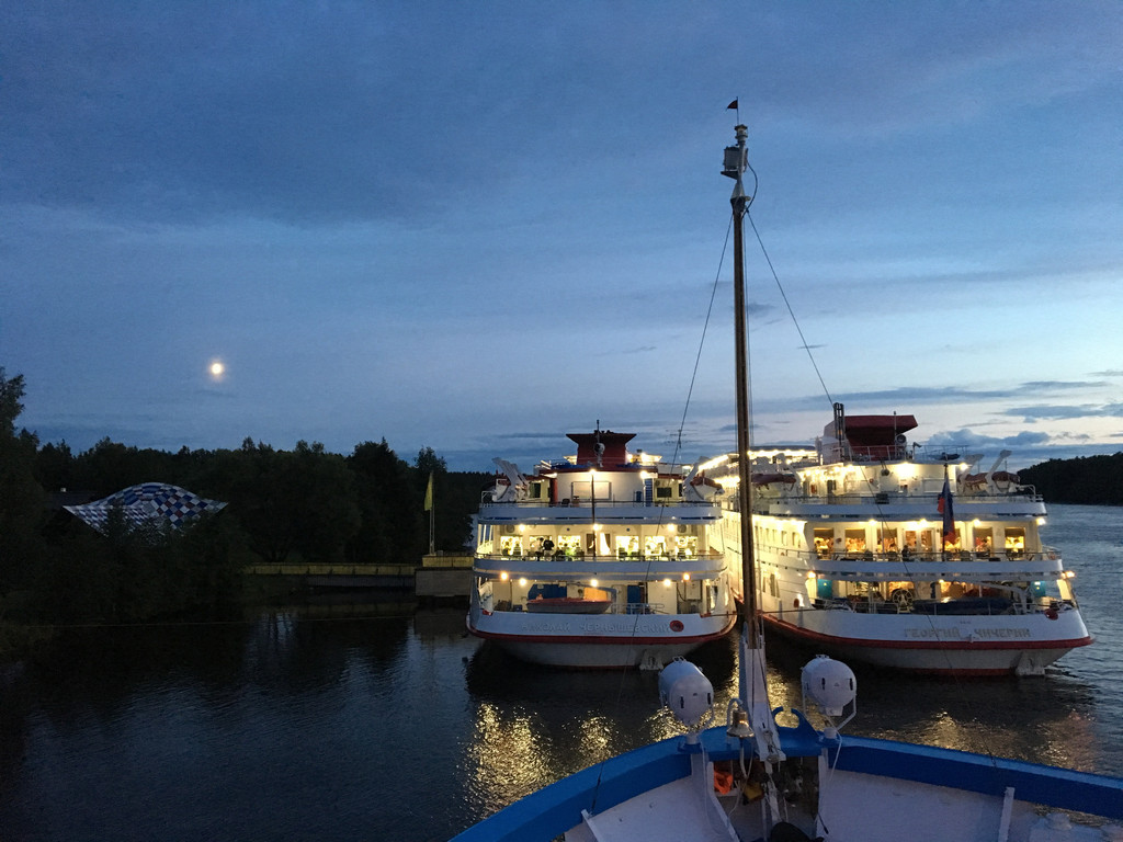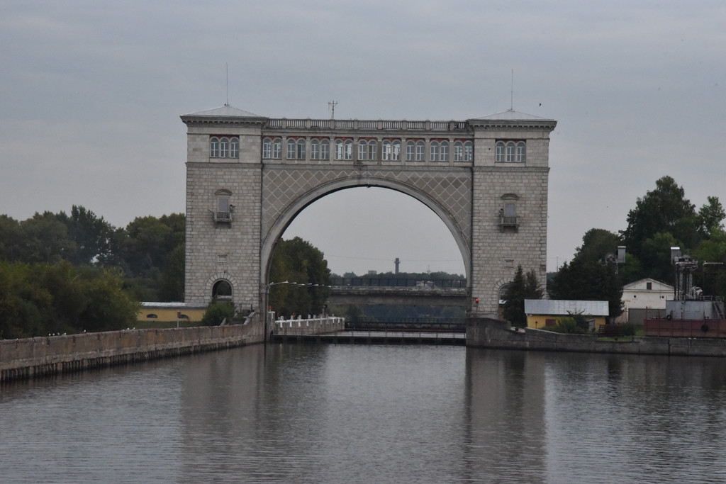 过水闸了,伏尔加河从莫斯科到圣彼得堡之间大约要走17道船闸,我们是从上游向下游行进,河水水位逐渐降低,船进入船闸区,前方和后方都有闸门关闭,前闸逐渐放水,眼看着船身下降,当与下游水位平齐,前面闸门打开,船从闸区开出,这个过程比较缓慢,对我们最大的影响就是WiFi没有了信号。