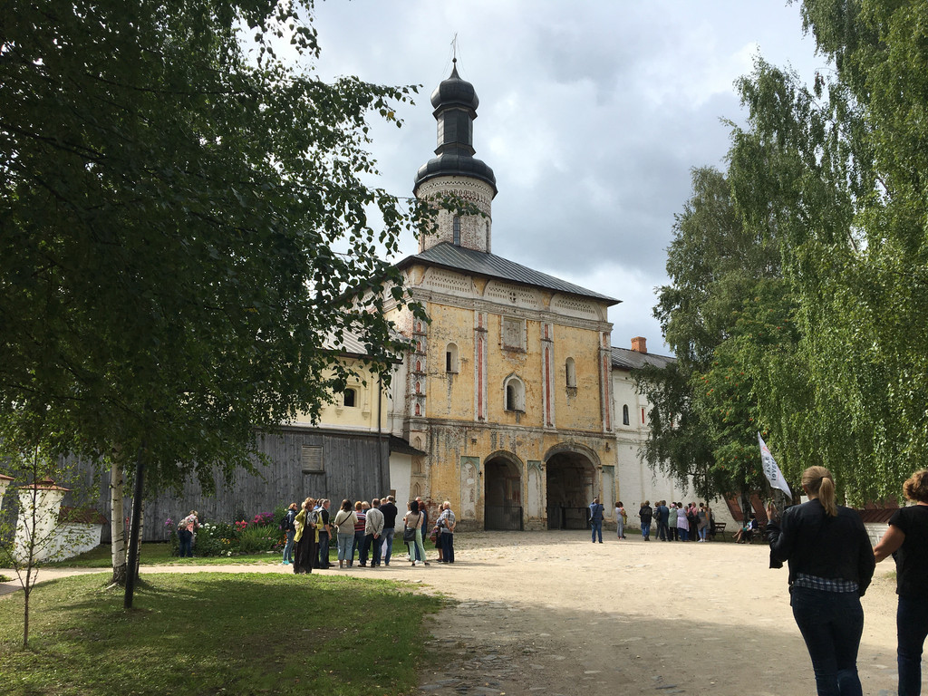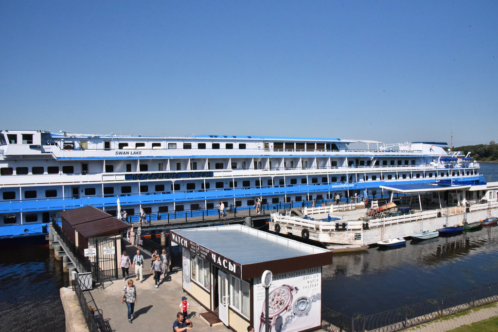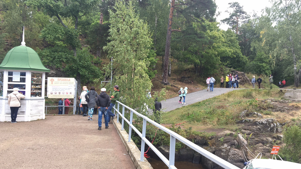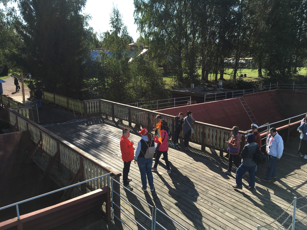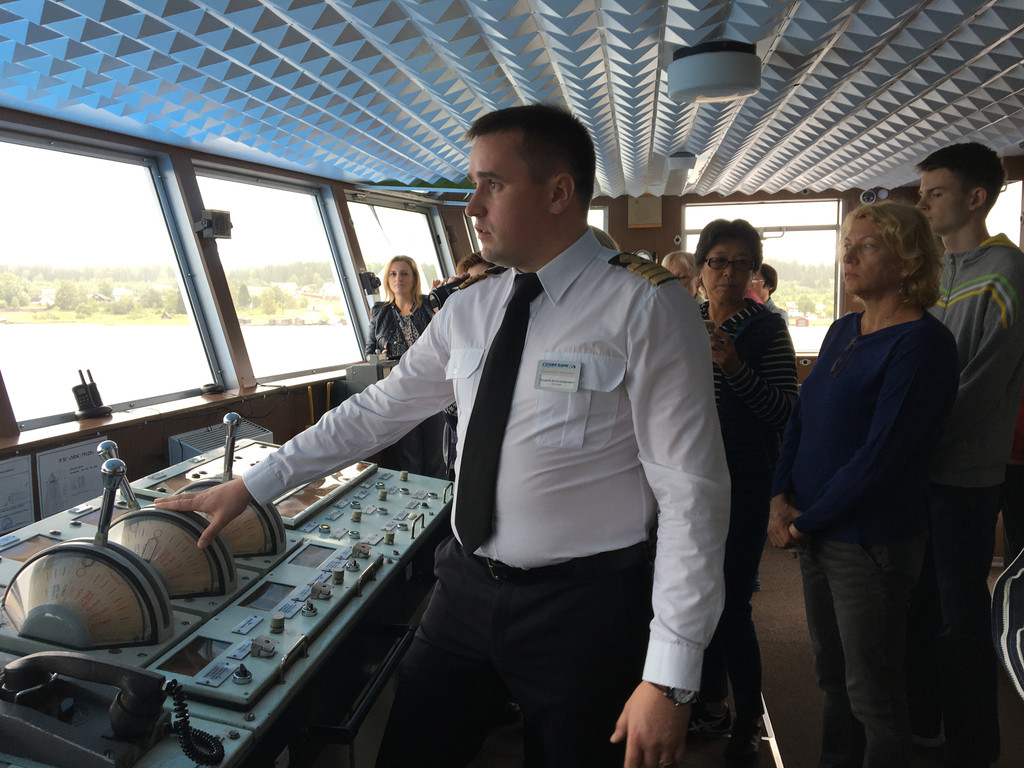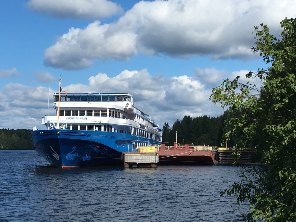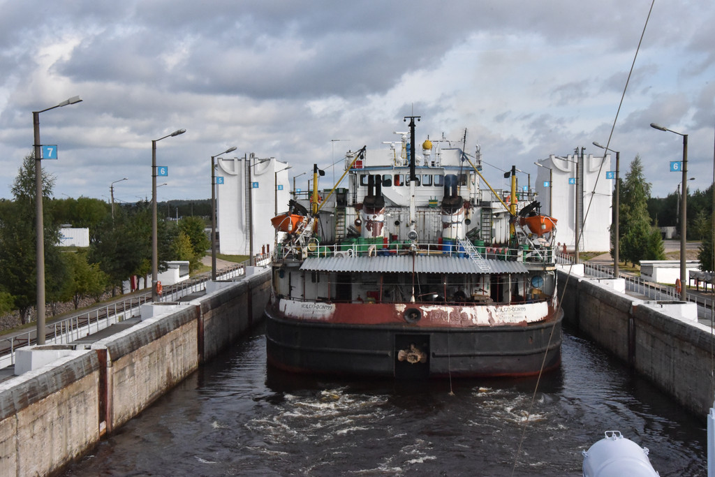 过水闸了,伏尔加河从莫斯科到圣彼得堡之间大约要走17道船闸,我们是从上游向下游行进,河水水位逐渐降低,船进入船闸区,前方和后方都有闸门关闭,前闸逐渐放水,眼看着船身下降,当与下游水位平齐,前面闸门打开,船从闸区开出,这个过程比较缓慢,对我们最大的影响就是WiFi没有了信号。