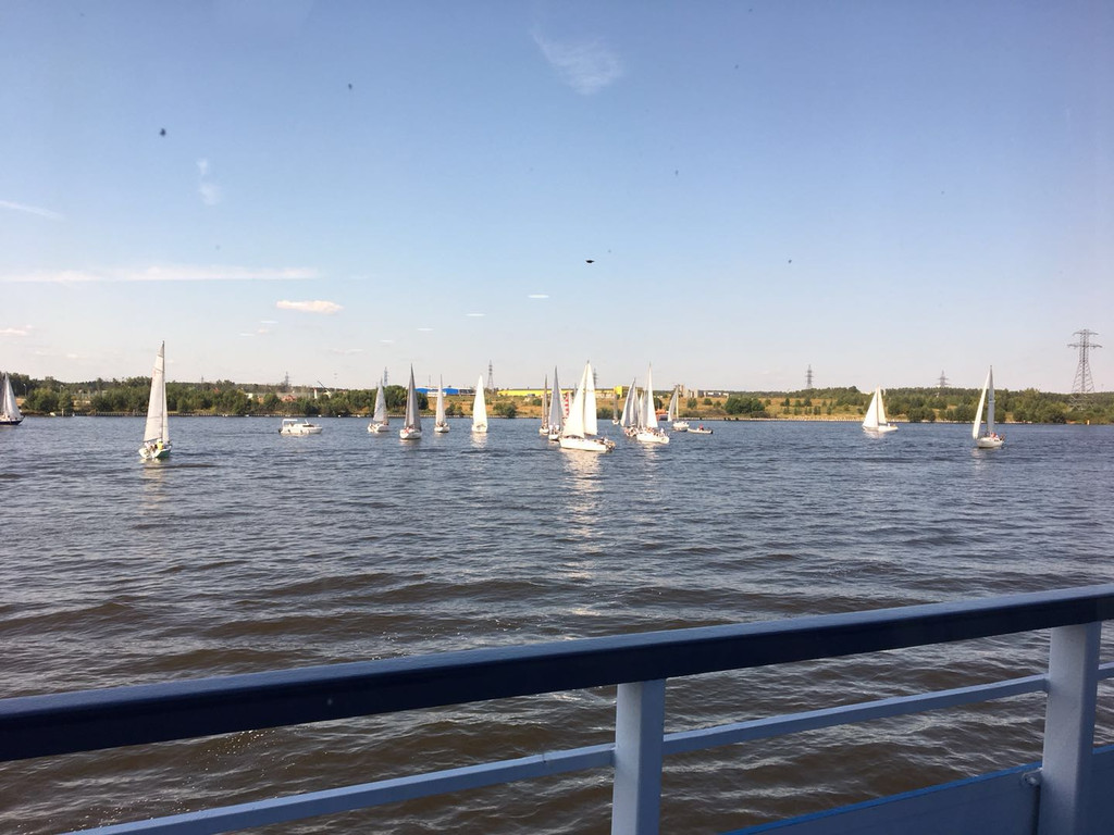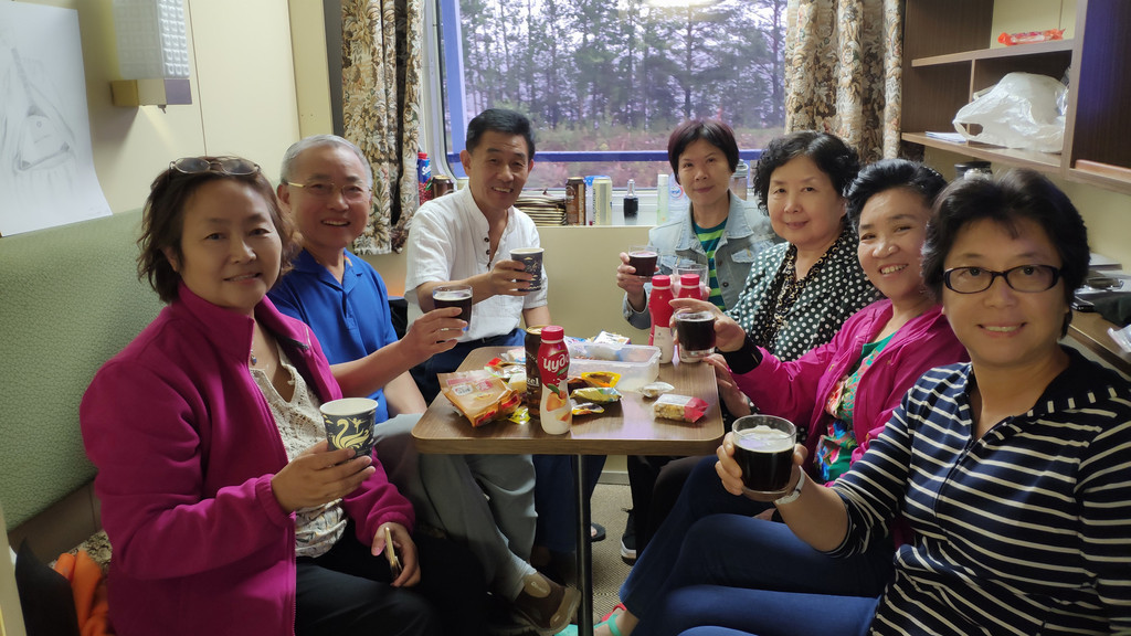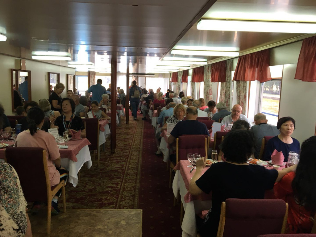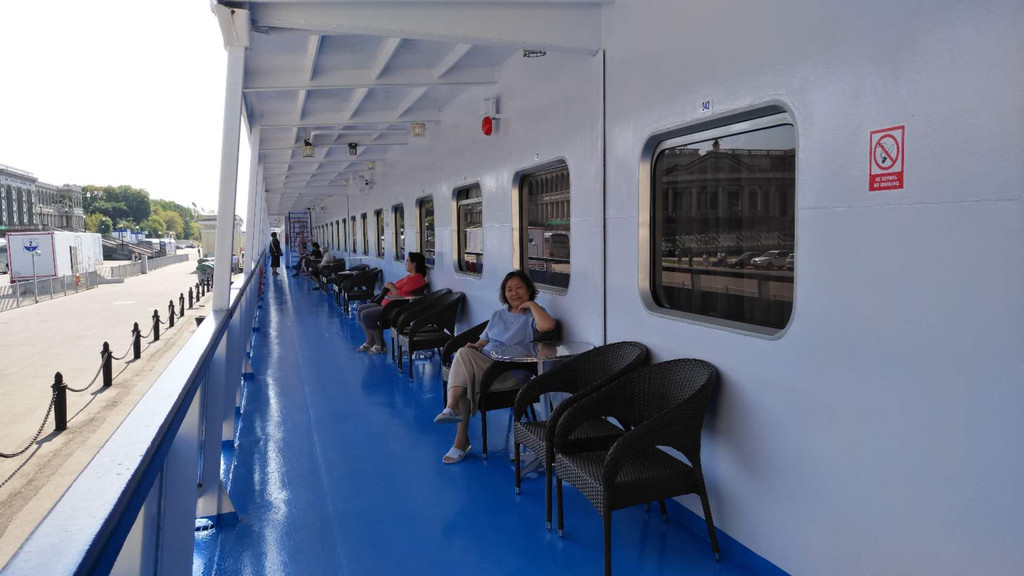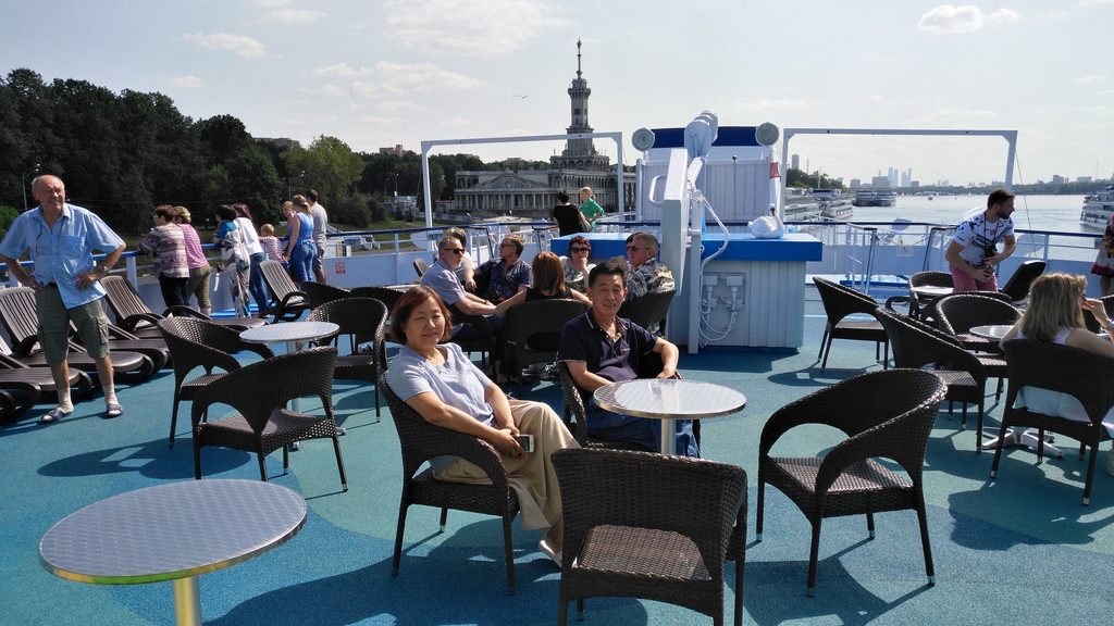 吃着西餐看着窗外,今天是周末,现在行走的正是莫斯科郊外(只是还没到晚巴晌儿),岸边多是休息的人群,或钓鱼,或野餐,或晒老阳儿,一派轻松欢快的景象。