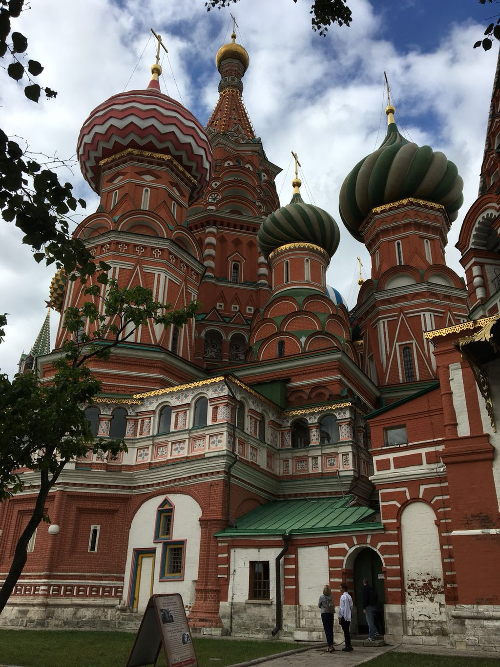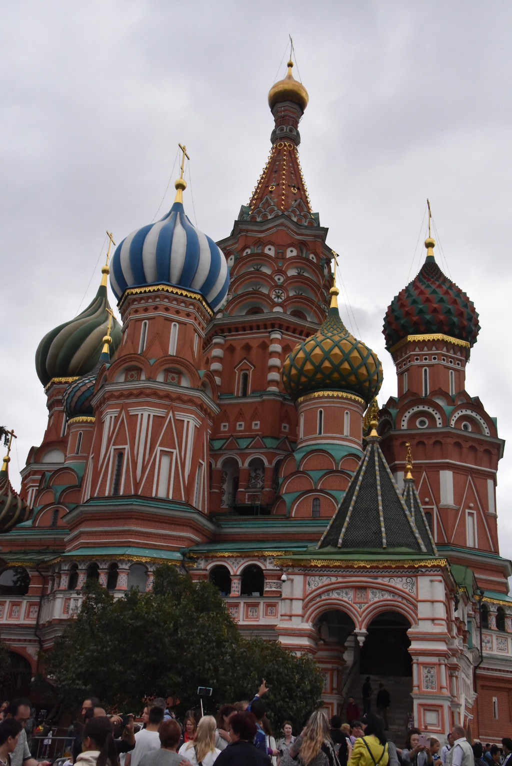 教堂要买票进入,门口排着大队,我们可没有时间,教堂顶部由八个高低不同的球形圆顶和一个方尖顶组成,错落有致,色彩协调,围着教堂找着各种角度拍照,从哪个角度拍教堂都非常漂亮,