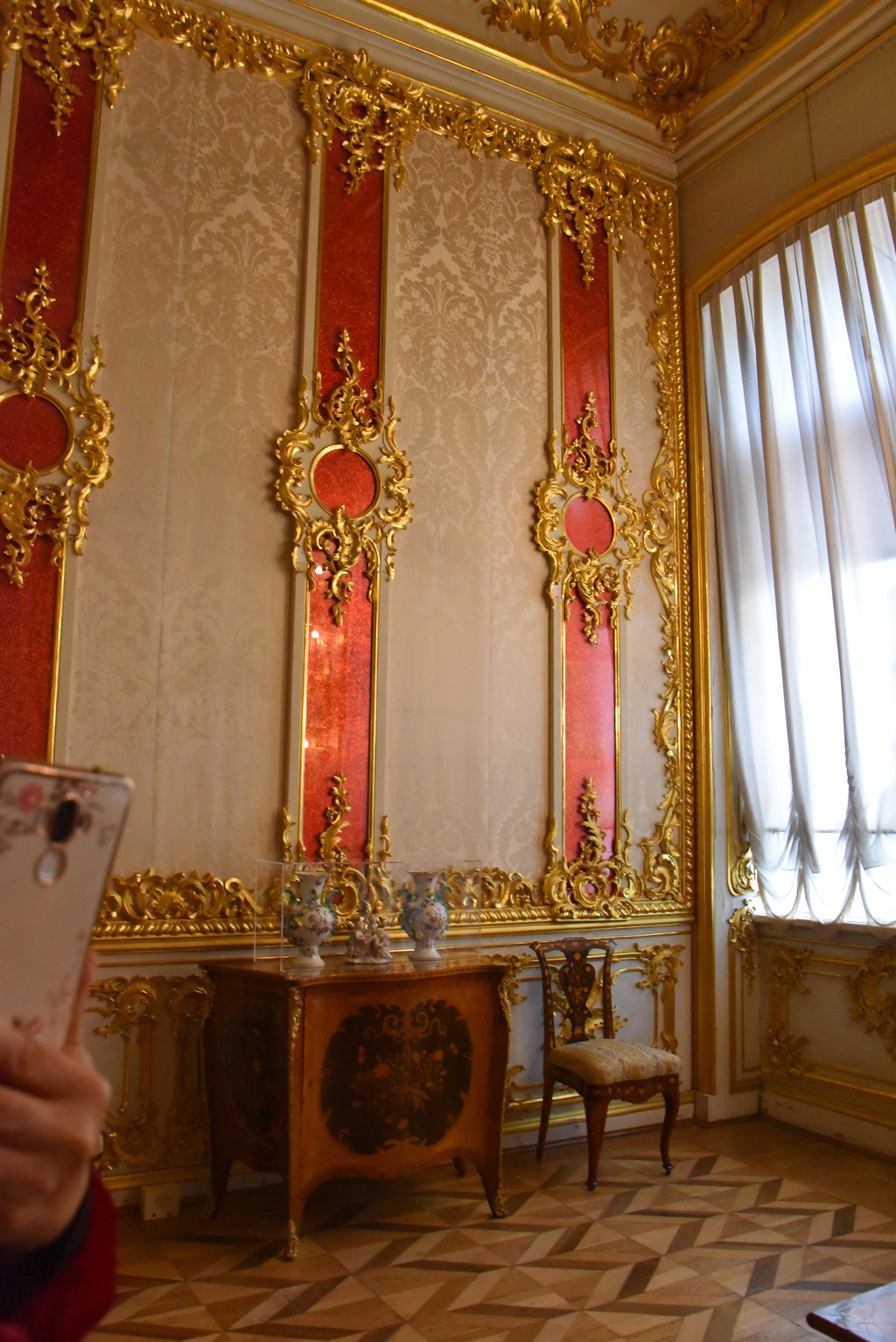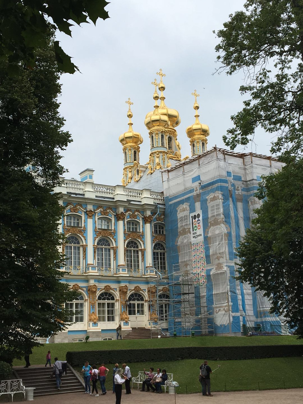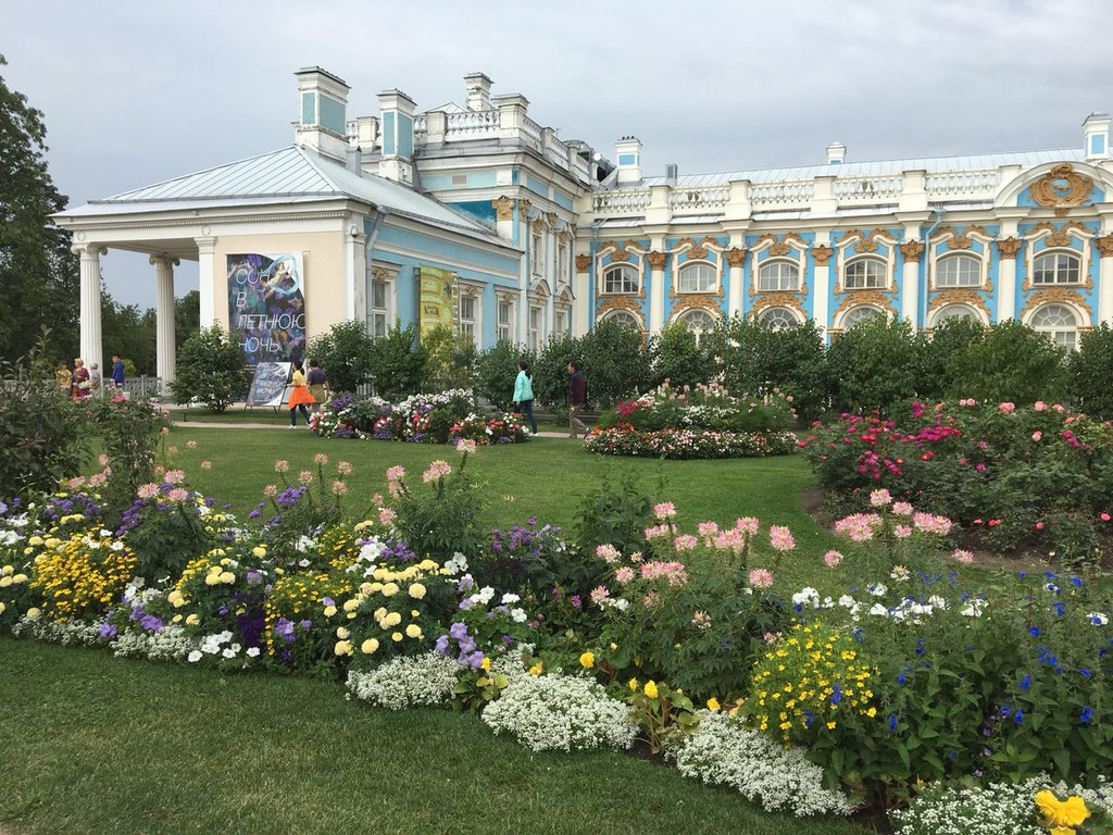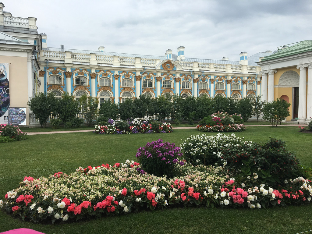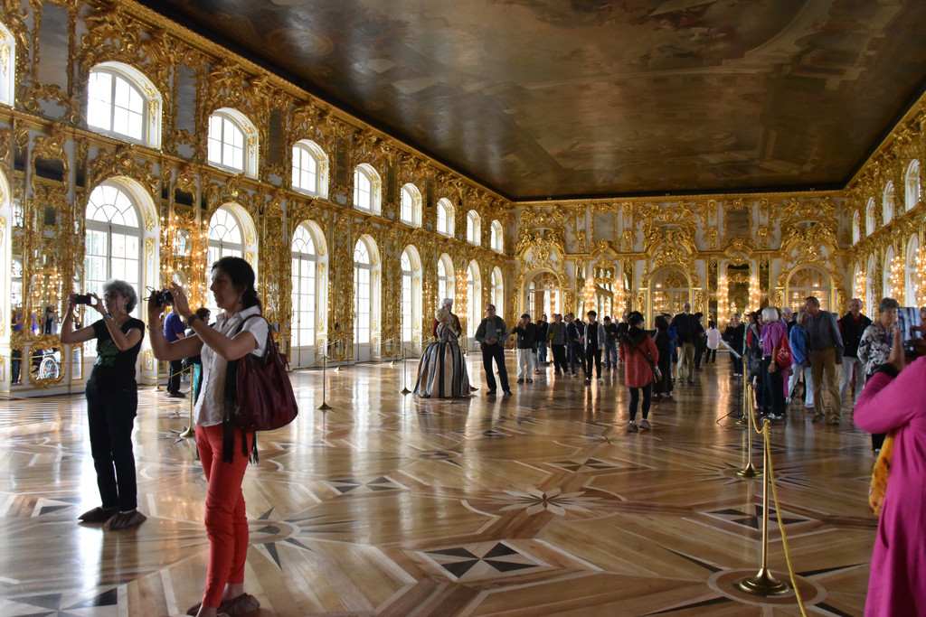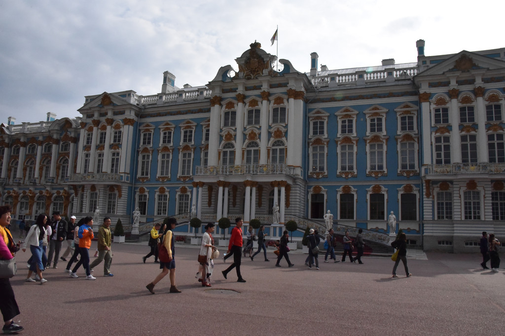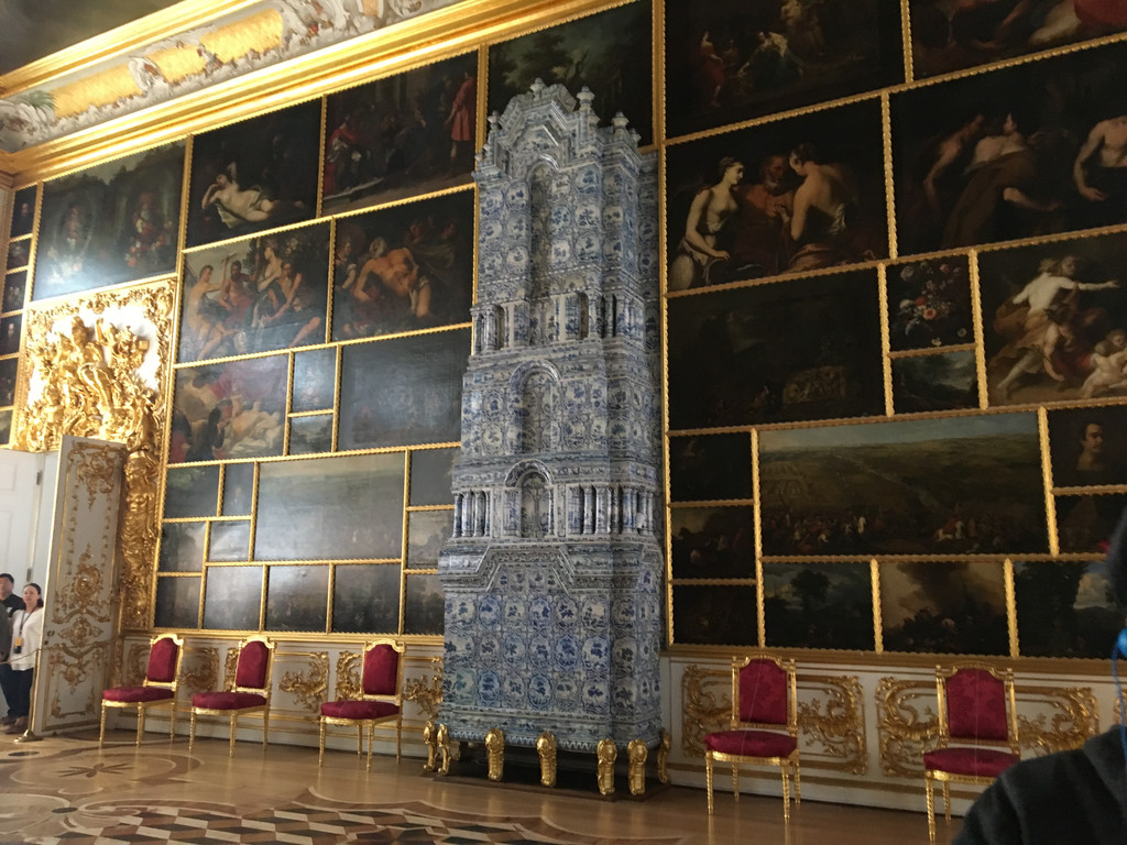 今天要去普希金小镇(过去称为皇村)参观叶卡捷琳娜宫殿,俄国经历有两个王朝,留里克王朝(862-1598)和罗曼诺夫王朝(1613-1917),两个王朝之间的15年史称大动乱时期。罗曼诺夫王朝的303年中有17位沙皇其中包括4名女沙皇执政。1710年,第四位沙皇彼得一世(彼得大帝)迎娶了叶卡捷琳娜为皇后,建造了一座具有俄罗斯特色的小型木制宫殿,作为新婚礼物送给叶卡捷琳娜,称叶卡捷琳娜宫或凯瑟琳宫,彼得去世后,因他剩下的唯一的儿子已在他去世前意欲发动政变事发被处死,他的皇后自然接替他继承了王位,既叶卡捷琳娜一世女沙皇,三年后死去,接着十几年经历了三代沙皇的更替,时间来到第九位沙皇伊丽莎白彼得罗芙娜时代(1741-1762),她是彼得大帝最小的女儿,少年和青年时期曾在欧洲学习,除了学习技术还建立了很好的关系网,她决定将父亲原来的那座新婚礼物宫殿推倒重建,特别邀请了欧洲好友拉斯特莱利以巴洛克方式重新设计,五个宫殿分期施工,其中最著名的就是一间琥珀屋,话说当年彼得大帝1715年巡查海军舰队时顺便转了个弯去了普鲁士,普鲁士国王威廉一世认定俄国将会成为将来的海上霸主,于是讨好彼得大帝将一座用琥珀做成的房屋拆卸成13块墙板送给彼得,作为回礼,彼得送给普鲁士55个身高两米的战士、巨型烛台以及彼得自己雕刻的宗教礼品。墙板送到彼得堡时彼得大帝正忙于海战和推动西化,这13块琥珀墙板一直没有使用,直到伊丽莎白建立宫殿时有人建言可以用琥珀板装饰一间房间,伊丽莎白将其当做书房使用,到叶卡捷琳娜二世时又将它重新设计作为卧室(为叶卡捷琳娜宫的设计扩建立下汗马功劳),二战期间德军进攻普希金市在此围攻900天,攻入叶卡捷琳娜宫,抢走了所有能搬动的东西,也抢走了这些嵌在墙上的琥珀墙板,他们认为这是当时他们老祖宗的东西,拿走是应该的,德国抢走后还做过两次公开展出,二战后没有了信息。战后俄国利用德国的战争赔款,重建琥珀屋,在加里宁格勒附近开采出大量琥珀原料,用了24年时间修复,2003年圣彼得堡市建市300年时终于修复成功,修复的琥珀屋55平米,装饰线上层为较大块蜜蜡板,镜框和画框用血珀或蜜蜡勾边,里面的图案是用不同色的琥珀拼成的画作。墙壁镶嵌着小块的色泽不一的金珀、蜜蜡片加上上面金色装饰,显得整个房间既富丽堂皇又与众不同。普京出席庆祝会时曾说如果在俄罗斯再发生人类毁灭性战争,琥珀屋将不复存在。叶宫的参观方式是佩戴电子讲解器,宫殿可以说就是一座艺术品收藏馆,