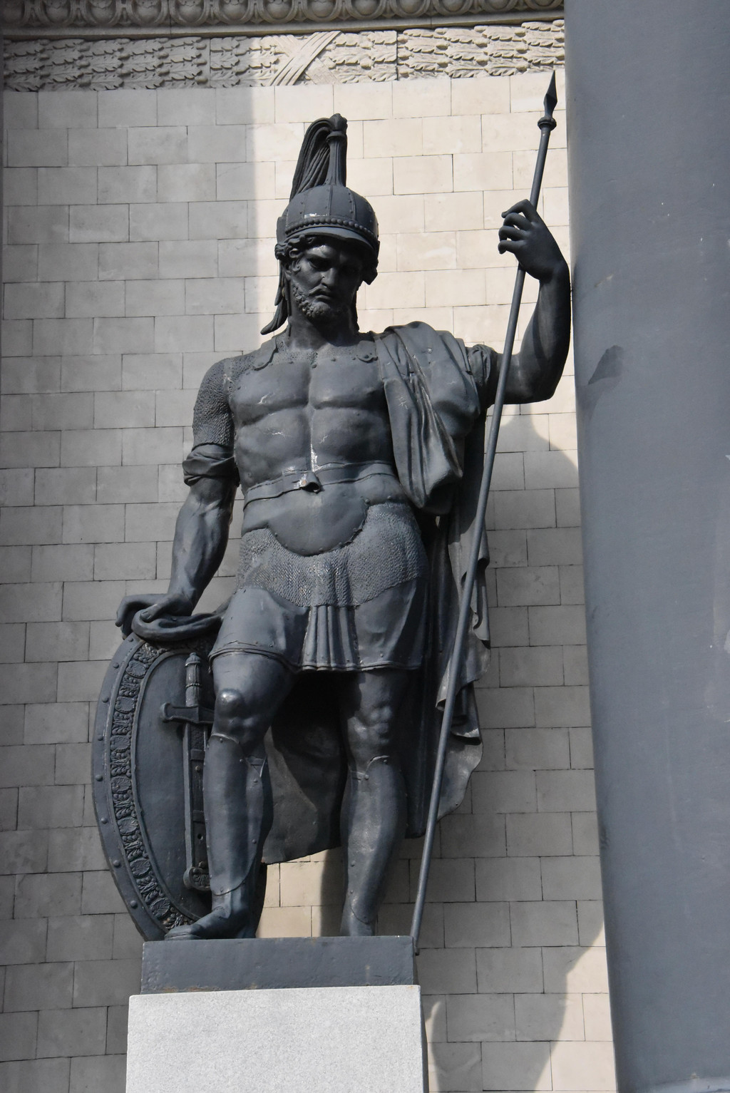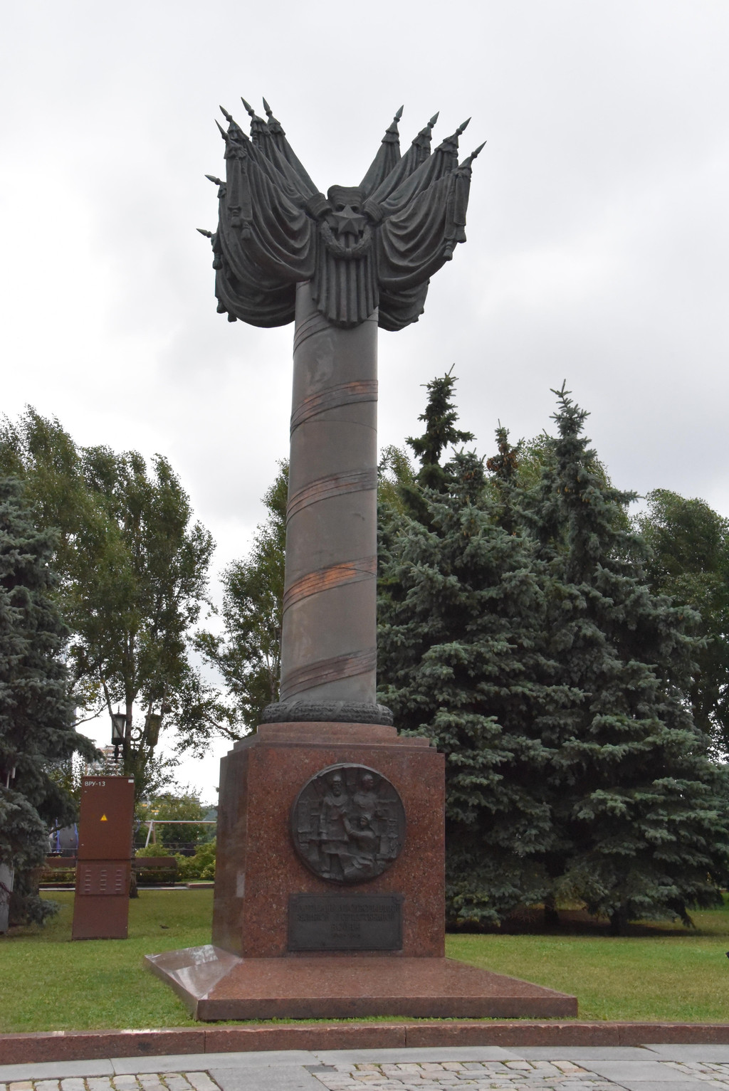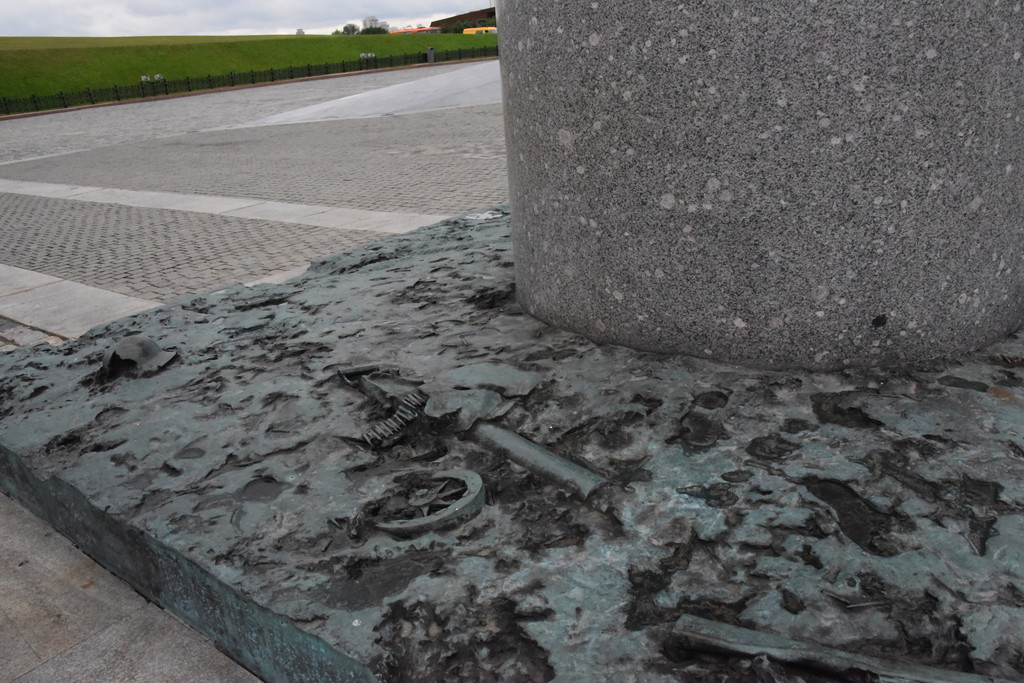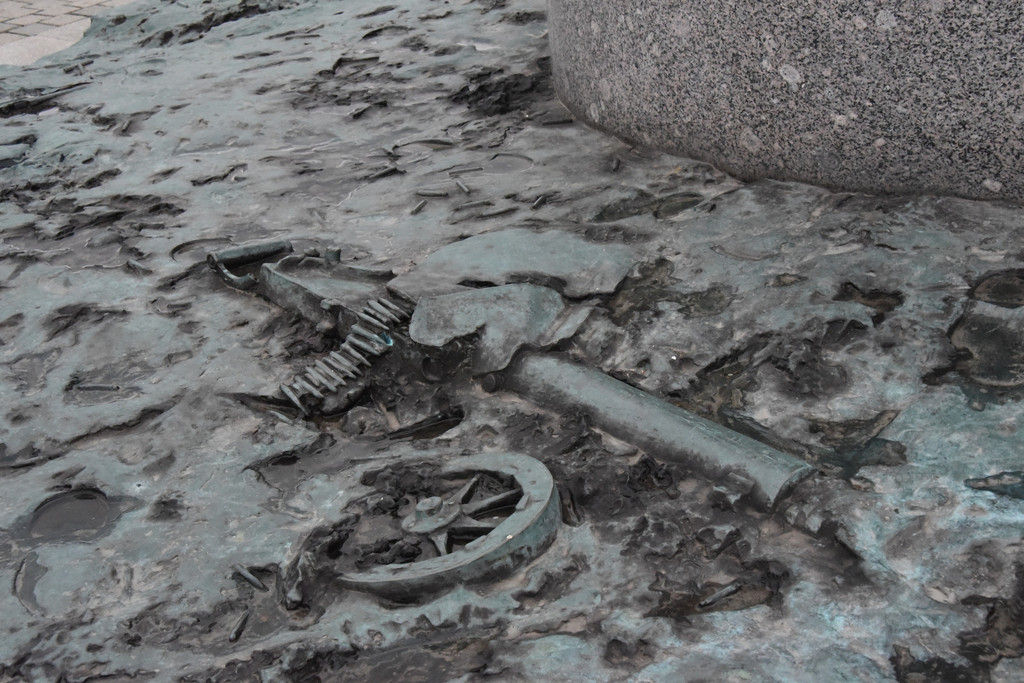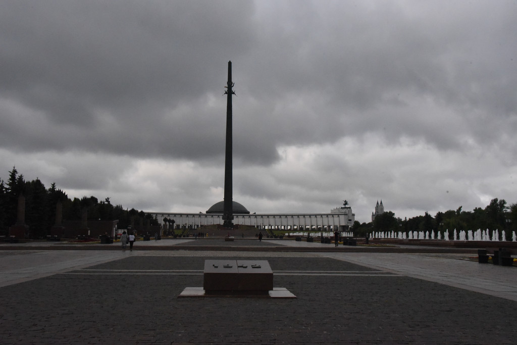 从凯旋门这条街道走过一个地下通道,距此不远就是二战胜利广场,因为时间太早空旷无人,在广场的左侧首先是一座红军战士的雕像,基座也是雕像的一部分,上面雕刻着散落着武器、弹壳、破碎的钢盔,一幅战争惨烈的景象,
