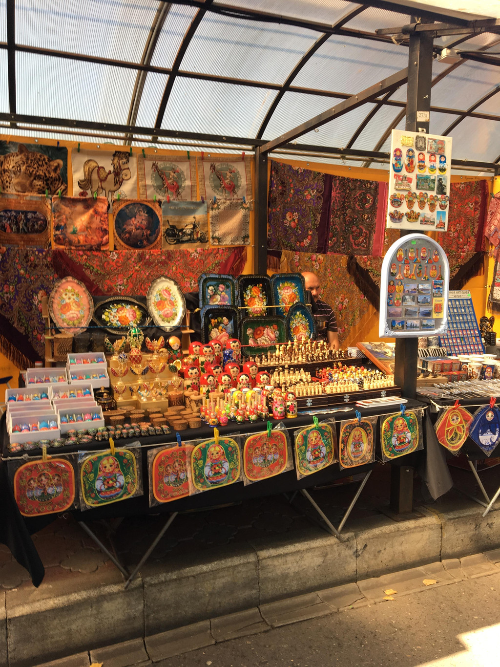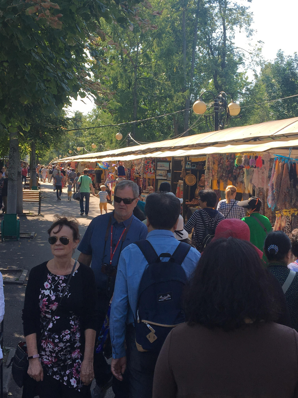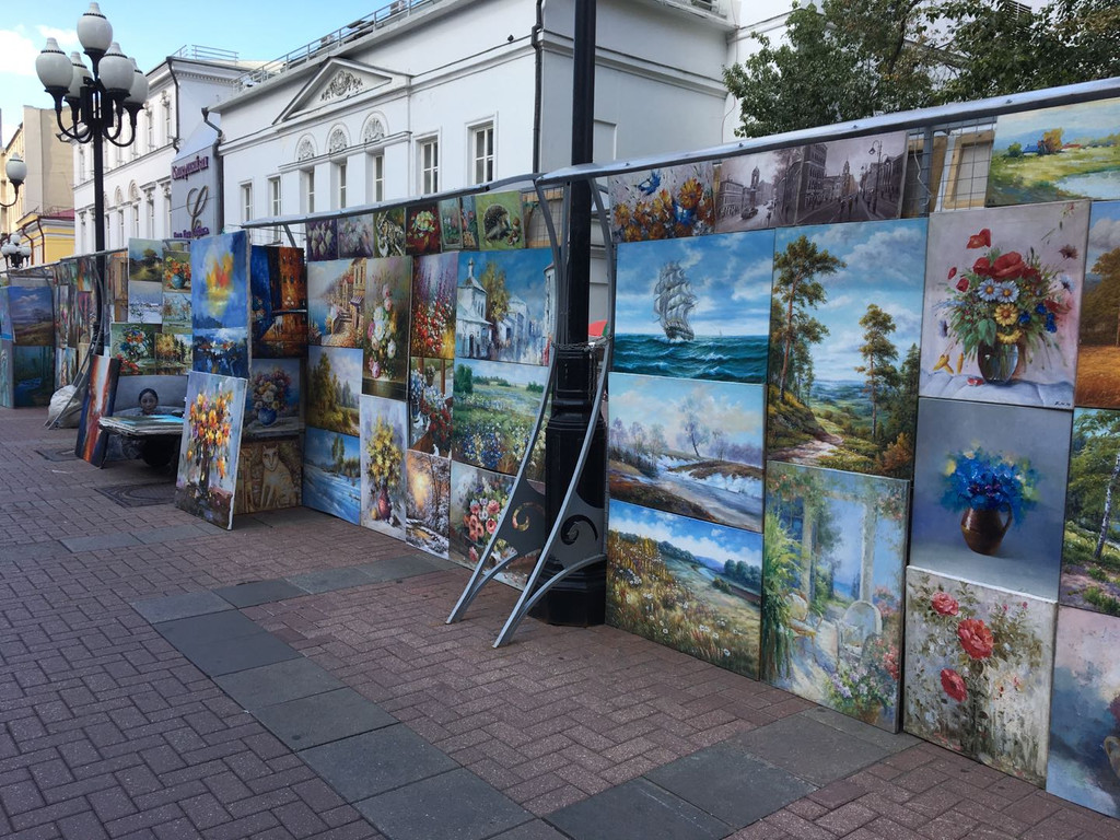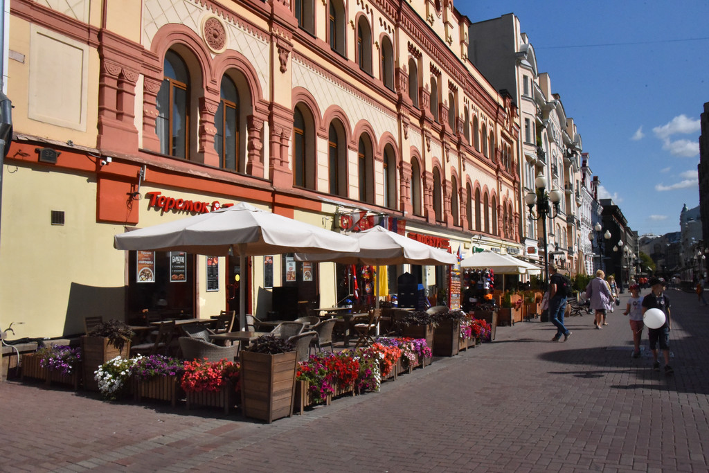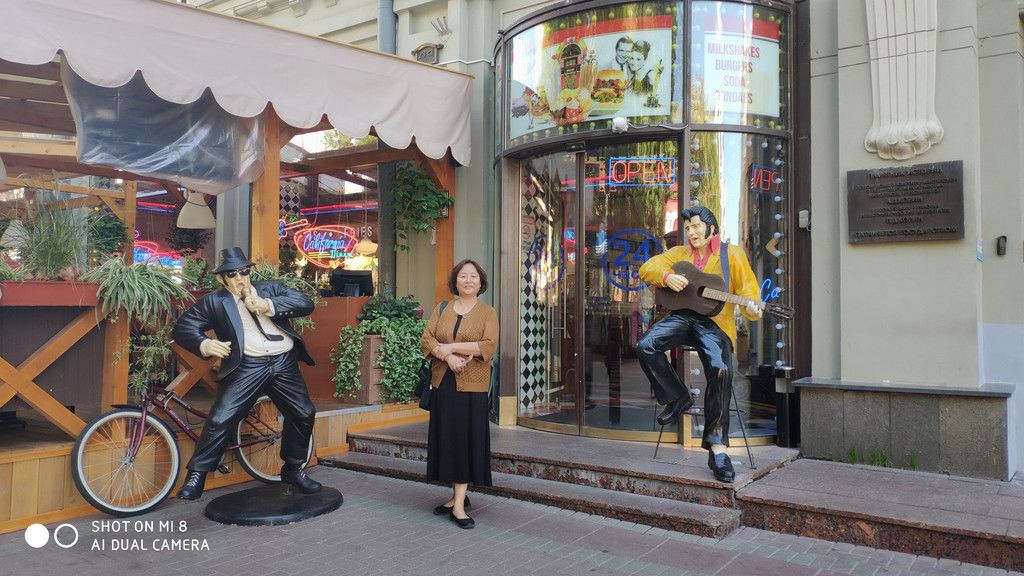 老阿尔巴特大街是一条文化风情街,沙俄时期这里是贵族和知名人士居住的地方,这里是通往克里姆林宫的必经之路,出身贵族的普希金家族、大文豪托尔斯泰、第一位宇宙飞船驾驶员加加林都曾在这里居住,现在是纪念品一条街,这里有出售各种旅游纪念品的小店铺,平时有表演行为艺术的艺人,今天时间太早,艺人们还没上班,路边的咖啡馆餐馆也没有客人,只有一些中国客人在商品店进进出出,
