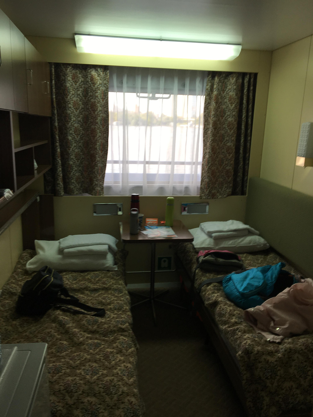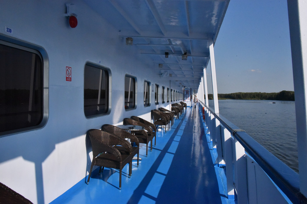 天鹅湖号,有三层游客客房,我们的房间在二层甲板,所有房间都有对外的窗,窗外是可以散步的甲板通道,可以躺在房间中观看外面的景色,也可以坐在窗外藤椅上发呆,真舒坦,