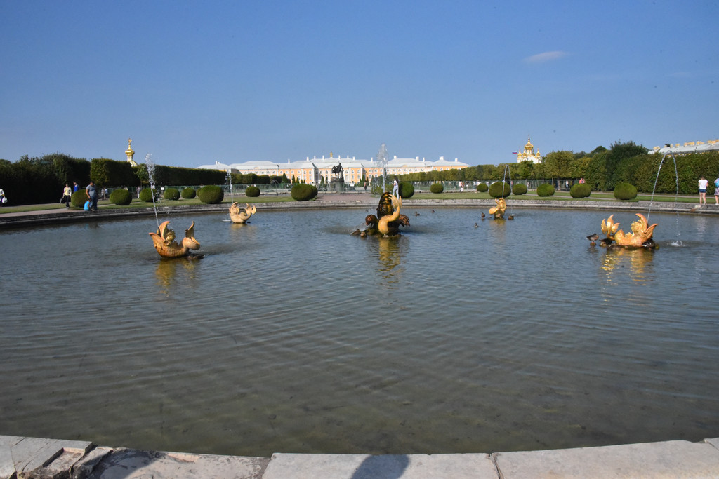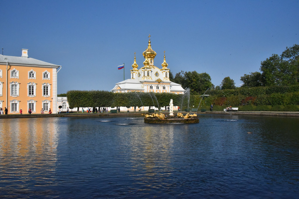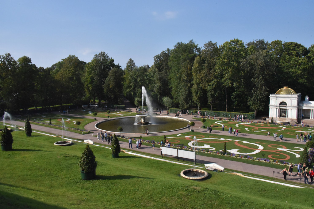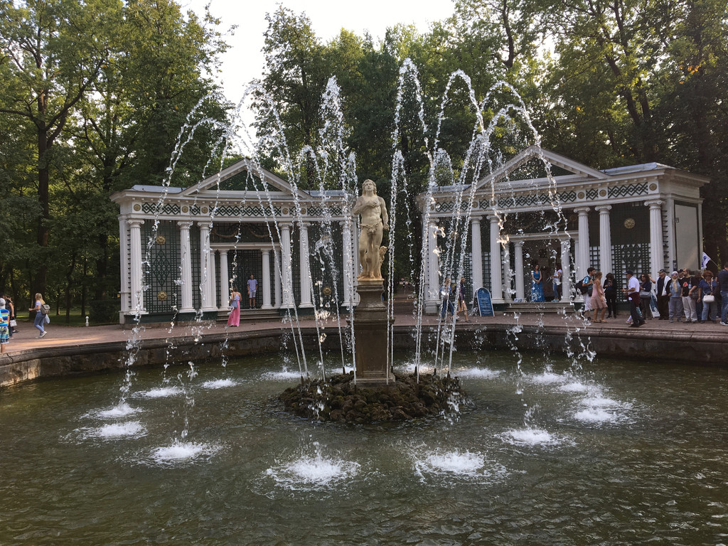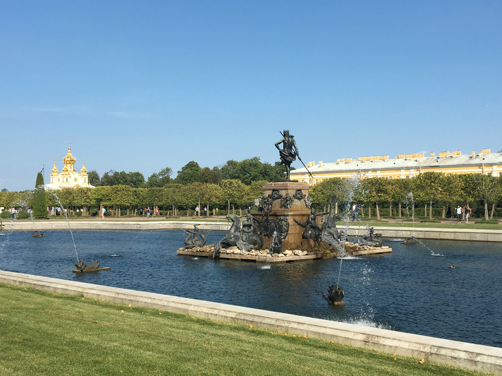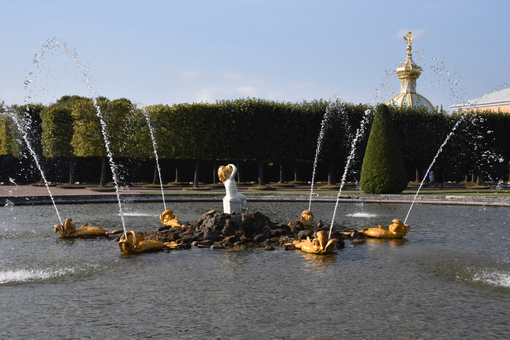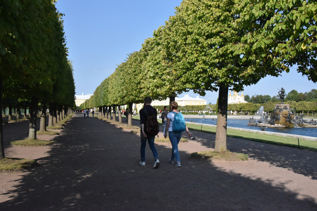 外面已经有大巴等我们了,上车后新的地陪导游和大家问好,不出声看外表还以为是个男孩子,短短的头发瘦瘦的脸颊,说起话来干巴利落脆,是个北京大妞吧?不是,我是东北人,嫁给北京石家庄人,所以北京话讲的不错!这玩笑开的,让全车气氛顿时轻松愉快,丹丹是金牌导游,干这行已经有十二年了,小娟几年前就曾和她搭档过,这次是点名要和她配合的,丹丹经验丰富,看天气今天阳光灿烂,适合去郊外的夏宫花园,位于圣彼得堡西南方向的彼得高夫皇家花园-夏宫,夏宫1704年规划,1705年动工,第一位设计师就是彼得大帝(彼得一世),当时沙皇牵头组织了百人访问团出访欧洲学习当地技术,彼得一世则乔装成水手去荷兰阿姆斯特丹学习造船技术,获得了优异成绩,他认为要改变俄罗斯的落后就要向西方学习,要通过海洋走向世界,俄国有很多的河流但都是内河没有出海口,要发动战争,夺取出海口,然后通商建立贸易点,然后变成殖民地(这正是一般的帝国主义列强的做法),他成功从瑞典手中夺得这个通往波罗的海的出海口,建立了瓦西里港,并在这里建立皇家花园,花园建立在一个小山丘上,分上下花园,这里水资源丰富,山丘上还有天然喷泉眼,上花园主要是宫殿,修剪的松墙,精心布置的喷泉花园,下花园主要是喷泉景观并多以自然景为主。进入上花园,首先看到的是巨大的喷水池,两侧修剪整齐的树墙,前面淡黄色宫殿,有些像奥地利的美泉宫,只是场面更大些,