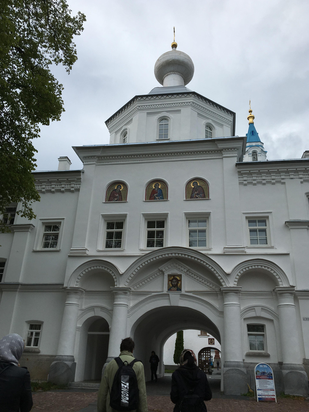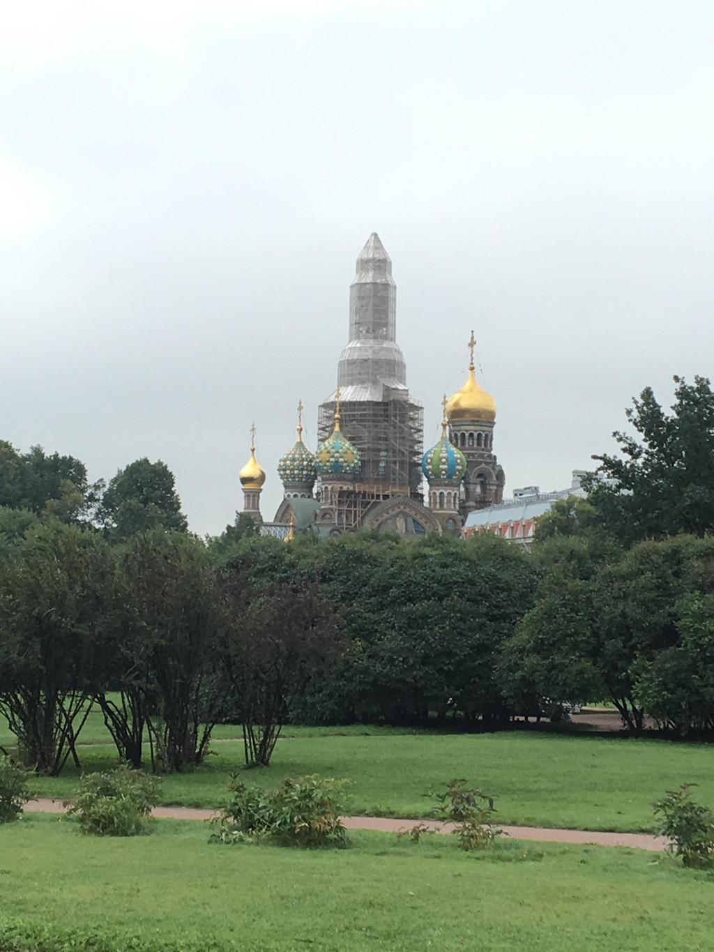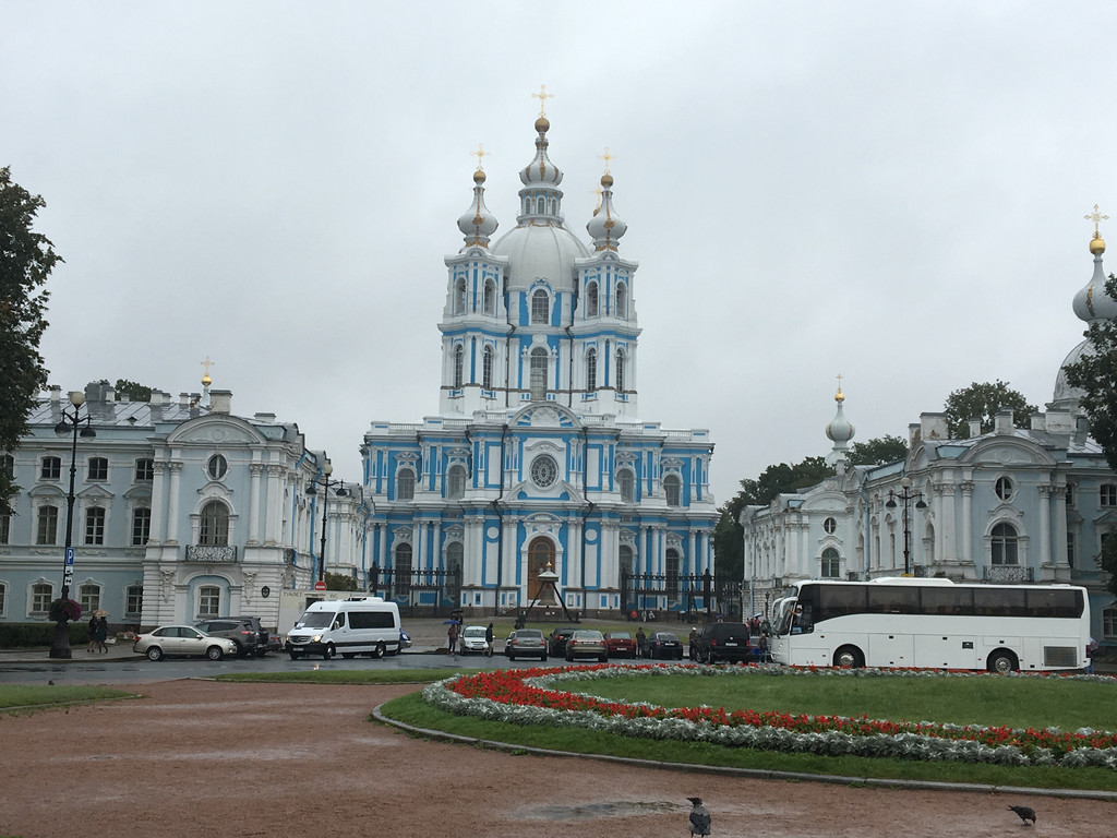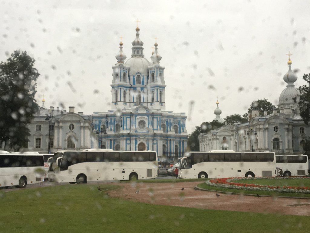 雨中浏览斯莫尔尼建筑群,一组漂亮的蓝白色建筑,主体建筑是在伊丽莎白时期由叶卡捷琳娜宫和冬宫设计者拉斯特莱利设计,那时宫殿的色彩最多使用的是蓝色、白色和金色,伊丽莎白曾问设计师为什么,回答是,因为蓝色代表你漂亮深邃的蓝眼睛,白色代表你白皙的皮肤,金色代表你金色的头发,这撩妹的回答无从考证,反正感觉挺肉麻的。伊丽莎白终生追求青春永驻,后期有些慢性中毒,在这里又建了女子修道院,准备自用,到叶卡捷琳娜二世期间重新启用,主体建筑前方是女子贵族学院,