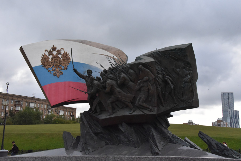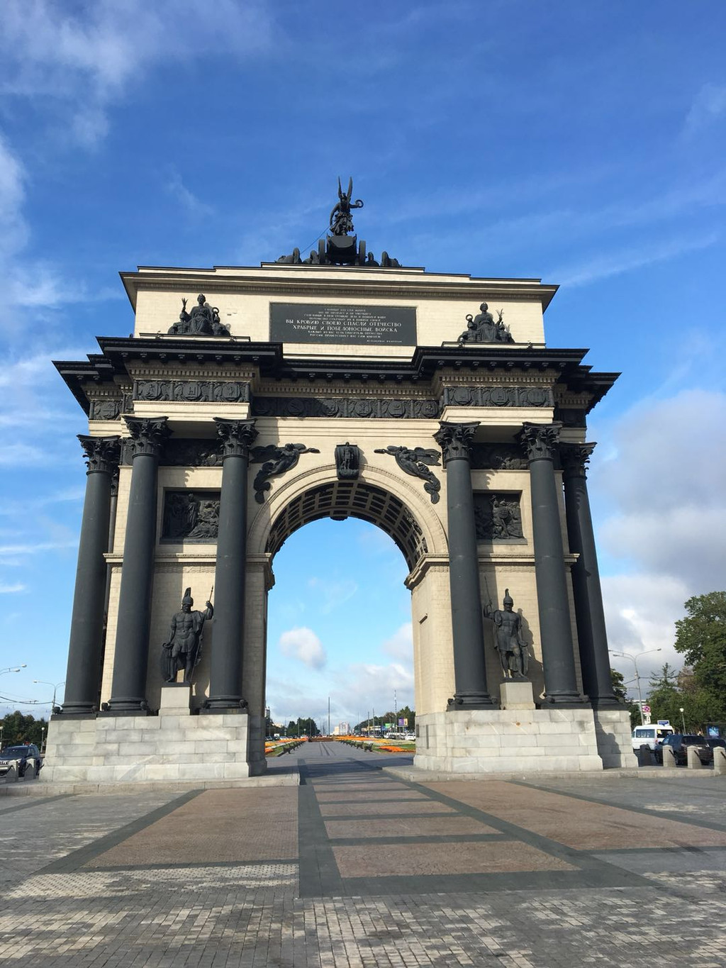 下一个景点是离此不远的凯旋门,这是为庆祝1812年俄法战争胜利而建,1812年,拿破仑一世率领60多万大军攻进莫斯科,烧杀抢掠,但莫斯科人民在法军到来之前就坚壁清野,让法军没有占到太多的便宜,在退却的路上,法军遭到俄罗斯人的频频阻击,加上正值俄罗斯天寒地冻、法军粮草不继,拿破仑吃尽了苦头,伤亡惨重,最后仅有3万多人回到法国,俄罗斯也算胜利了,1805年拿破仑曾因为打败俄奥联军在法国巴黎建立了一座凯旋门,俄罗斯为庆祝这次的胜利也仿造法国的方法建立了一座凯旋门,还有羞辱拿破仑的意思,当时建造的是木制,12年后就腐朽倒塌了,1834年建立了石头的凯旋门,后因城市规划被推翻,1968年在此地重建,凯旋门高28米,白色石贴面,12根黑色金属柱环绕,两面四个俄罗斯勇士执盾牌长矛站立守卫,凯旋门顶部是身上长有翅膀的胜利女神驱赶着六匹马拉的车飞驰,这是莫斯科的守护神。