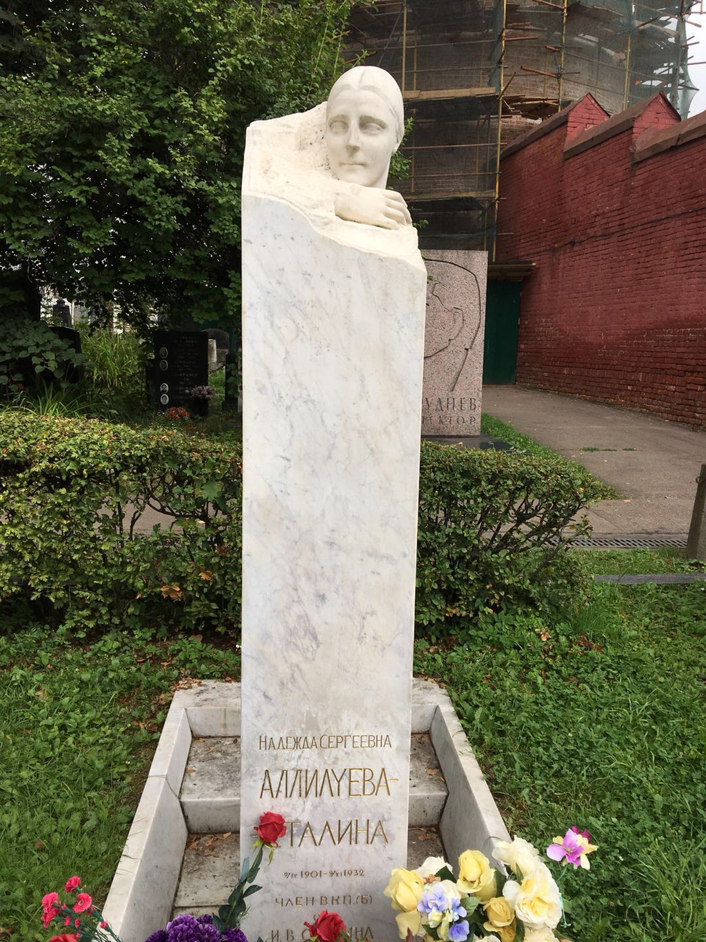 斯大林娜,斯大林的第二任妻子,她的墓碑原来是用玻璃罩罩住的,这种方式的墓碑表示墓主人的死因不明,她的死因原来的说法是与斯大林吵架后开枪自杀,去年此案终于有了明确的结论,是斯大林开枪杀死了她,现如今玻璃罩已经移去。