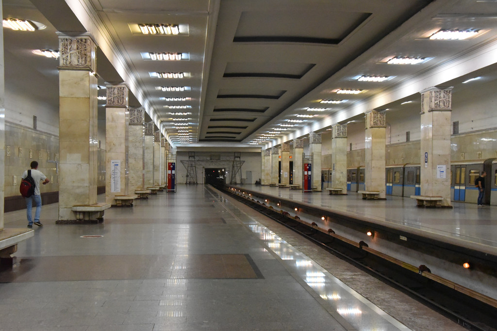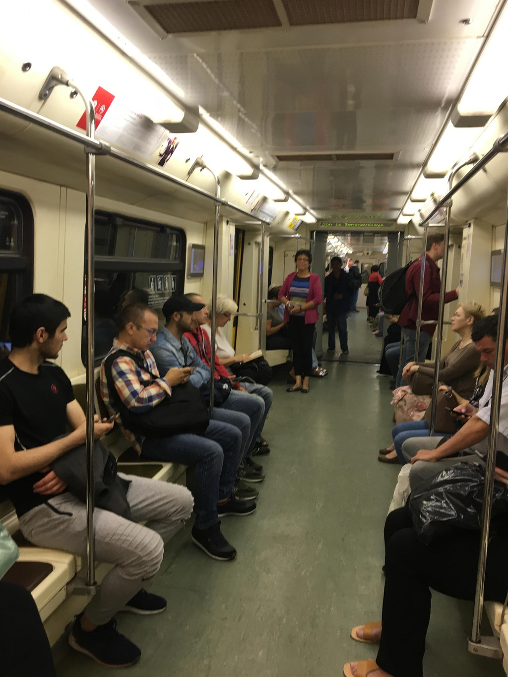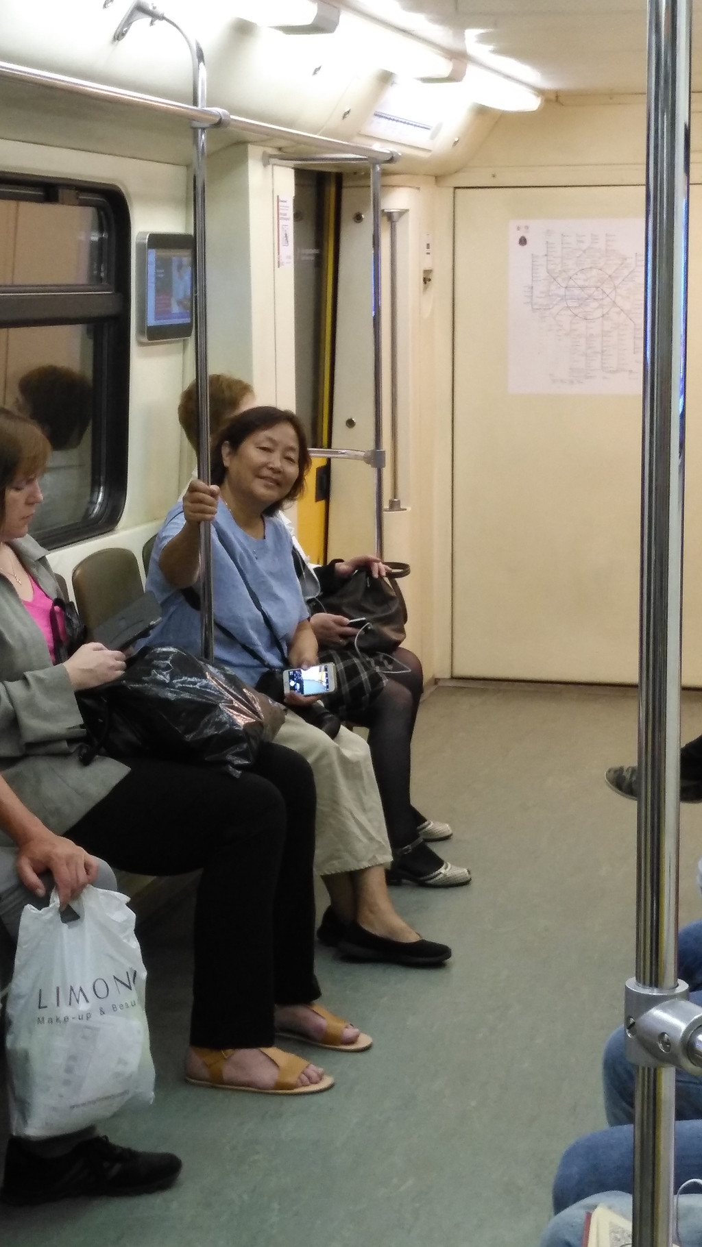 顶部照明灯造型简单不失优雅大气,车厢似乎比北京地铁宽些,扶手比较细更适合乘客抓握,更重要的是这里没有广告,给人干净稳重的感觉,又一次体会了俄罗斯大国的风范。