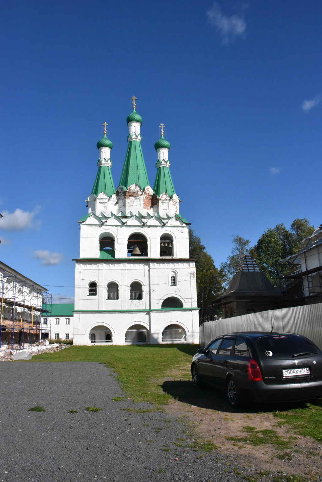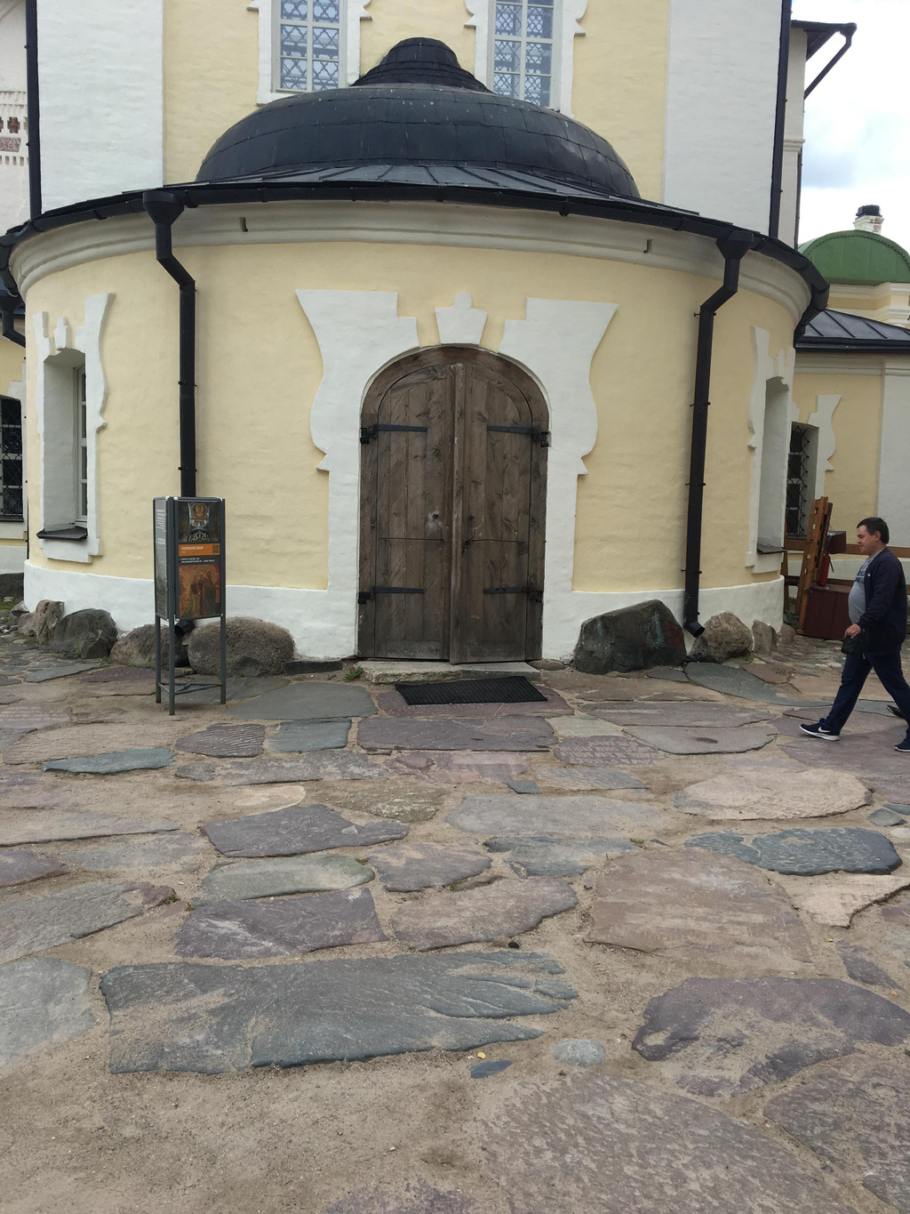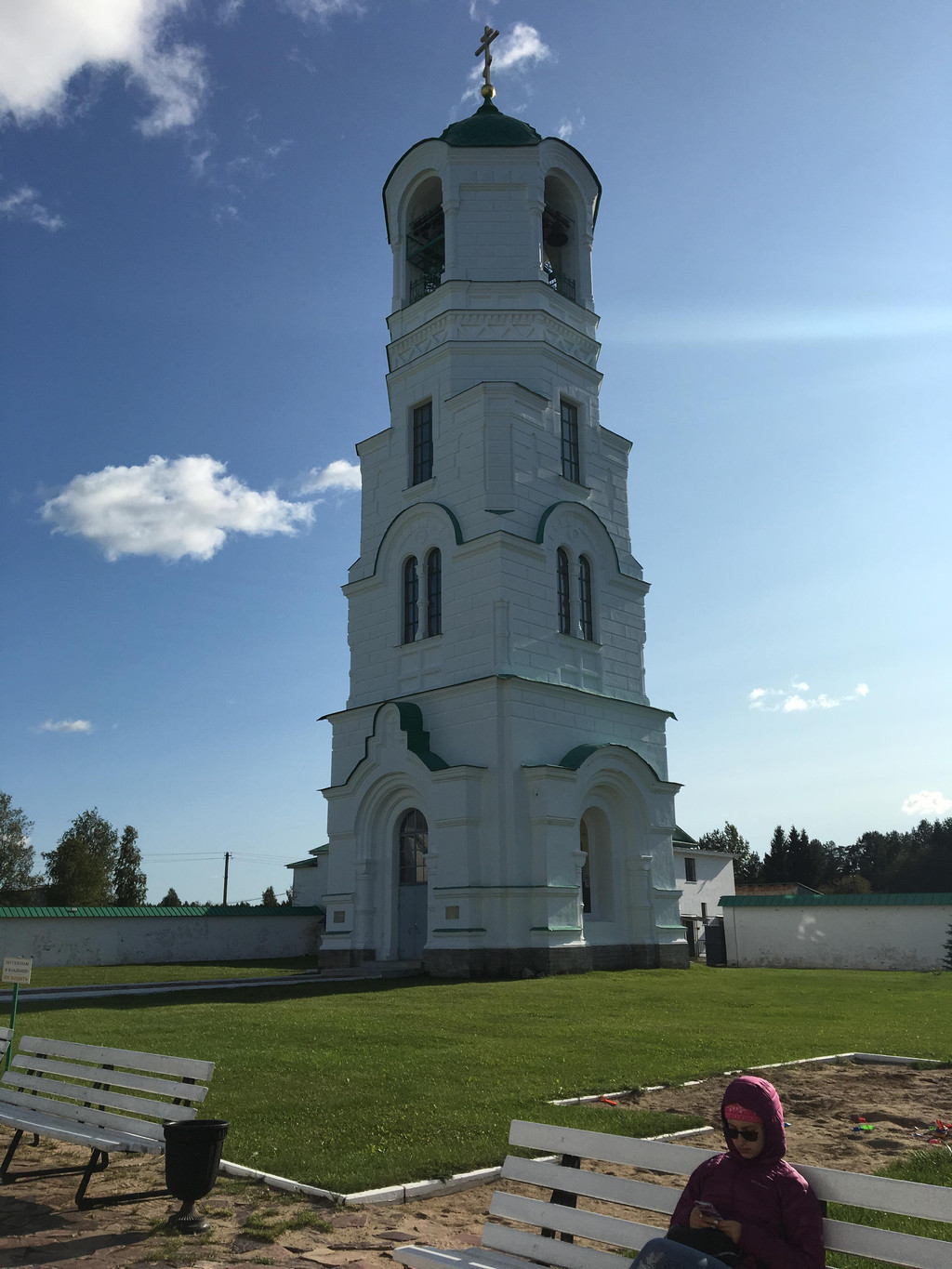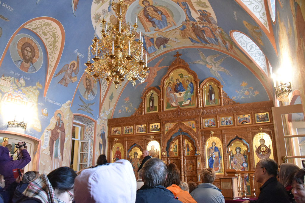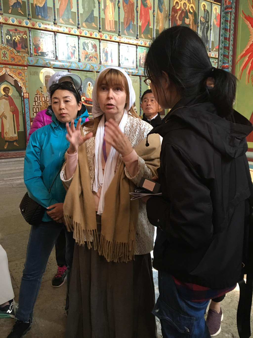 克里姆内另一个大教堂是乌格里奇救-普列大教堂,也称德米特里教堂,建于18世纪,自从在克里姆林宫学习了圣像画几排代表教堂的规格后,我们每进一个教堂第一件事就是圣数像的排数,这里是六层圣像,比克里姆林宫里的还多一排,难道它?问当地导游,她居然不知道这个排数代表了什么,看来这排数不是判定标准吧。它的旁边是高37米的钟楼,整点敲钟,