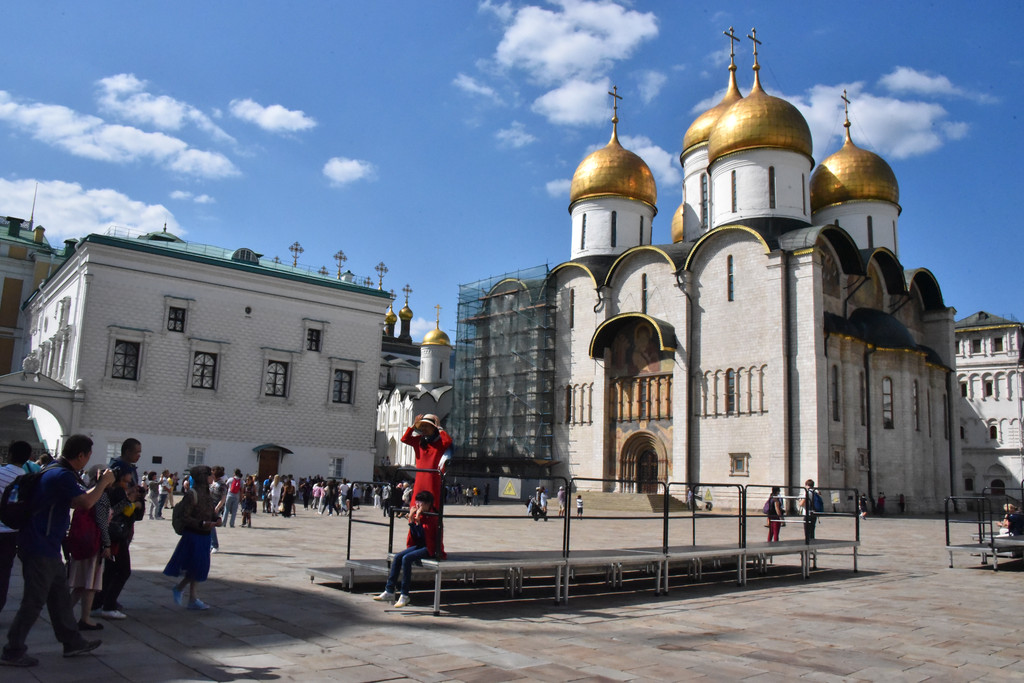 往前走右手是教堂广场入口,这里是教堂区,里面最著名的是原东正教总教堂-圣母升天教堂,覆盖紫金的球形教堂顶在阳光下熠熠生辉,紫金顶说明教堂是皇家专用,黄金顶次之,就像中国皇帝用黄色琉璃瓦覆盖宫殿顶部一样,