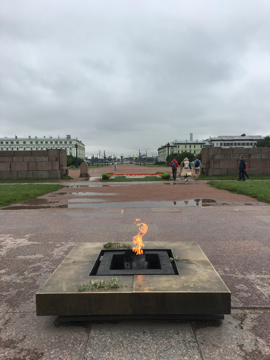 战神广场中有一座雕像是叶卡捷琳娜二世期间俄国的常胜将军苏沃洛夫,这片草坪也是骑士兵团操练的场地,现在这里有无名烈士圣火。