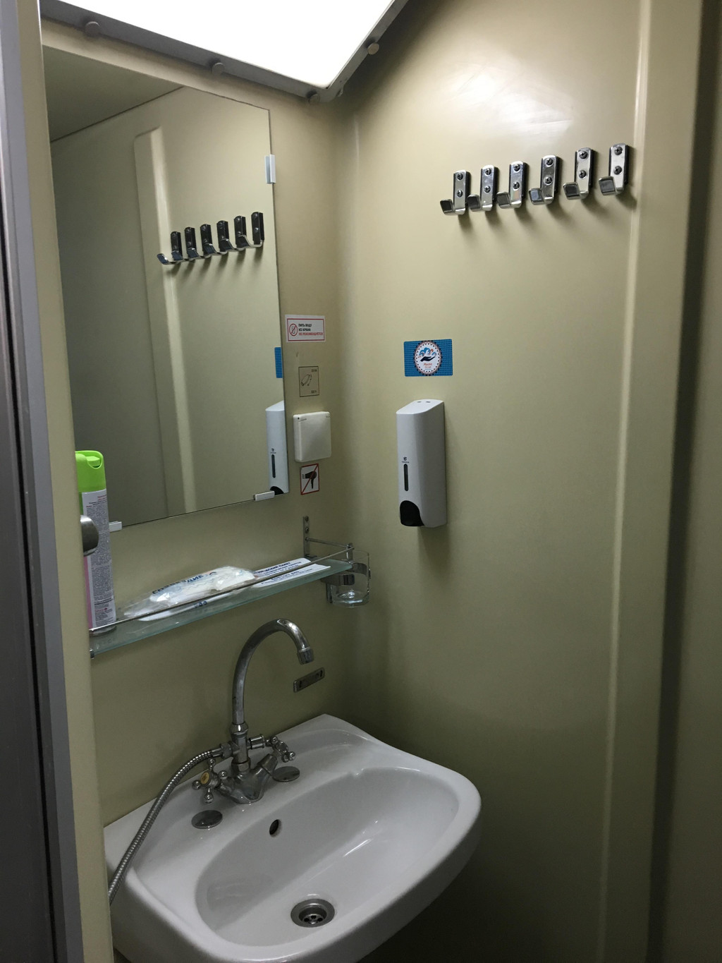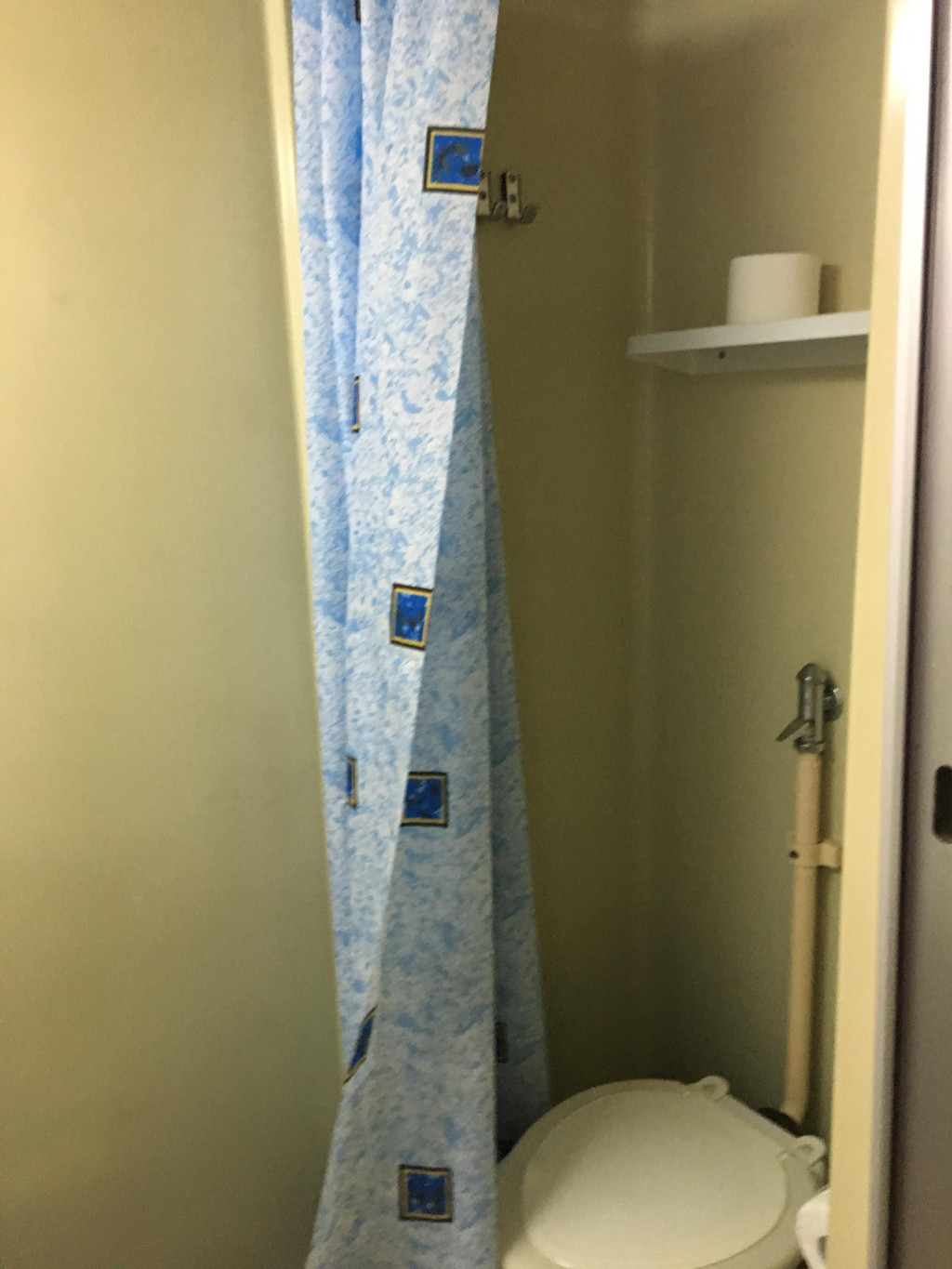 房间中除了两张床外还有一组组合柜加大衣柜,可以将所有必需品取出来摆放好,卫生间的设计真是巧妙,用一个浴帘将马桶和卫生间门围起来,原本看起来不大的卫生间淋浴区倒是不显小,