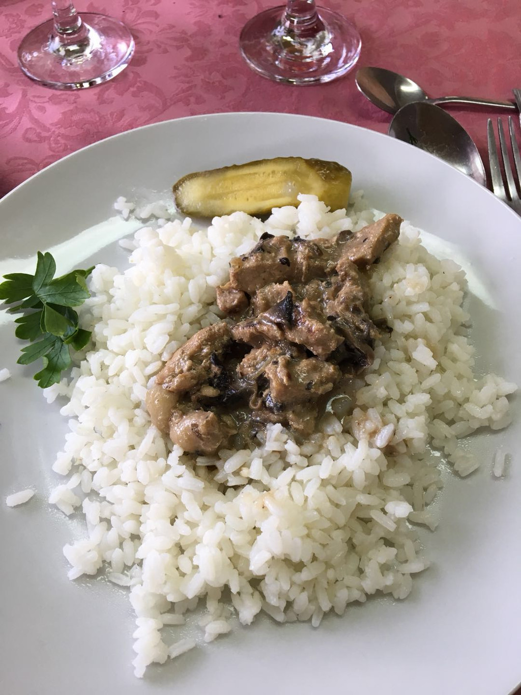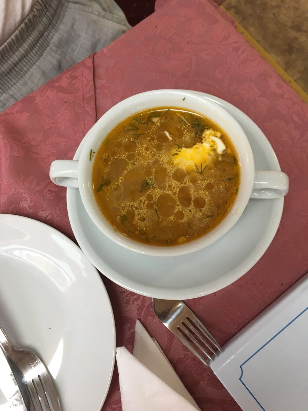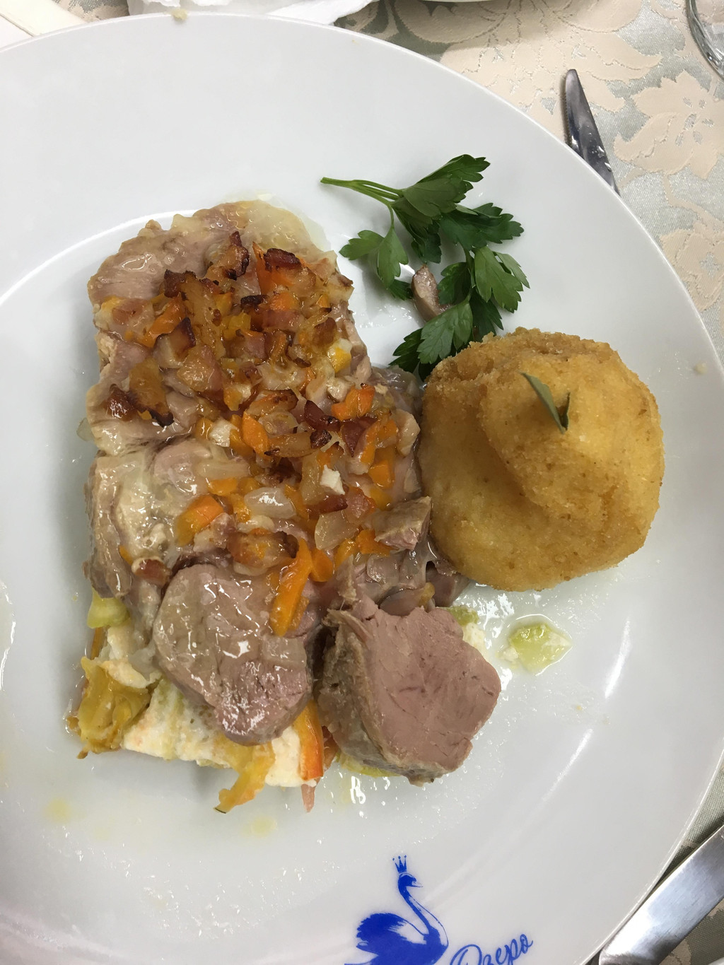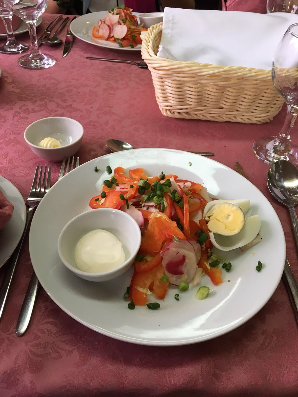 坐在车上游览了一下市容和主要景点,半天很快过去,要回船吃饭了,餐厅里空空荡荡的,发现只有我们一个团四桌客人,其他客人已经离船了,只有一位为我们服务的服务员仍然认真一丝不苟地服务着,菜品的质量也一如既往,前菜、汤、主菜、甜品,依然是一道一道地上,让我们真的很感动呢。