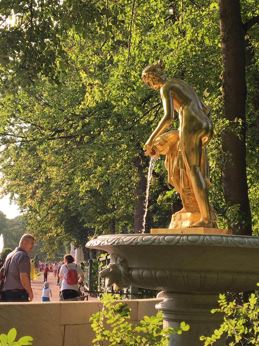 在中央喷泉两侧,对称分布着圆形喷泉池,漂亮的用花做出图案的草坪,周边绿地中也均衡分布着小型喷泉,沿阶梯走下去,不时出现一些喷泉小景,只要是人物雕像无一例外地穿着金装,透着奢华,