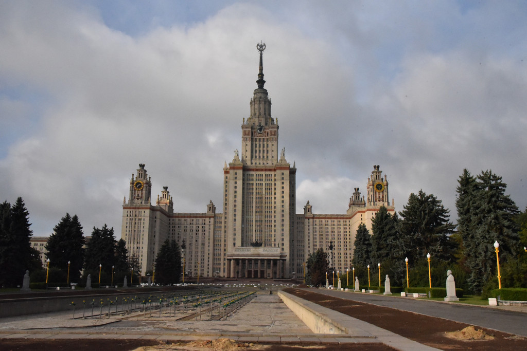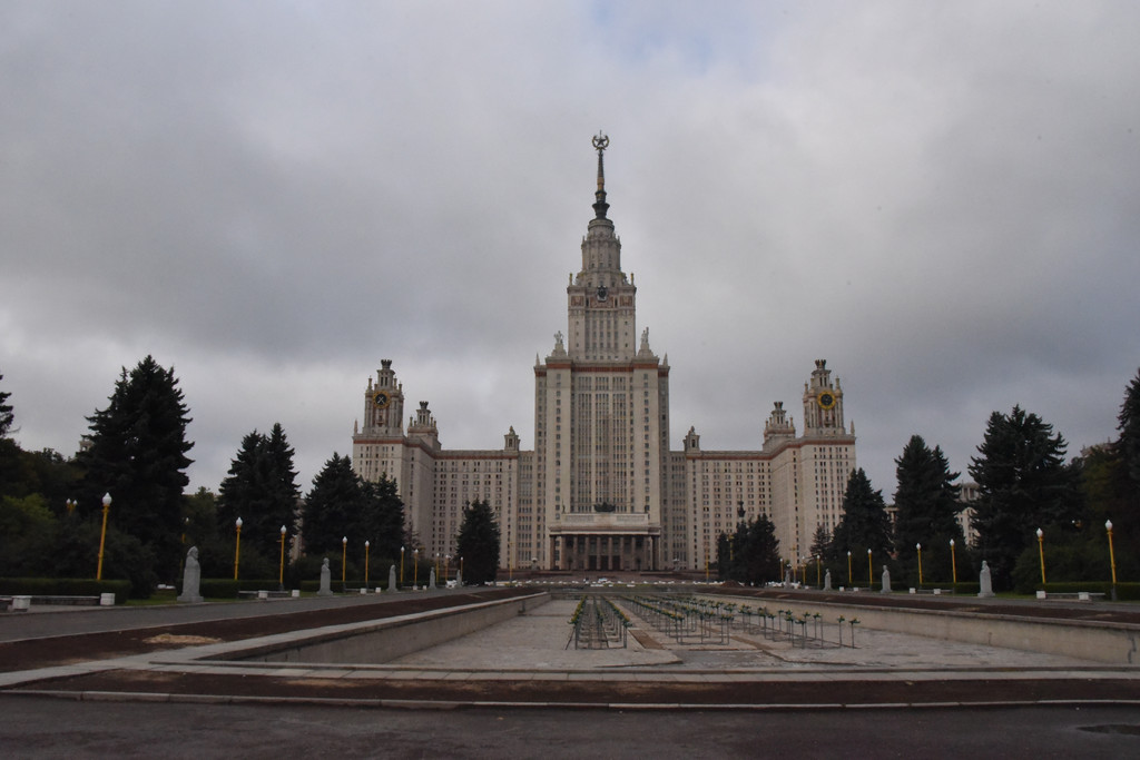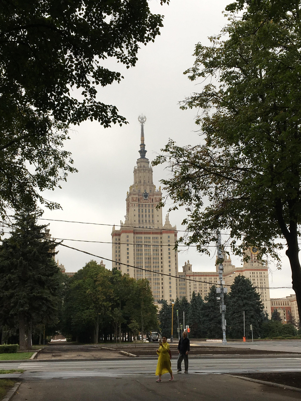 我们在莫斯科要参观的第一个景点是位于莫斯科市西南部的莫斯科大学,莫斯科大学所在的地方被称为麻雀山,也称列宁山,这里是城市的制高点,莫斯科大学是1755年由当时的沙皇伊丽莎白彼得罗芙娜下令建立的,几经迁址和损毁,现在的校址是1953年9月重建,32层的主楼包括55米的尖顶在内,总高240米,顶端是五角星徽标,两侧为18层的副楼,整个建筑气势轩昂,