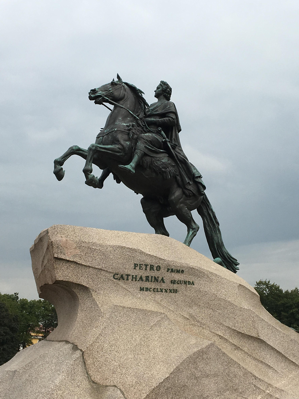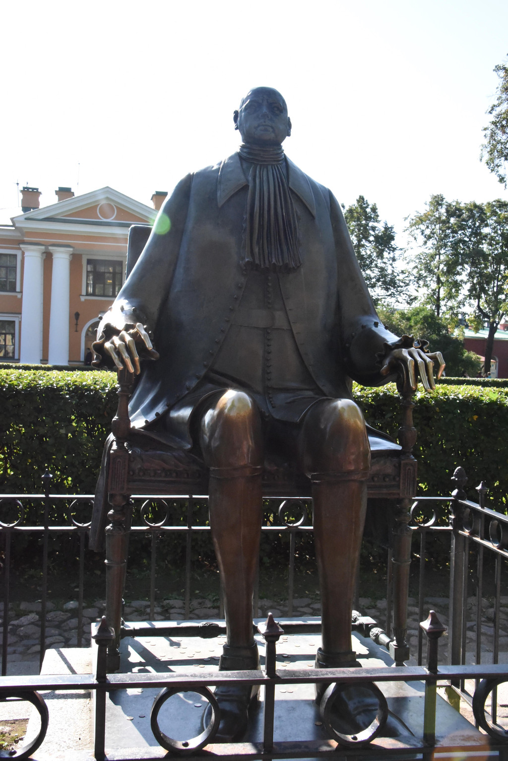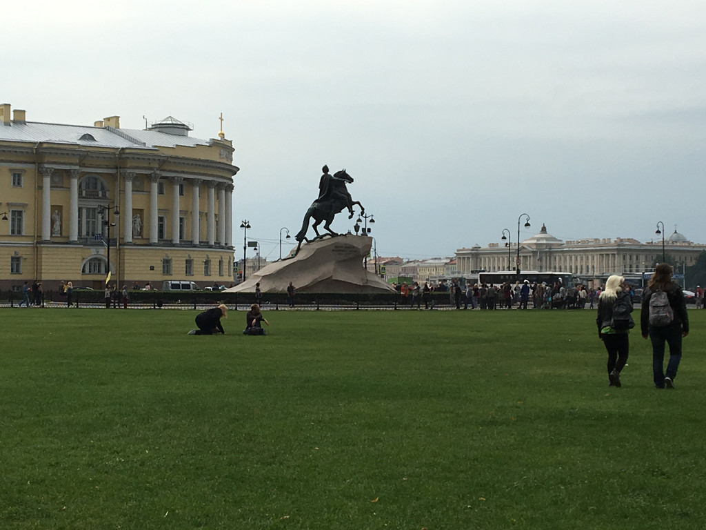 在教堂外面,一侧是海军军官纪念碑,对面一个雕像围着很多游客,导游问猜猜那尊坐着的雕像是谁?谁?是彼得一世沙皇,就是那位威名赫赫的彼得大帝,一点都不威武,相反,那小小的脑袋和身材配合一起整个一个比例失调,据说彼得就是长的这个模样,身高近2米,长个小脑袋,这个脑容量并没有影响他逼宫夺权,游历学习,征战欧洲。