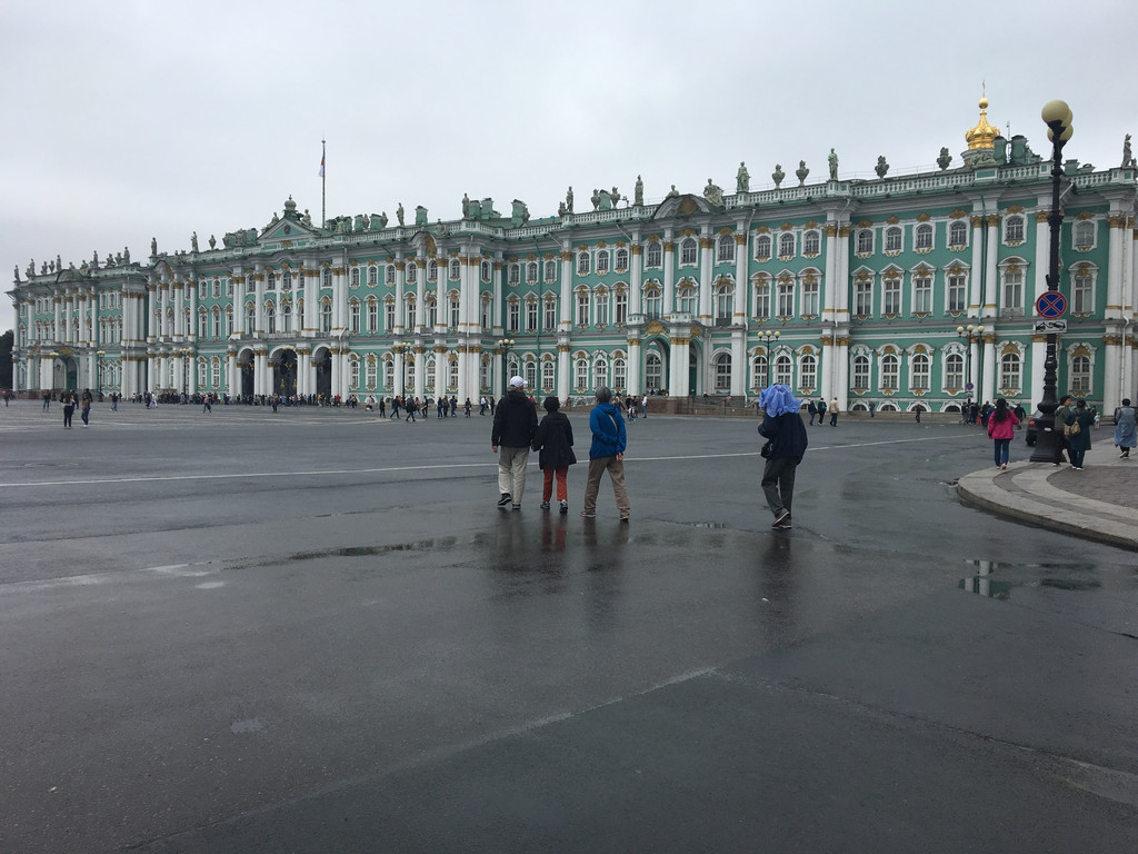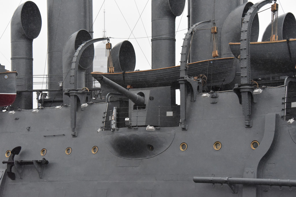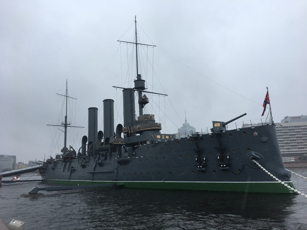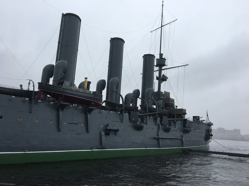 今天阴天,时有小雨,首先去看停靠在涅瓦河边的阿芙乐尔号巡洋舰。阿芙乐尔俄文意思为黎明中给人带来光明的星星,1897年生产,1900年下水,舰长168米,宽124米,1903年正式编入序列,14年中参加了五次海战战绩皆不理想,俄日海战阿芙乐尔号努力参战后寻求自保撤退至菲律宾海后被菲律宾扣留,后被归还,十月革命,列宁号召反沙皇,反政府,1917年10月25日晚9点40分阿芙乐尔号官兵宣布起义在涅瓦河停在冬宫桥的方向向冬宫开炮,这正是我们印象中的内容,其实事实并非如此,如果真向冬宫开炮,那么重要的历史建筑和里面的珍宝将会受到极大的损失。阿芙乐尔号只是发了一发空炮弹,作为起义的信号,宣布总攻开始,这就是“十月革命一声炮响为我们送来了马克思列宁主义”的标志性语言的由来。在二战期间,列宁格勒保卫战,阿芙乐尔号将17门舰炮卸下14门组成炮阵,应对德军密集性空袭,最后为自保开到一狭窄河道沉入水下,战后打捞出来后一直停靠这个港口,作为功臣舰,阿芙乐尔号巡洋舰是永不退役舰,目前仍有水手和士兵,每天升旗降旗。2014年做了最近的一次修缮,2016年7月29号海军节为它返回港口举行了庆祝活动,深灰色的阿芙乐尔号在雨中显得深沉,两根高大的桅杆,三个冲天的烟囱说明它应动力十足,舰上排列的舰炮显得有些轻巧,那是100多年前的战舰,用那时的眼光看还是相当威武的。
