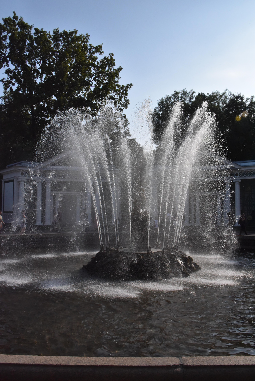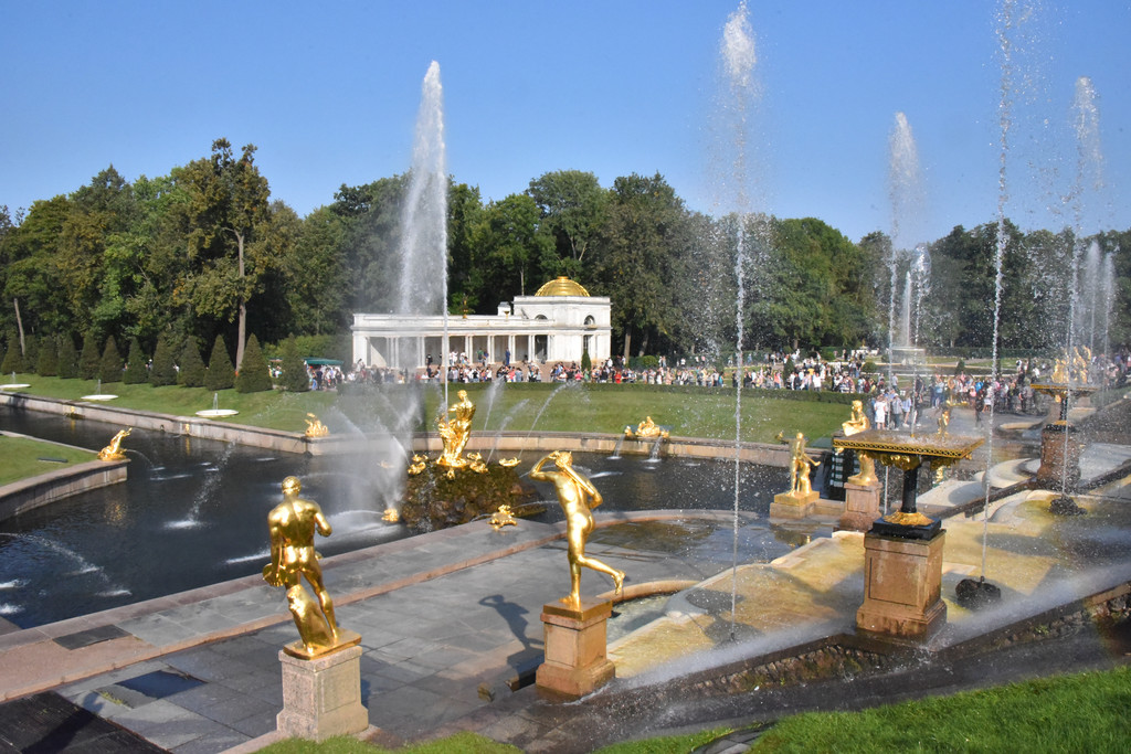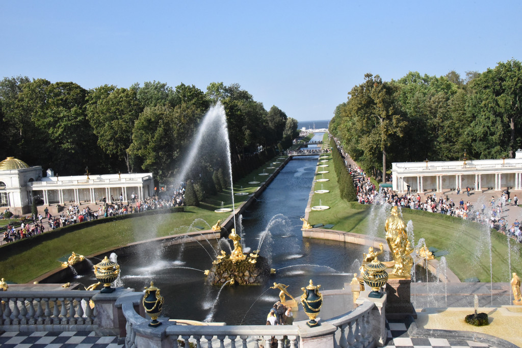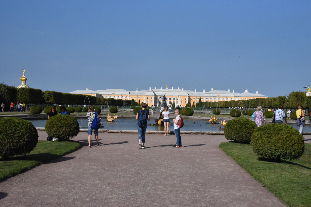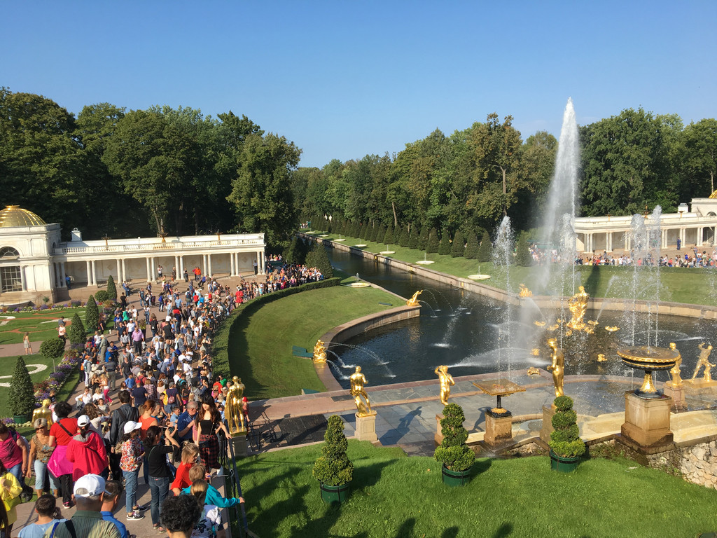 参观的重点是下花园,因为售票处和检票处均设在下花园门口,原来刚才上花园美丽景观是免费赠送的,下花园是一个对称的设计,中央阶梯瀑布喷泉是主体景观,这里水顺着阶梯流下,两侧每个台阶上都有一对雕塑,表面镀金,每个台阶一个喷泉口,向高空喷出水柱,中央水池中一个参孙斗妖魔的雕像向上喷出最高水柱,周边两层小喷泉向外喷出弧形水柱,前面一条168米长的小运河直达海湾,这里集中了大量游客,