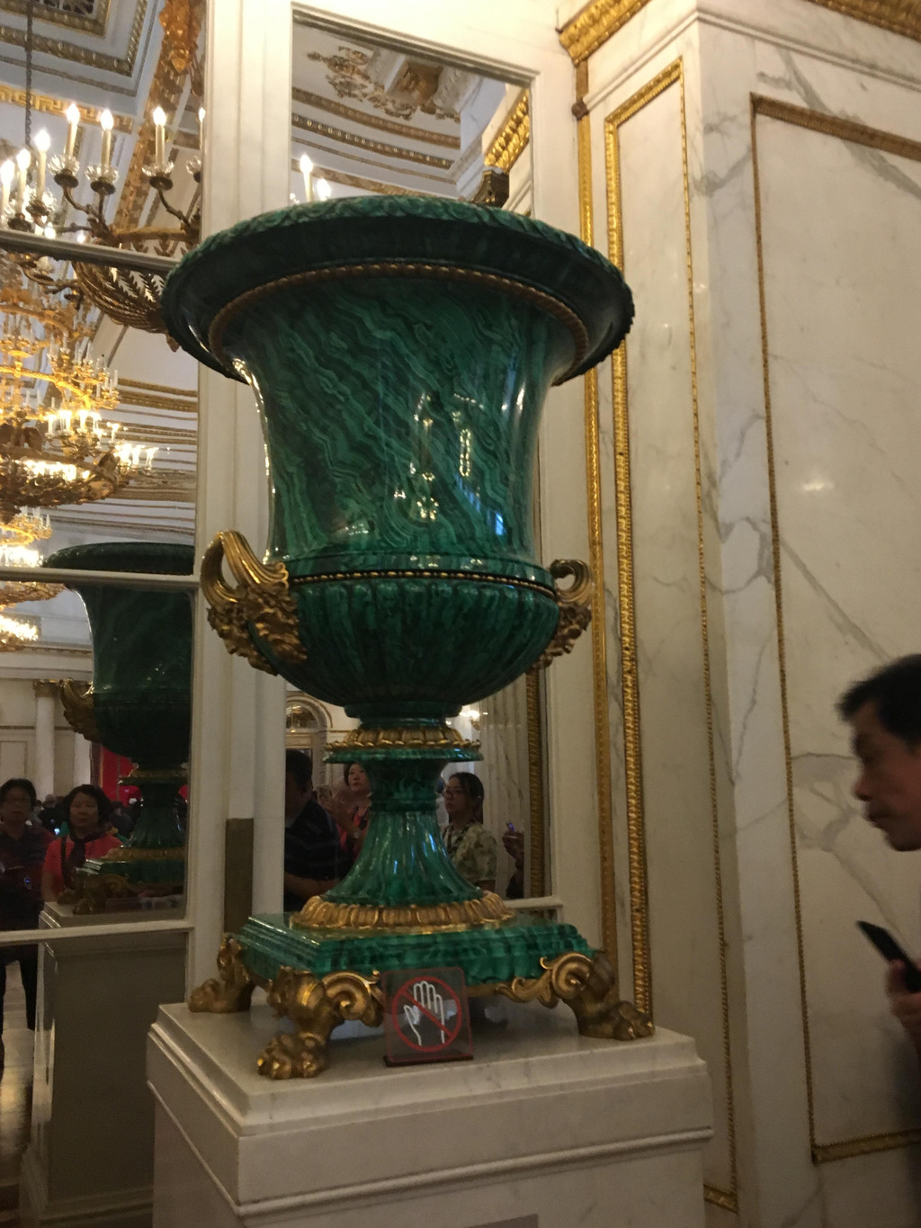 这个展厅中还展出孔雀石杯,用俄罗斯特产孔雀石薄片贴在铜胎上,工艺精湛,看不出一丝接缝,