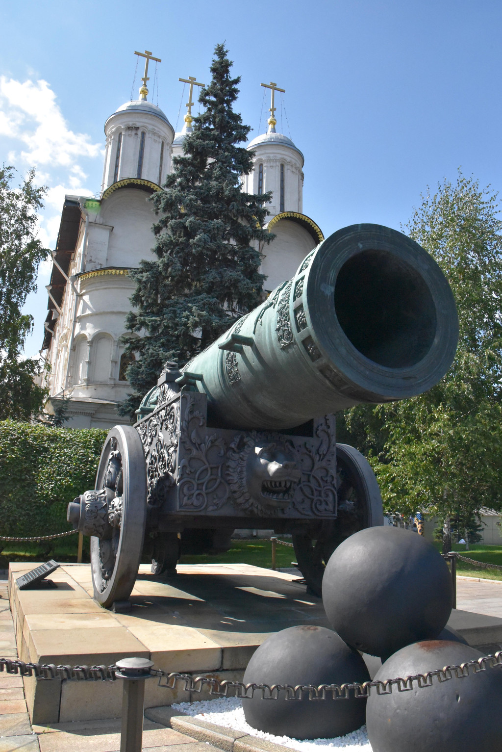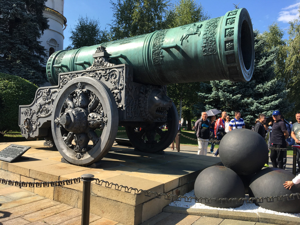 在路口右转见到重40吨的炮王,炮王建于1856年,炮口直径近一米,炮身下摆放的巨大的球形炮弹,每个两吨重,大炮做得精致,绿色的炮筒坐在深灰色的炮车上,雕满浮雕,华丽无比,只是大炮制成后从未被使用,