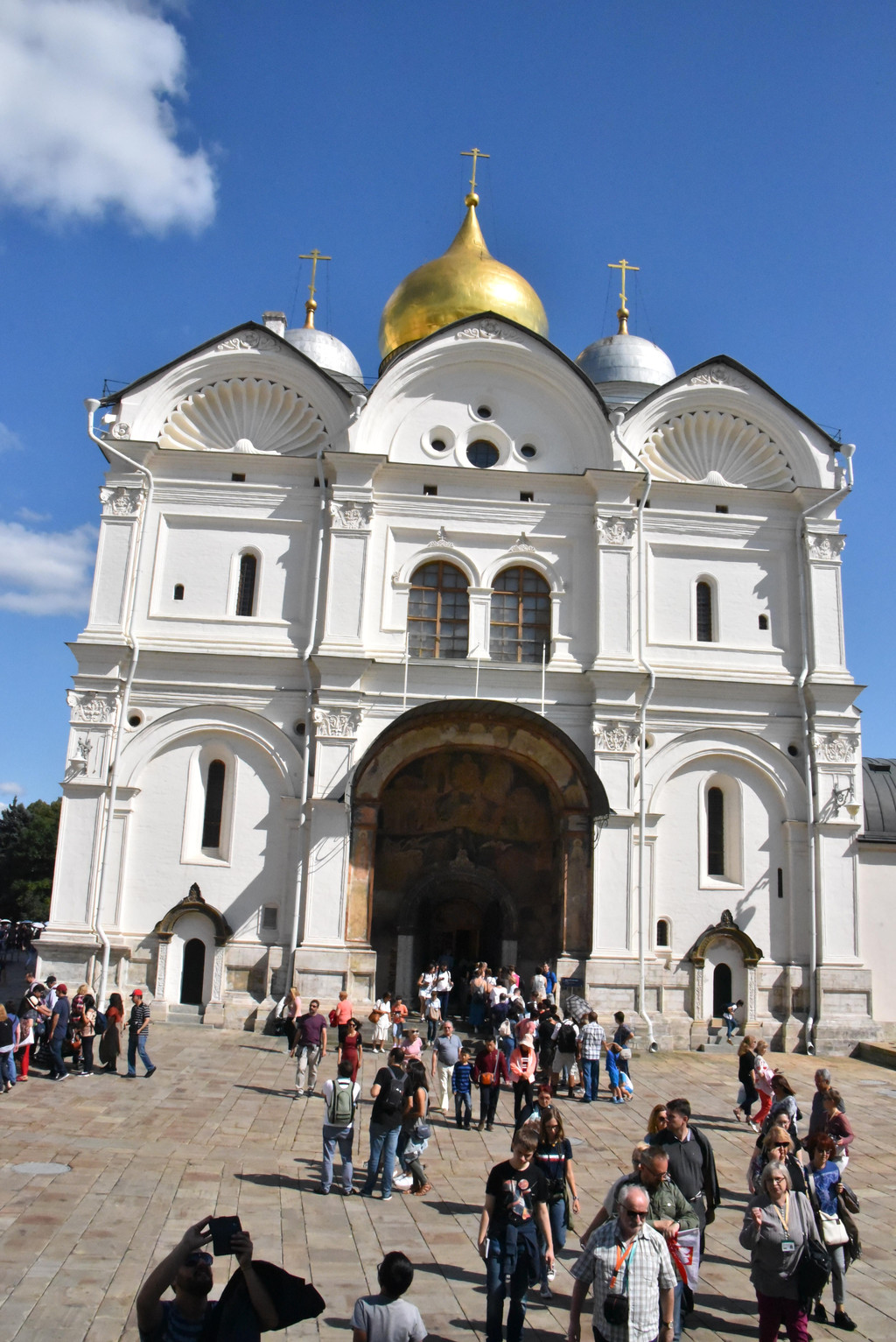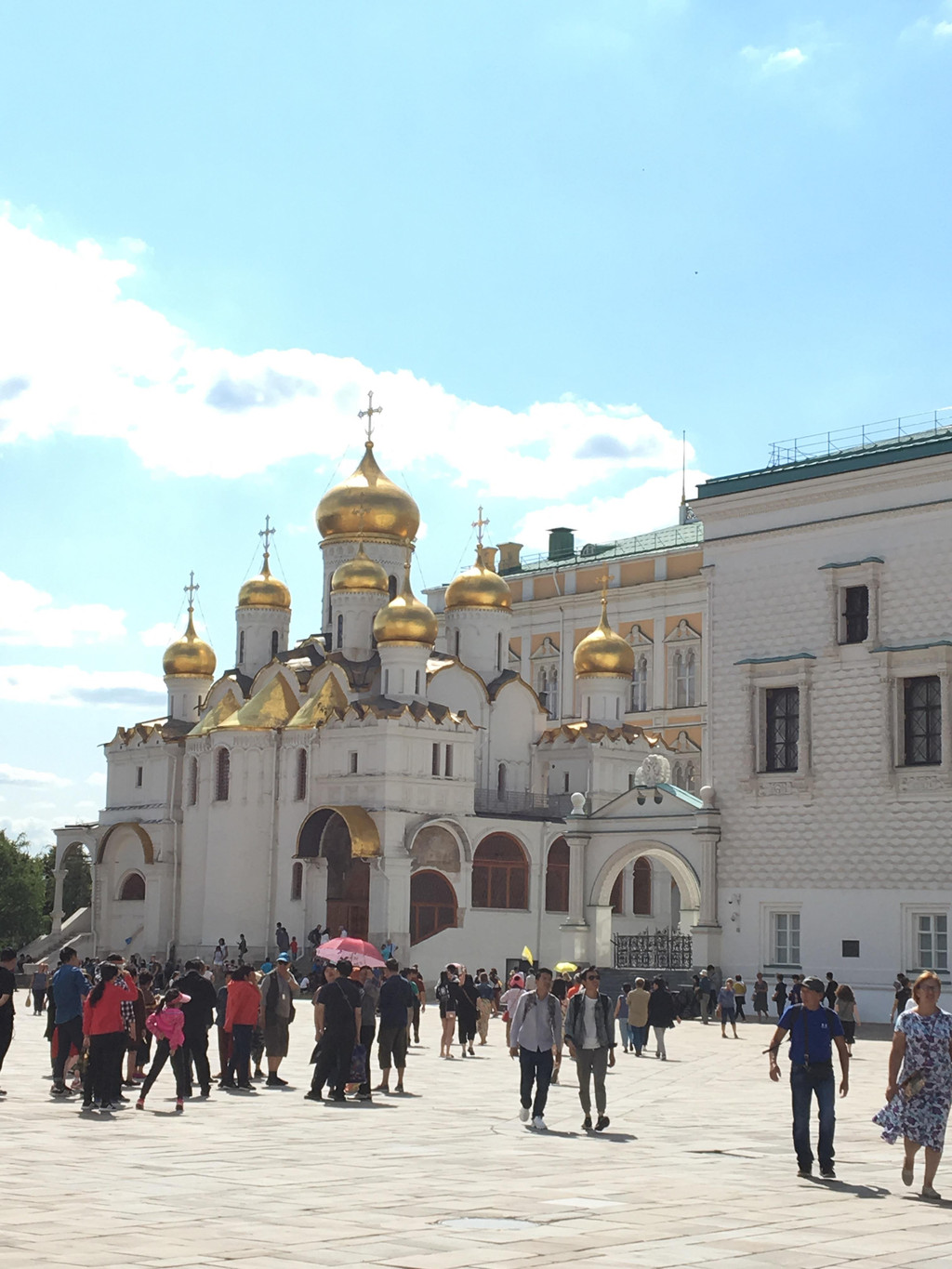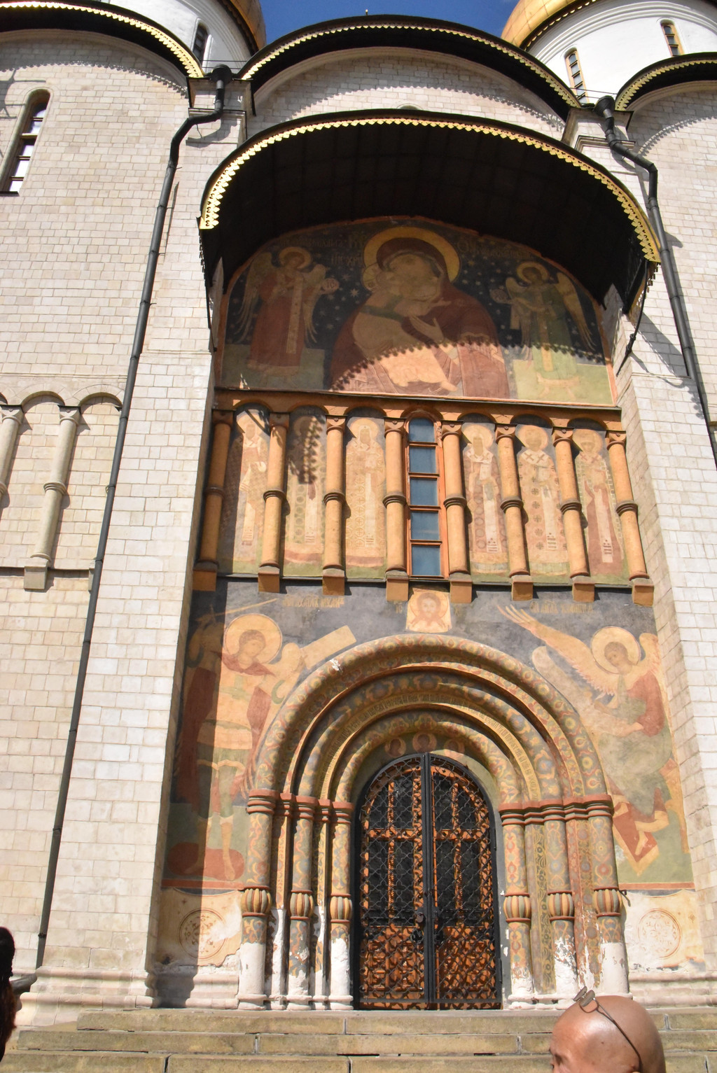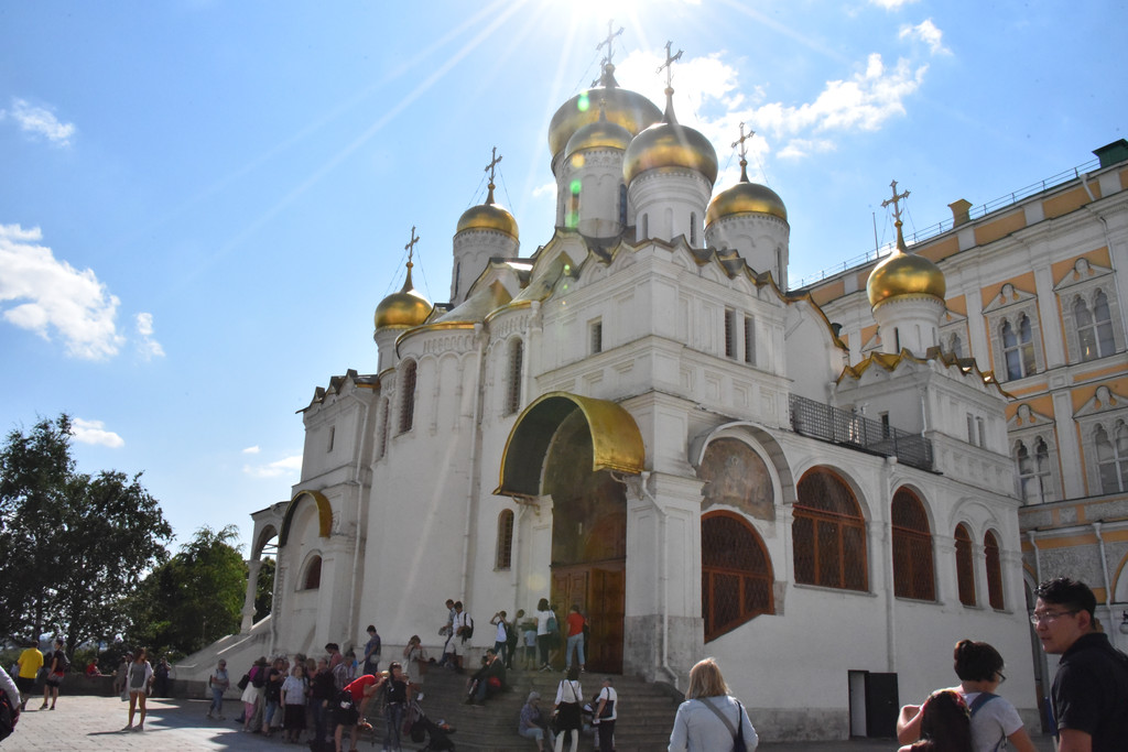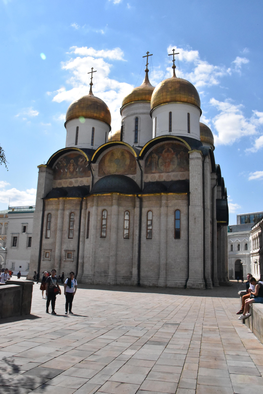 这座教堂建于15世纪后期的1480年,白色石头建筑,进入教堂,满是壁画的教堂空间不是不大,柱子不是很粗也画满壁画,拱形顶,正面是祭坛,墙上有圣经故事圣像五层,导游介绍一般教堂圣像只有四层或更少,五层圣像的教堂宗教级别高,具有加冕资质,这个教堂就曾为多代沙皇登基行加冕礼,它的旁边是天使报喜教堂,黄金球顶,是皇族子孙洗礼结婚的教堂,