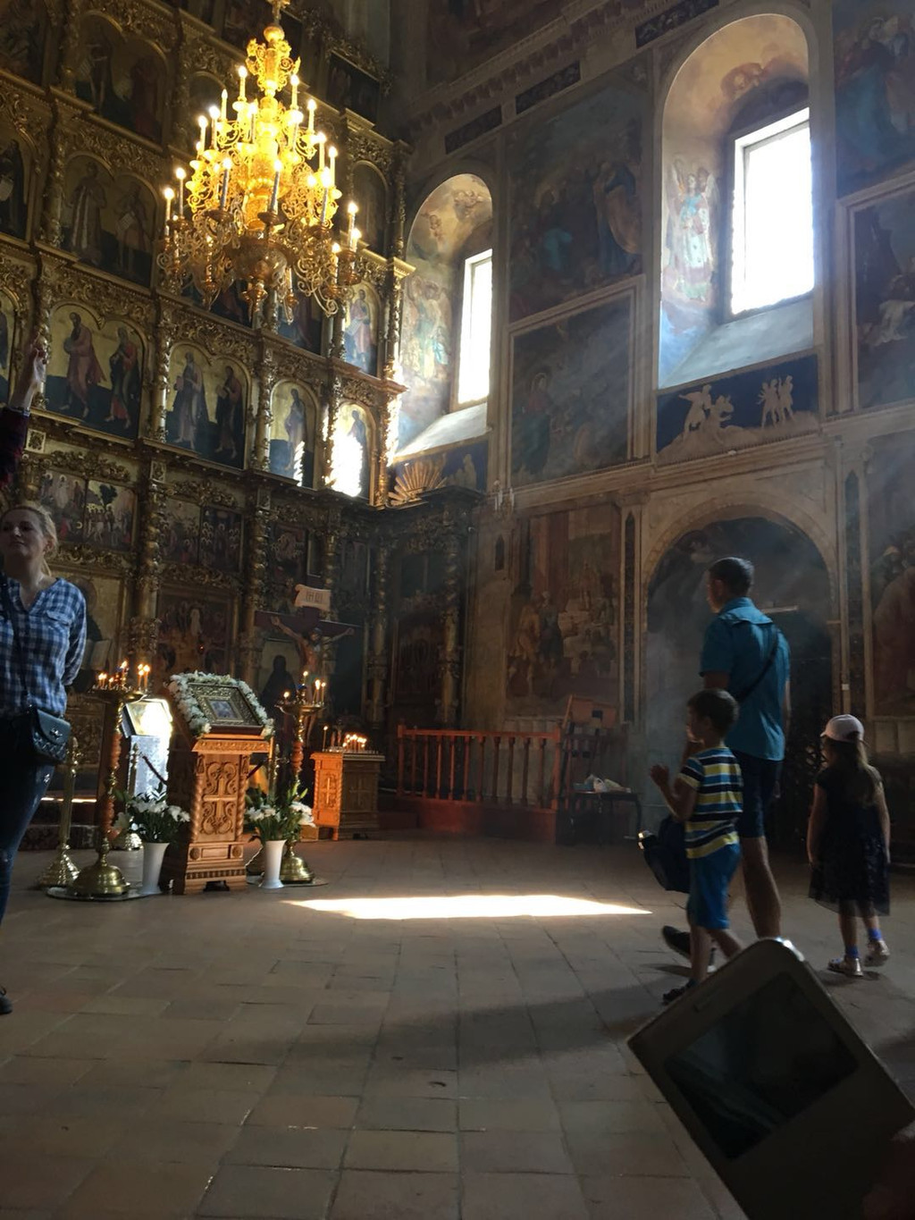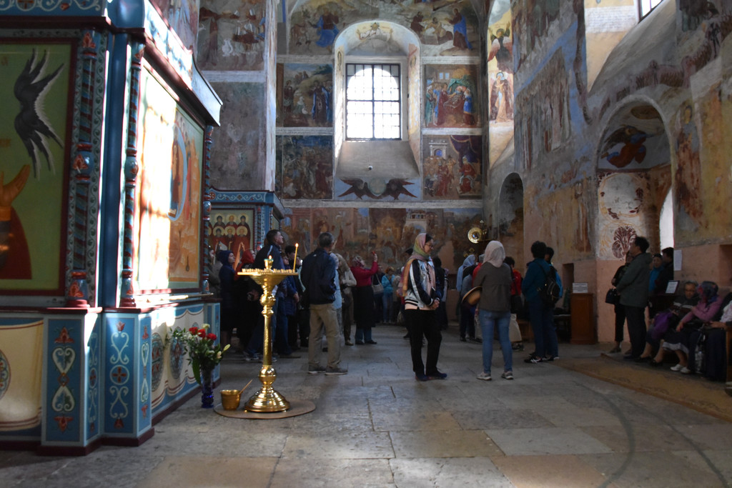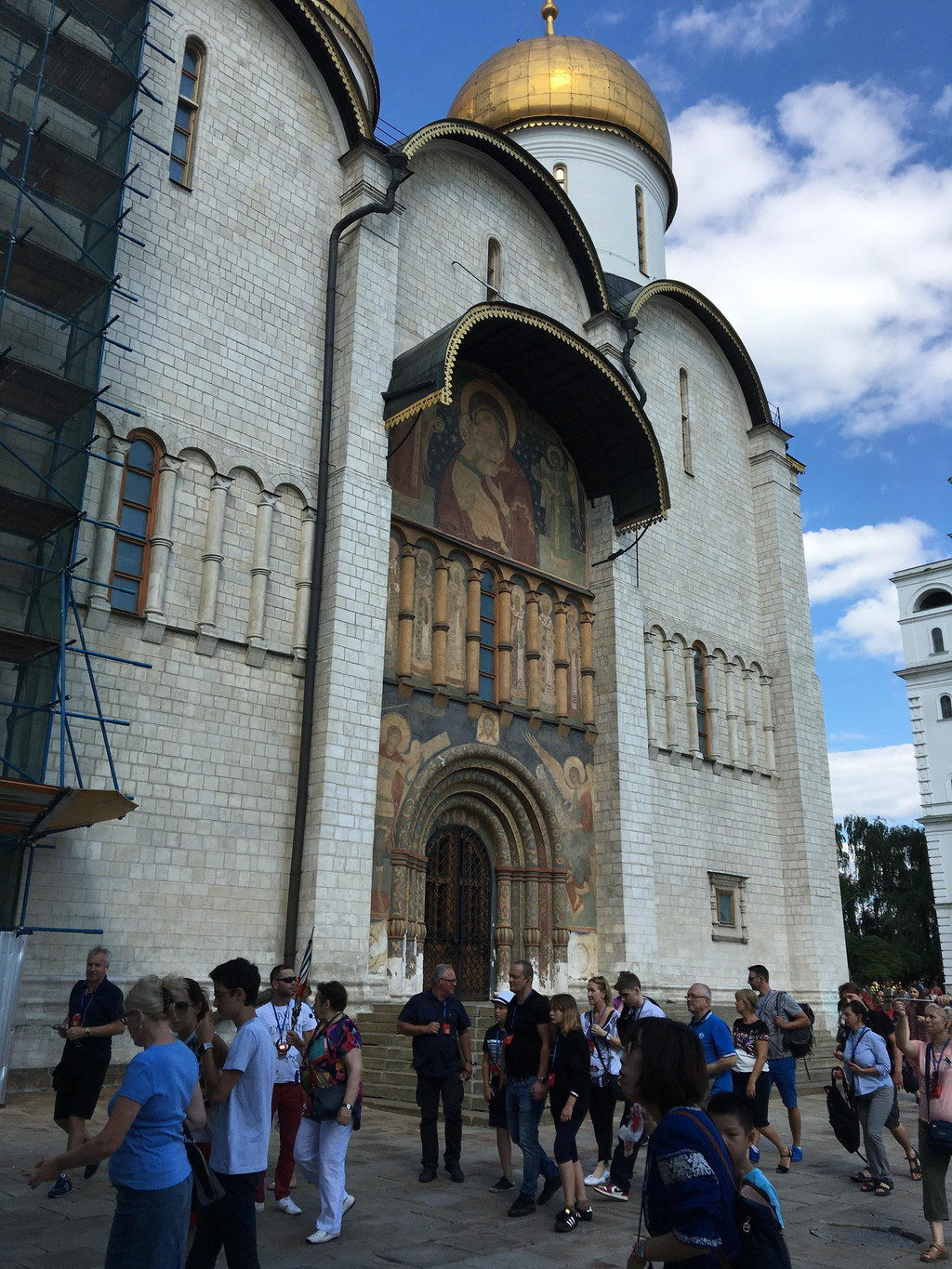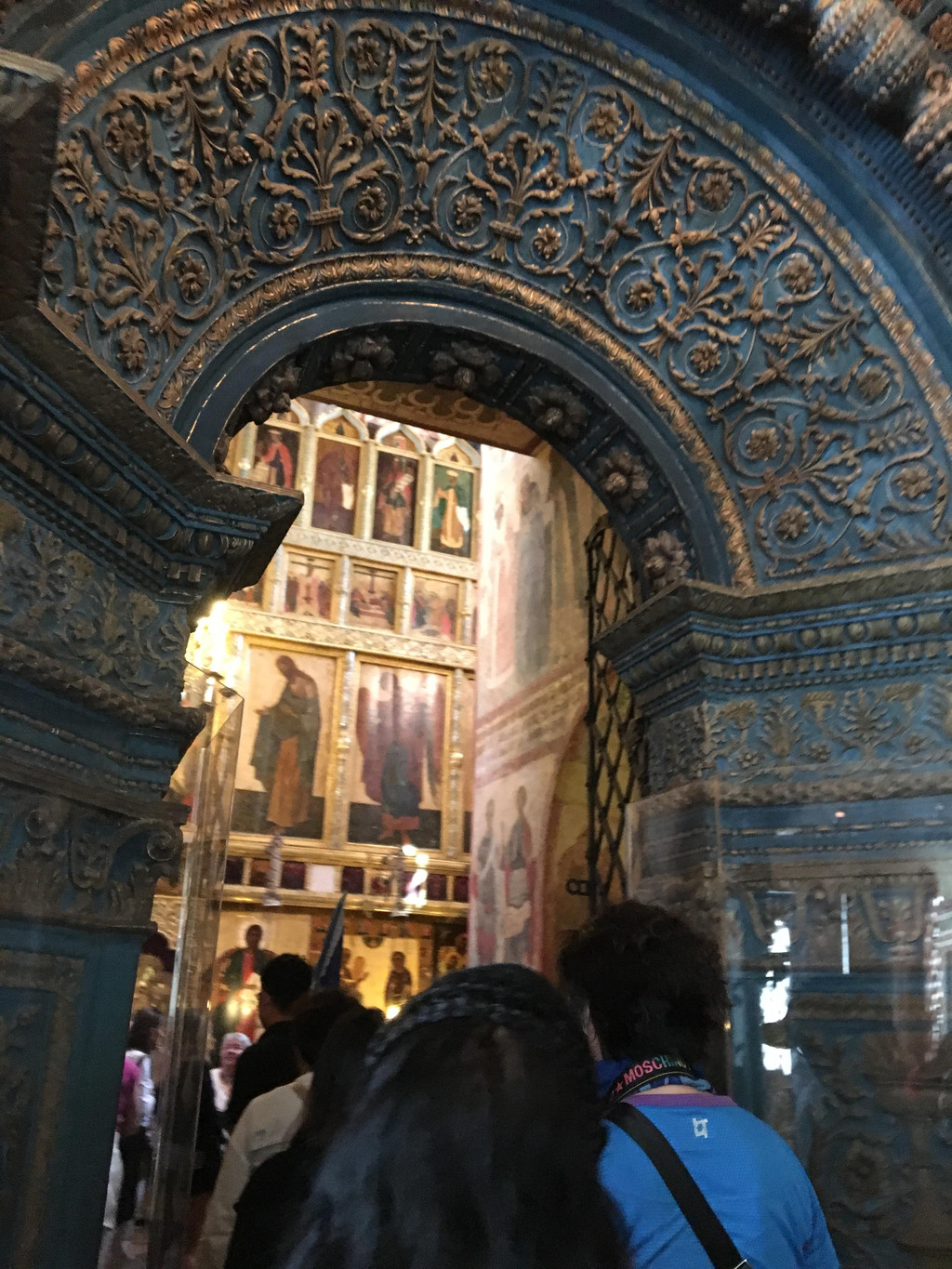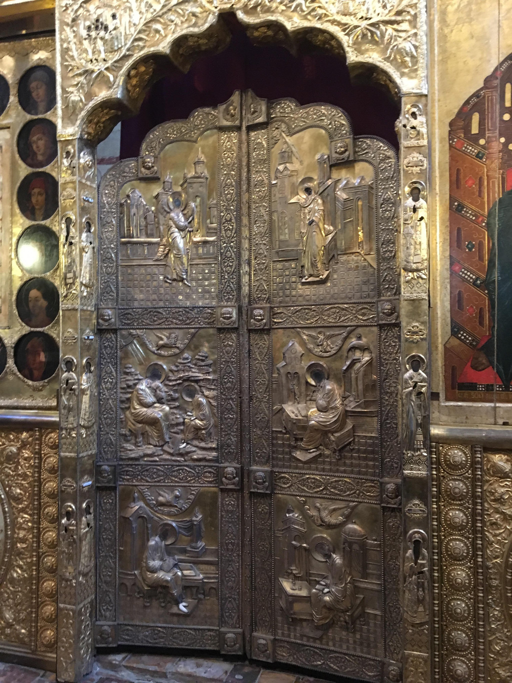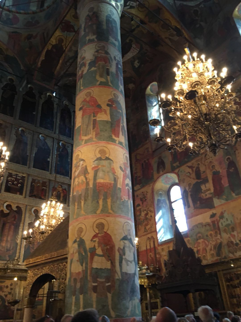 这座教堂建于15世纪后期的1480年,白色石头建筑,进入教堂,满是壁画的教堂空间不是不大,柱子不是很粗也画满壁画,拱形顶,正面是祭坛,墙上有圣经故事圣像五层,导游介绍一般教堂圣像只有四层或更少,五层圣像的教堂宗教级别高,具有加冕资质,这个教堂就曾为多代沙皇登基行加冕礼,它的旁边是天使报喜教堂,黄金球顶,是皇族子孙洗礼结婚的教堂,