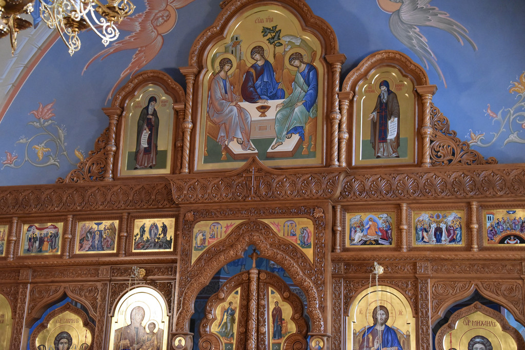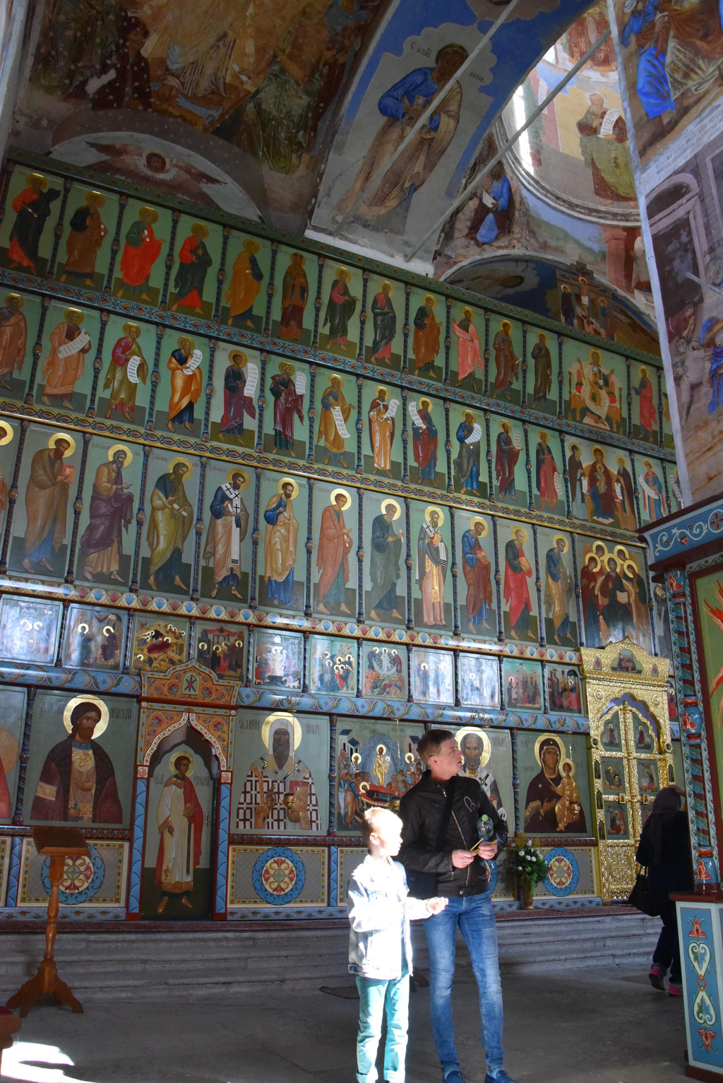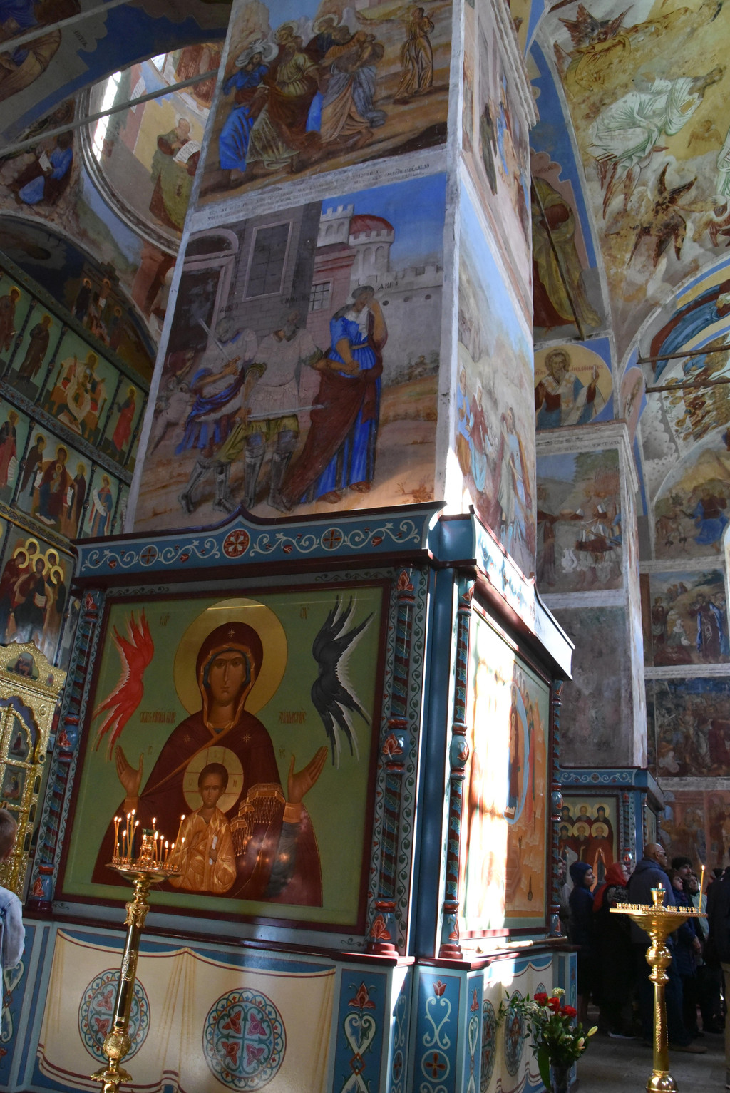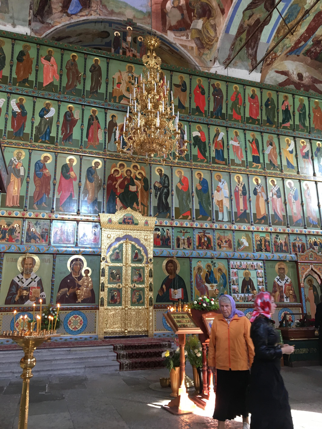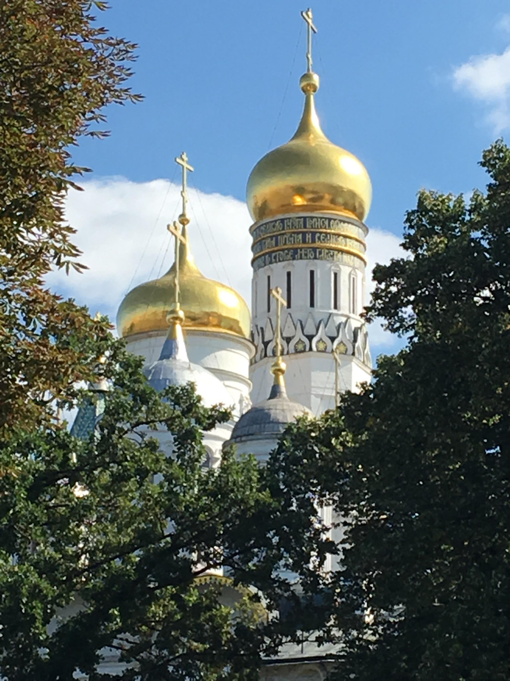 这座教堂建于15世纪后期的1480年,白色石头建筑,进入教堂,满是壁画的教堂空间不是不大,柱子不是很粗也画满壁画,拱形顶,正面是祭坛,墙上有圣经故事圣像五层,导游介绍一般教堂圣像只有四层或更少,五层圣像的教堂宗教级别高,具有加冕资质,这个教堂就曾为多代沙皇登基行加冕礼,它的旁边是天使报喜教堂,黄金球顶,是皇族子孙洗礼结婚的教堂,