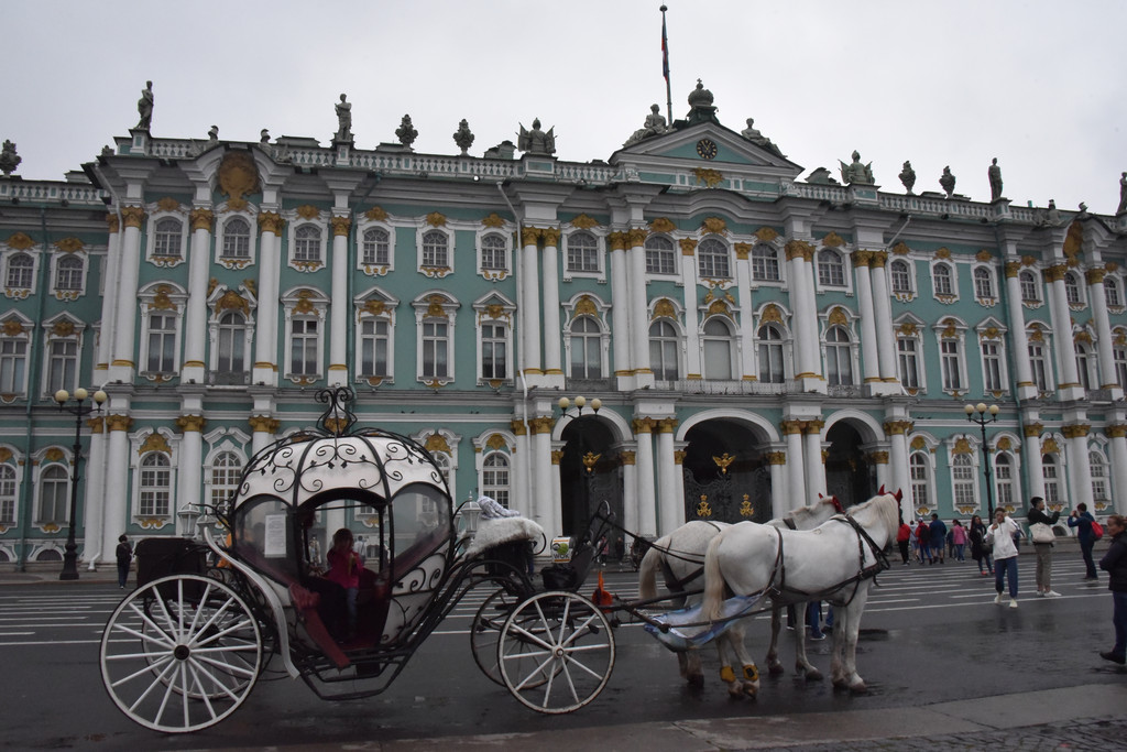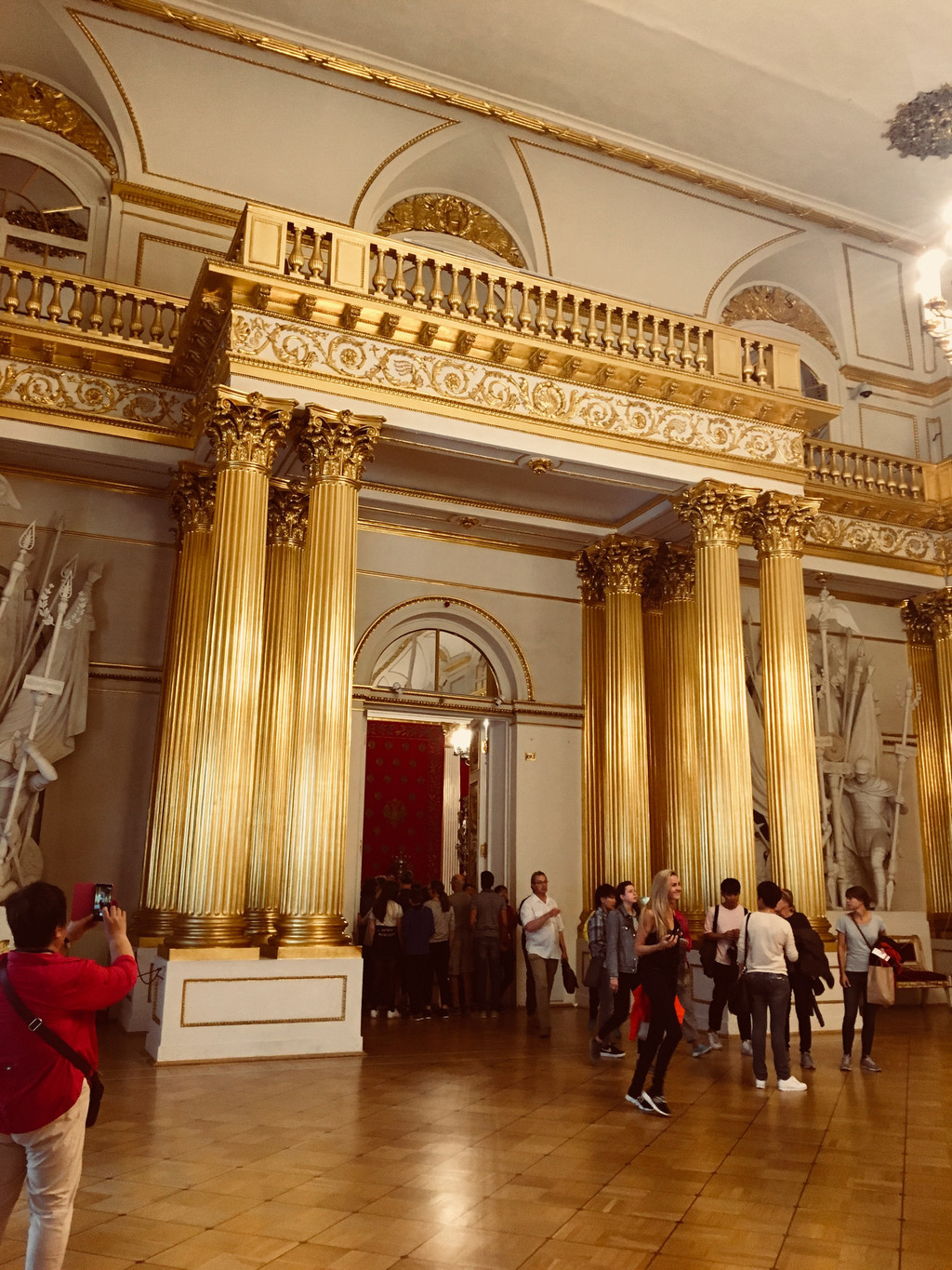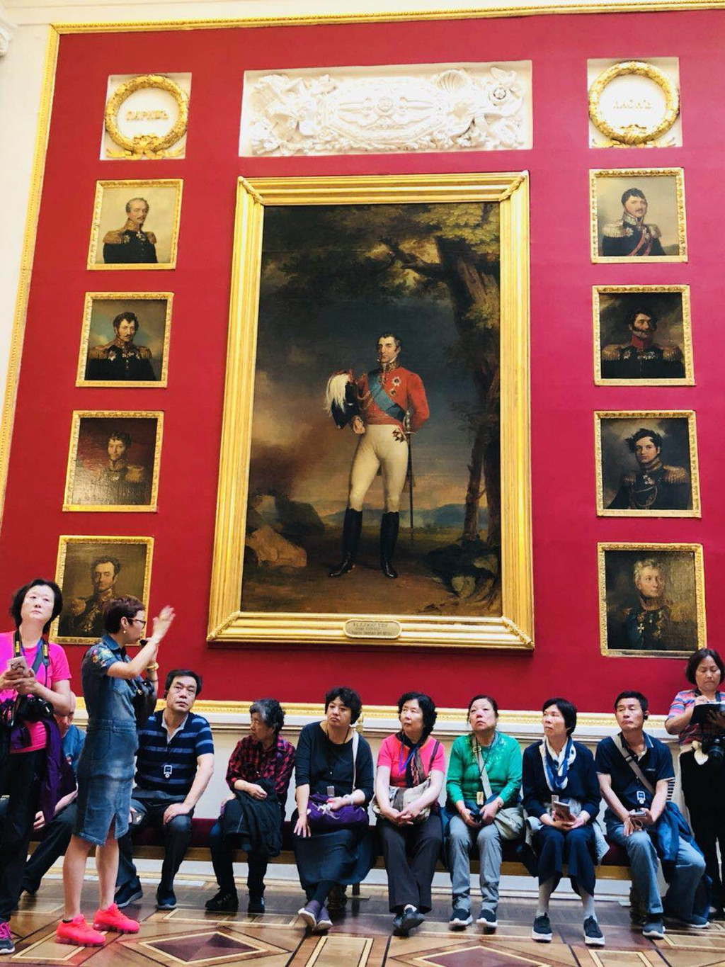 终于要去冬宫啦!曾经经历过那个没有什么电影可看的年代,译制片《列宁在十月》《列宁在1918》翻来覆去地看,里面的大段台词都会背,列宁在十月电影中武装起义、阿芙乐尔号巡洋舰、攻打冬宫等等场面熟悉到不能再熟悉,今天我们就要到冬宫看看,看看这个沙皇宫殿的真正模样,其实冬宫不是一个宫殿,而是由五个部分组成的:埃米尔塔什宫、大冬宫、小冬宫、新冬宫以及冬宫皇家艺术剧院组成,其中埃米尔塔什宫珍藏着历代沙皇收集的艺术珍品,是一个名副其实的博物院,它与法国卢浮宫、英国大英博物馆、美国大都会博物馆齐名,列为世界四大博物馆之一,我们今天要参观的是除皇家艺术剧院的其他四个部分,等等,可不是全部,要是半天全部看下来走残了也不可能,只能是部分看,这个部分是由一个冬宫专门的引导人员引导着走的,解说就是我们的金牌导游丹丹,好在这里允许随便拍照,可以照下来回去慢慢欣赏。