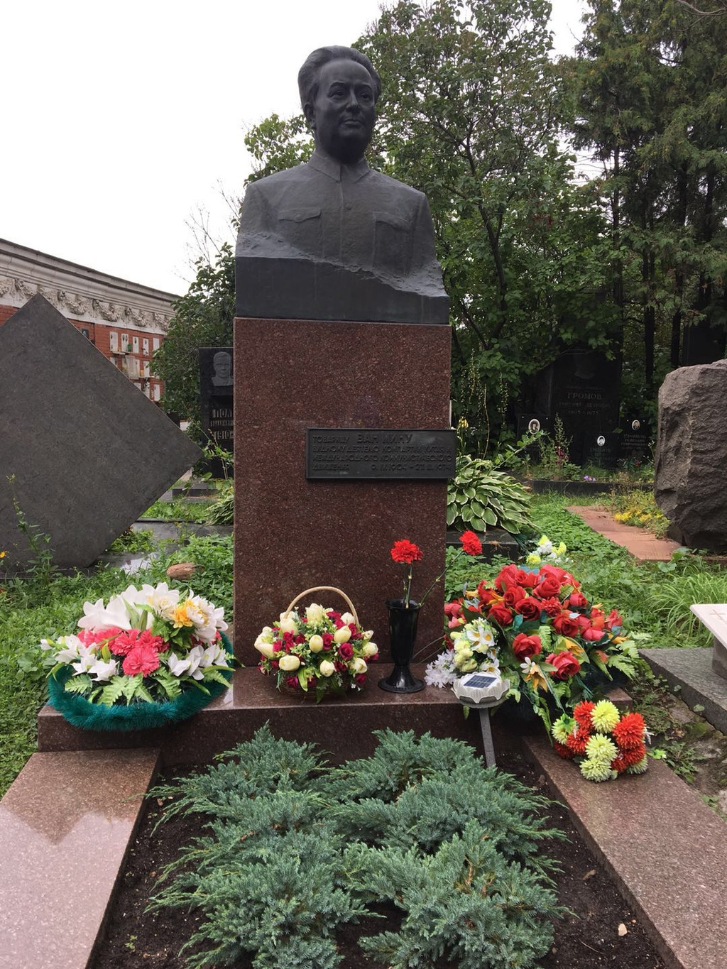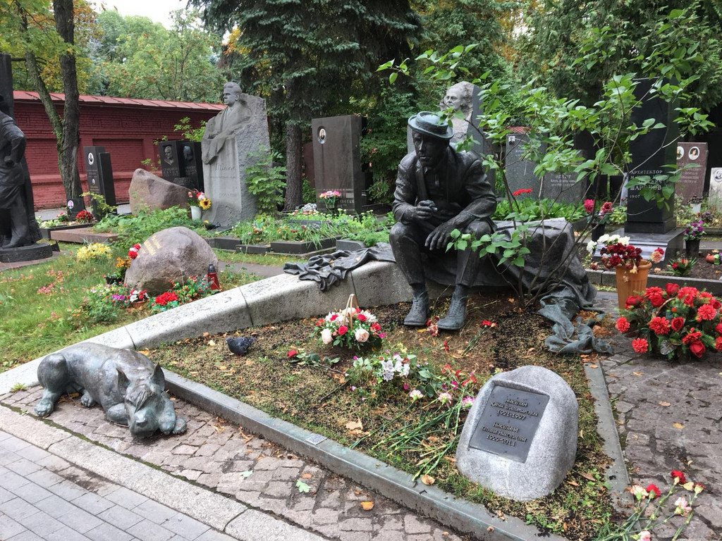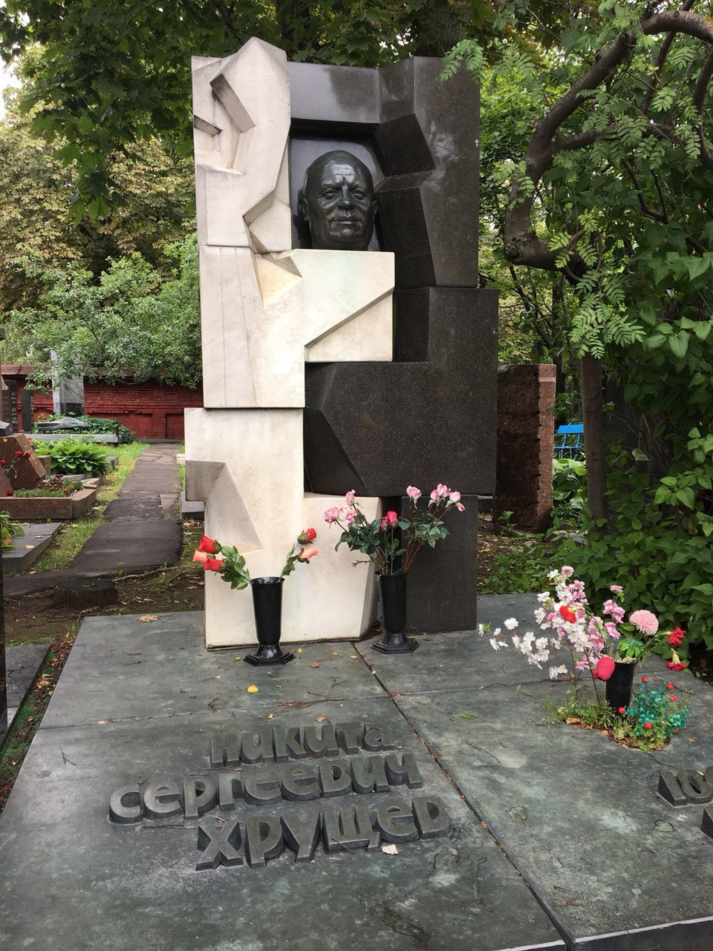 赫鲁晓夫墓,赫鲁晓夫是唯一一位遗体不在红场的苏联领导人,因他的儿子被斯大林处死,虽表面不能反抗,但发誓死后绝不与斯大林埋在一起,当然靠政变推翻他的勃列日涅夫也不同意将他葬在红场,家人将他葬在这里,并请与他生前势不两立的雕塑家为他做了雕像,一半黑色一半白色的大理石诠释了他的人生,右眼角两滴泪表示了他早年丧子之痛。
