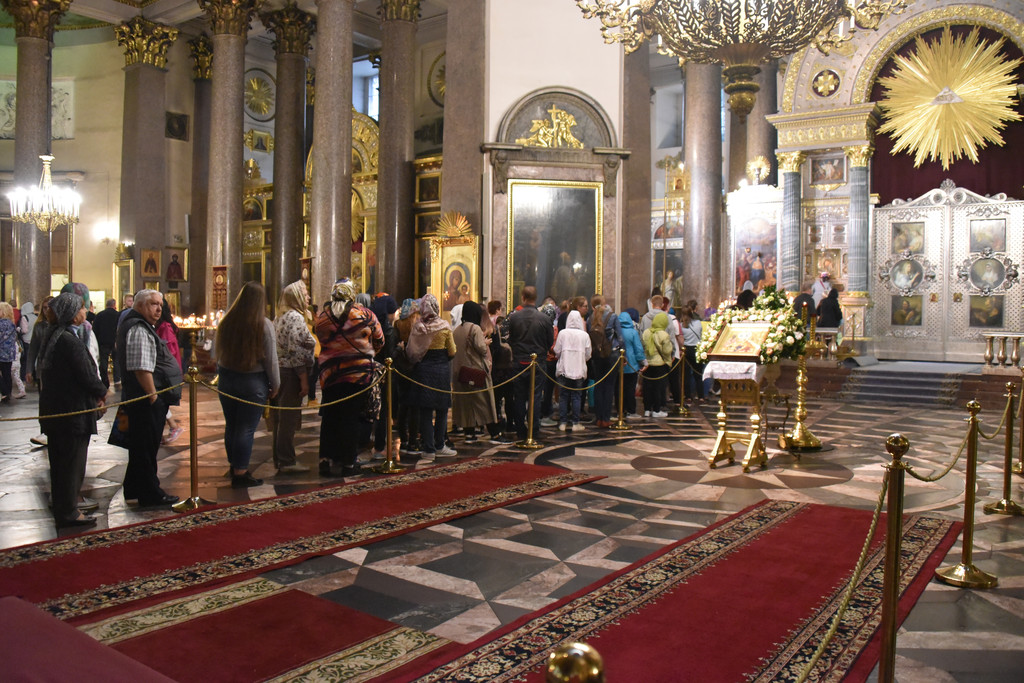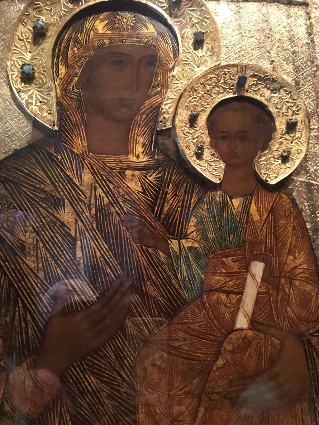 进到教堂中怎么看都感到非常熟悉,中央祭坛顶部一个高大圆形穹顶垂下大型吊灯,拱形顶部都是规则的图案,其中一个长长的队列,人们是在排队膜拜喀山圣母画像,画像只有一米见方,但据说非常灵验,每逢有灾难出现都会有显示。真想不出它会以什么方式提示世人。