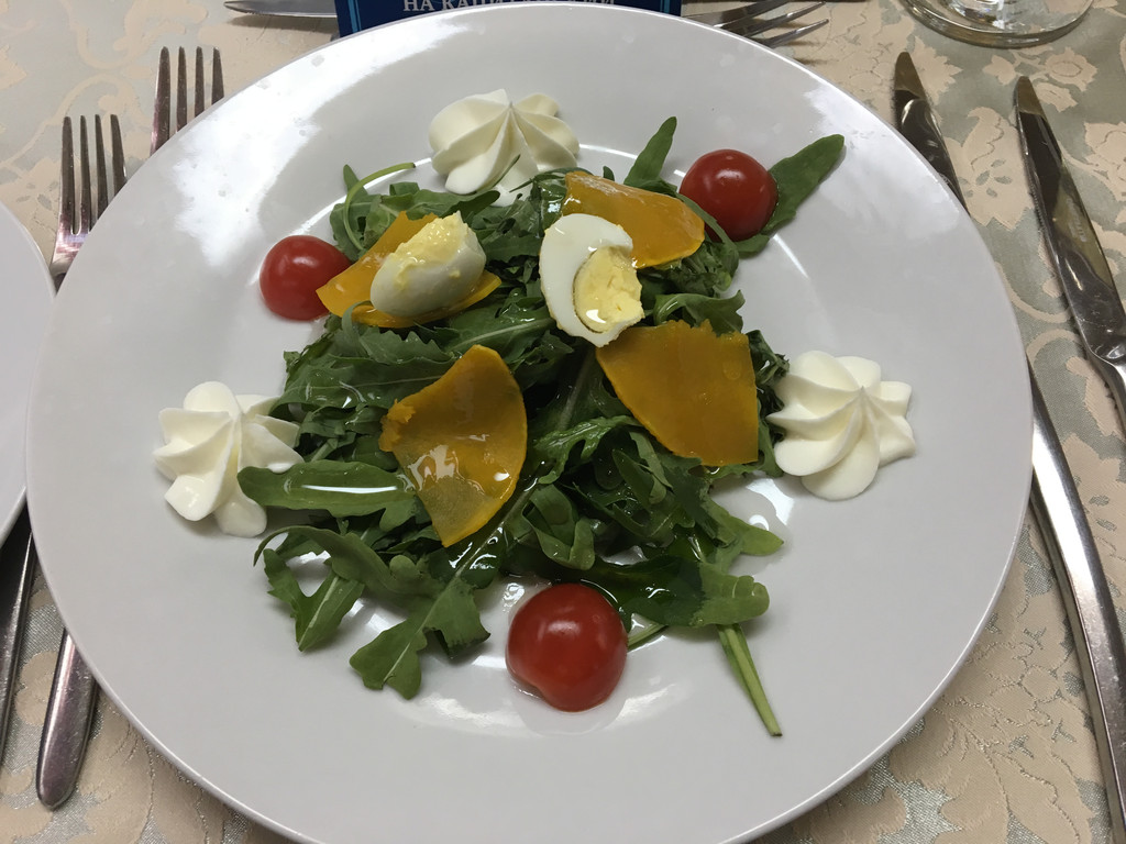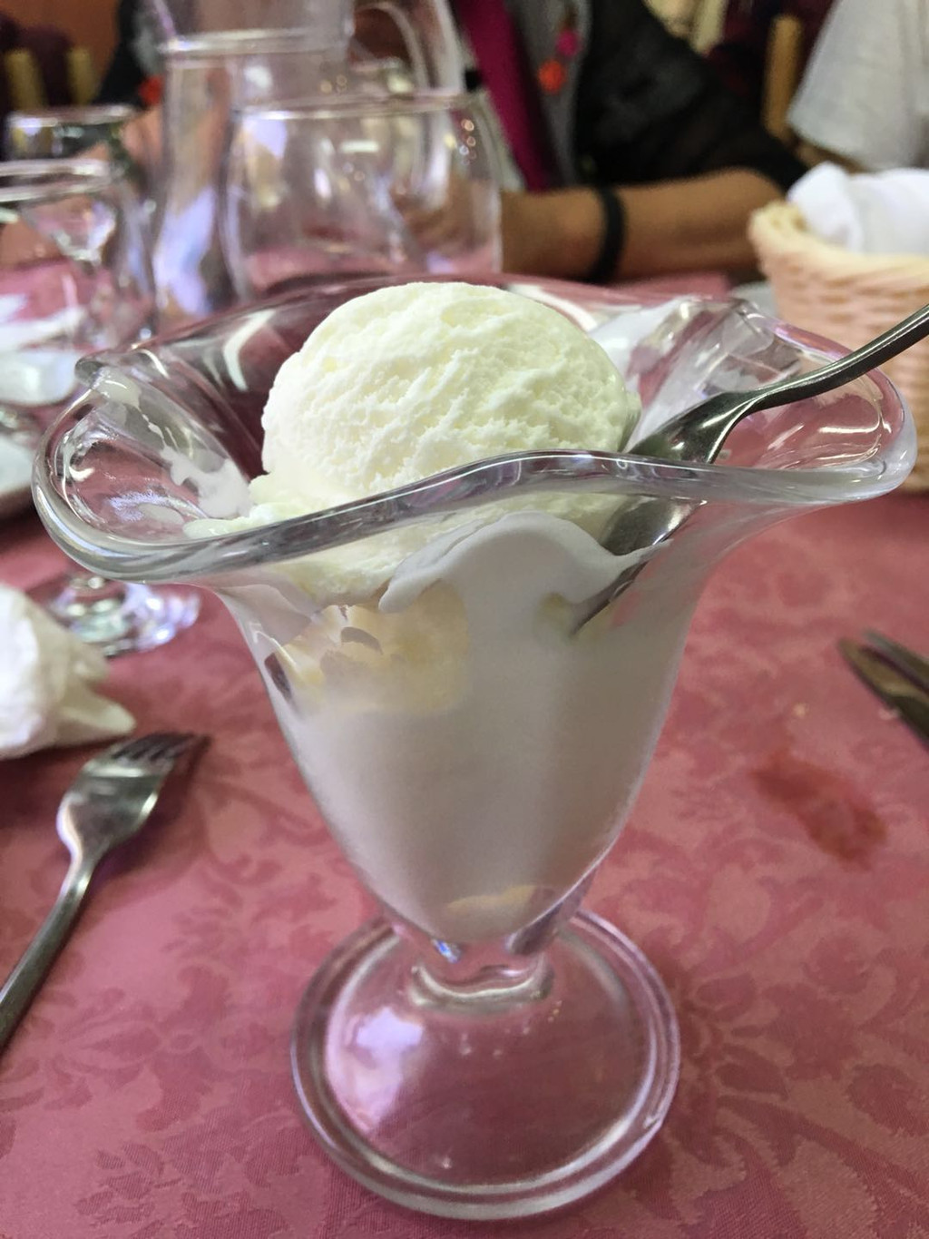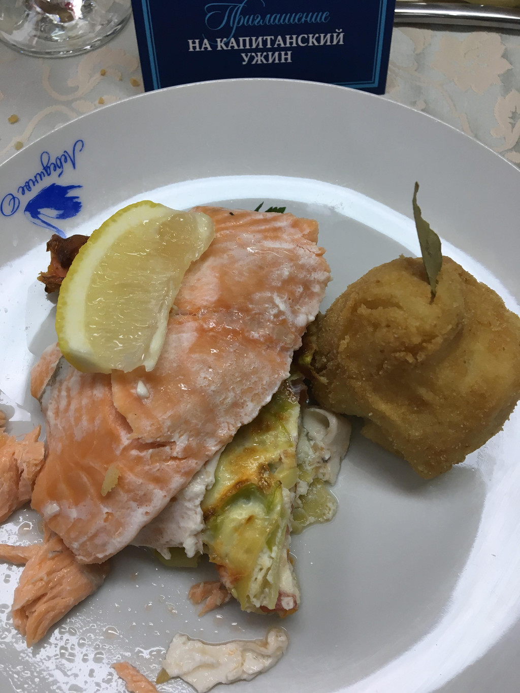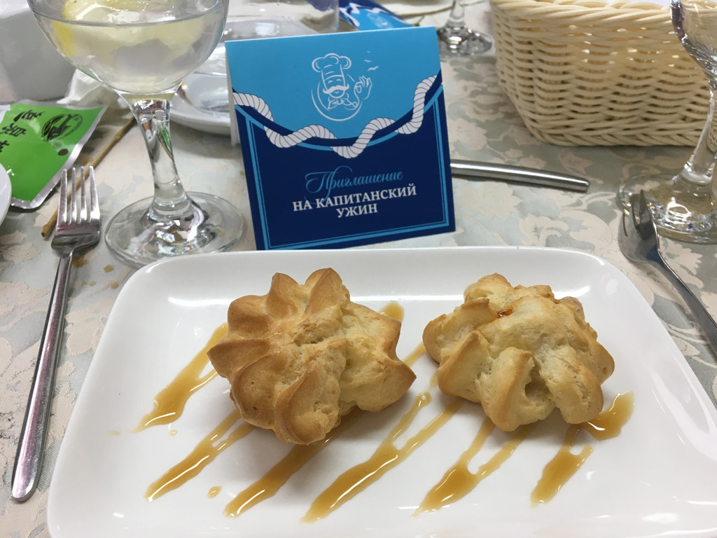 开饭啦,我们六人一桌,编好号码,以后就按这个号码订餐啦,因为今天是第一天,船上安排了欢迎宴,饭菜不需预定,桌上已经摆好了前菜沙拉,果汁饮料,香槟和一篮面包,每桌有固定的服务员为您服务,真不嫌麻烦,她们每人负责两到三桌大约十几位客人,要注意观察每人的用餐速度,一道菜吃完再上下一道,俄式西餐按照前菜、汤、主菜、甜点的顺序,每人要换餐盘4次,如果每人点的菜不同她还要区别送餐不能给错,不容易啊,第一顿吃的太饱了,特别是那一篮面包原是为不够吃做补充的,某些人把它也当主食吃了,结果可想而知,撑死了,餐后甜点冰激凌是我们的最爱,决定只要有冰激凌一定点它。