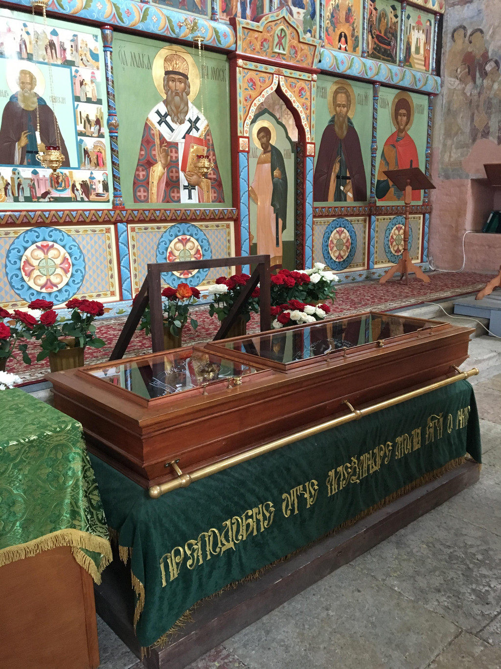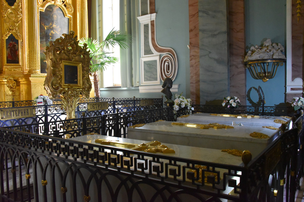 对面金顶紫红色帐幔下的座椅是沙皇的位子,第一排棺木里躺着彼得一世和他的第二任妻子叶卡捷琳娜一世女沙皇,