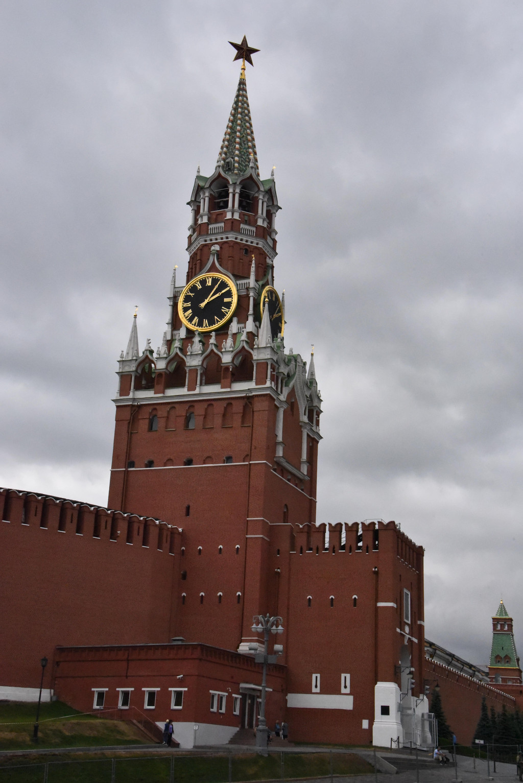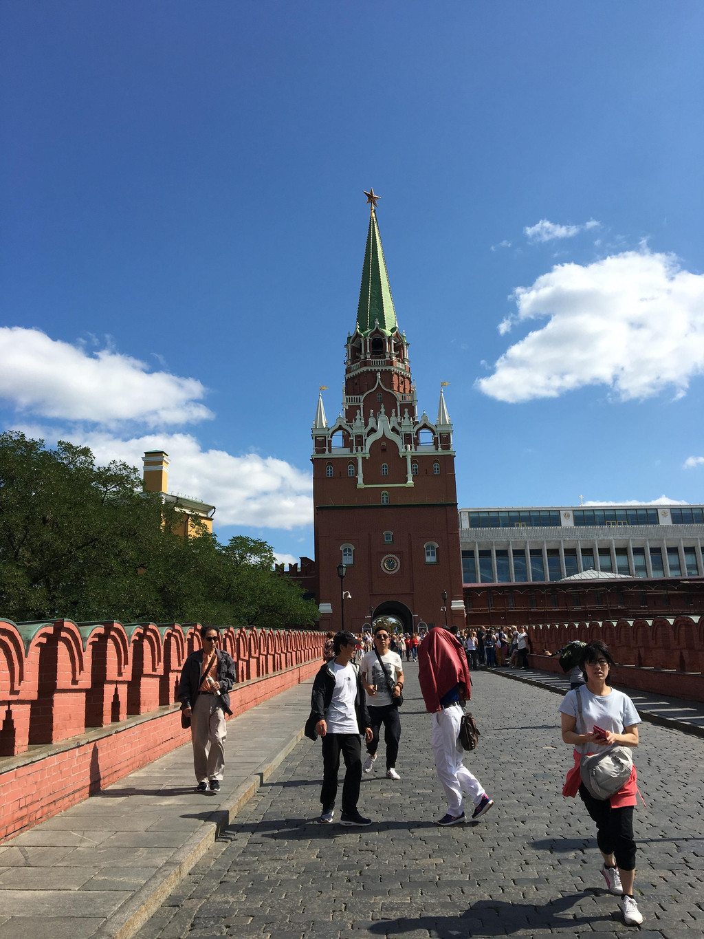 这里可没有想象中的宫殿,“克里姆”俄语的意思是“内城”,克里姆林宫其实是一道城墙围绕的建筑群,那个“尖顶建筑”是城墙的一个塔楼,塔楼高67.3米,高高的尖顶上有一颗用几吨重的红色水晶石做成的五角星,内装5000瓦照明灯,夜晚红光闪闪,这也是当时那49颗红星中的一颗,红星的朝向不是固定的,可以根据风向变换方向(我曾奇怪它为啥位置不正),