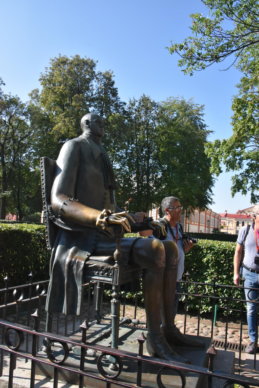 街上不时出现一些雕塑,其中一个是普希金和他的妻子娜塔莉亚牵手的雕像,普希金是俄国著名文学家、诗人、小说家,现代俄国文学的创始人,19世纪俄国浪漫主义文学主要代表,同时也是现实主义文学奠基人,俄国“文学之父”,他一生追求过不少漂亮女人,最终与美丽的娜塔莉亚结婚,结婚六年后遇到了法国青年丹特士,被认为好色之徒的丹特士猛烈追求娜塔莉亚,严重影响了普希金的声誉和家庭和睦,为彻底解决问题,普希金选用了在现代人看起来既愚蠢又可笑的决斗方式,用手枪决斗,中间人判定由丹特士开第一枪,一声枪响普希金倒地,腹部中弹不治身亡,年仅38岁,一代诗人就这么去了。