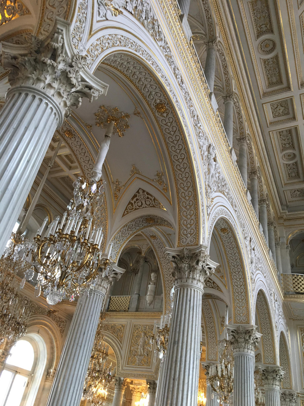 小冬宫部分,叶卡捷琳娜二世是第一位使用冬宫的沙皇,在冬宫中为自己专门建造了一个房间,房间中有两个大型吊灯和若干个小吊灯,墙壁全部白色镶金色花纹图案,