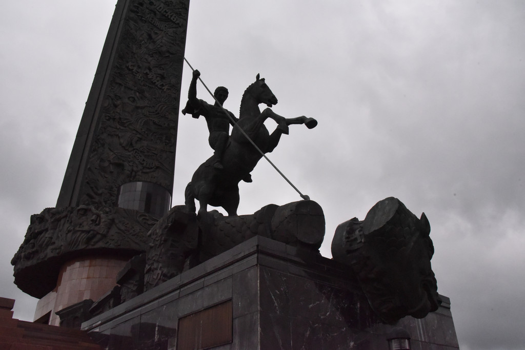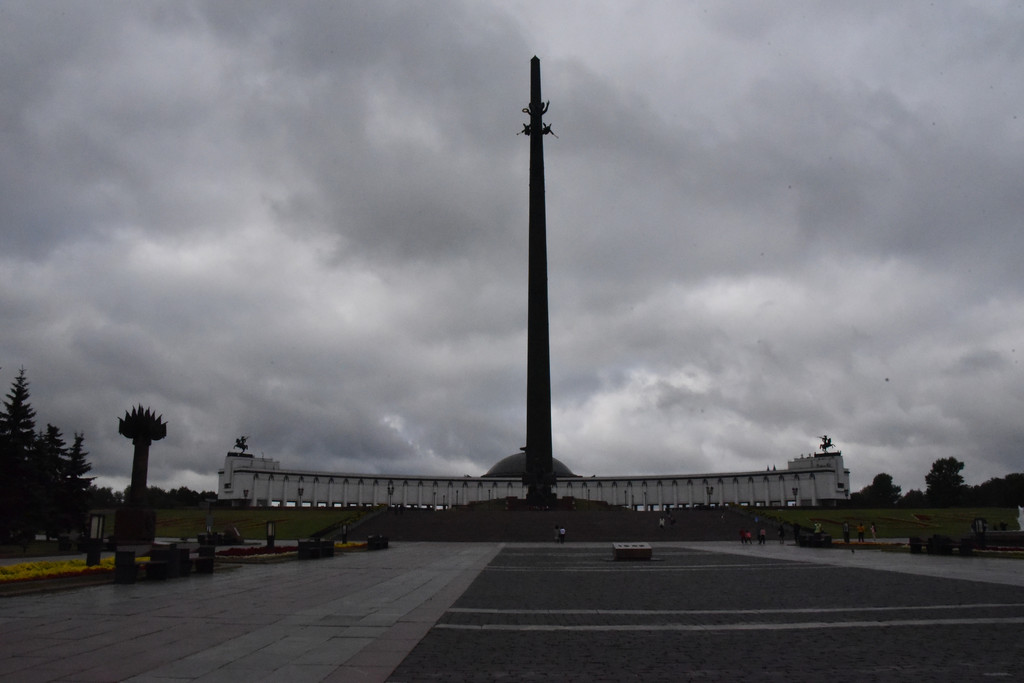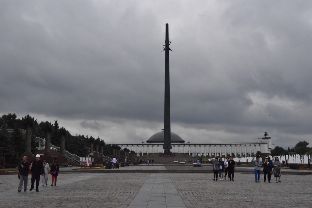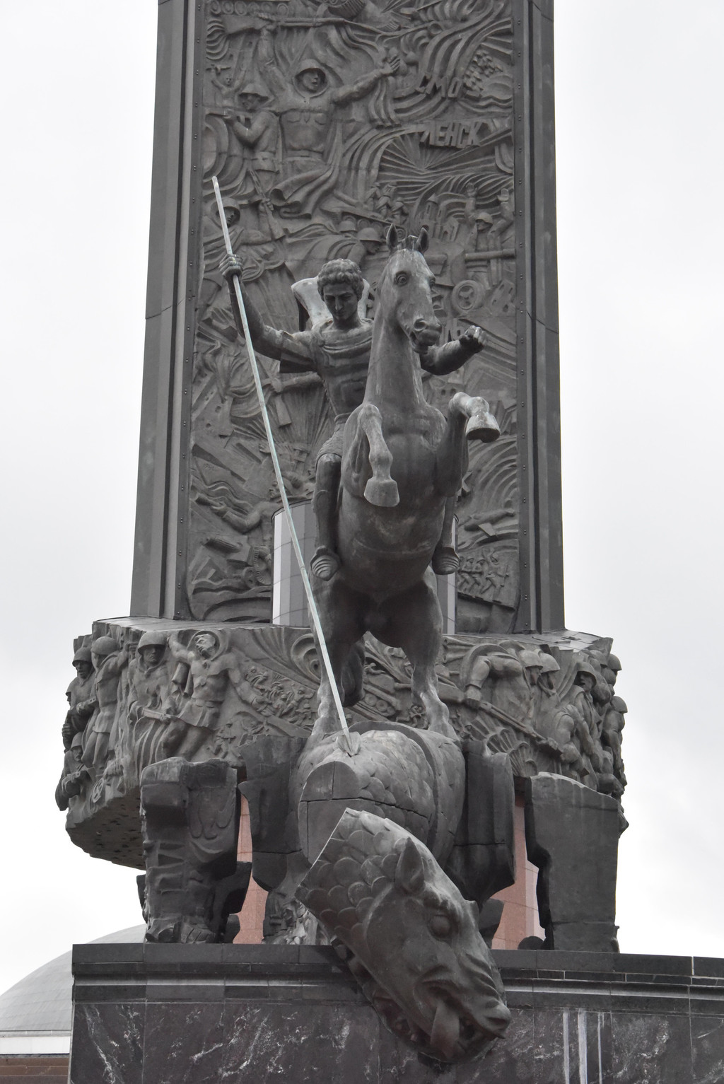 广场尽头紫红色大理石台阶上矗立着一个高141.8米的纪念碑,代表了俄罗斯在二战中经历的1418个日日夜夜,纪念碑前一个圣乔治屠龙雕像,在斩断的龙头上还有纳粹的万字标志,纪念碑的身后是一个巨大的白色的弧形建筑,那是二战纪念馆(展馆在地下)。