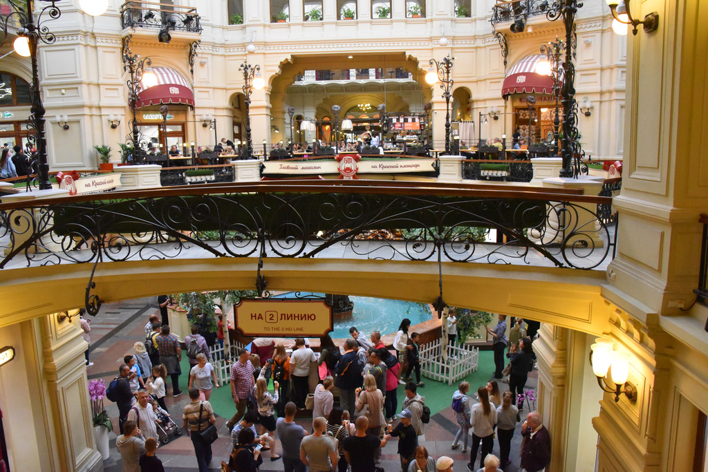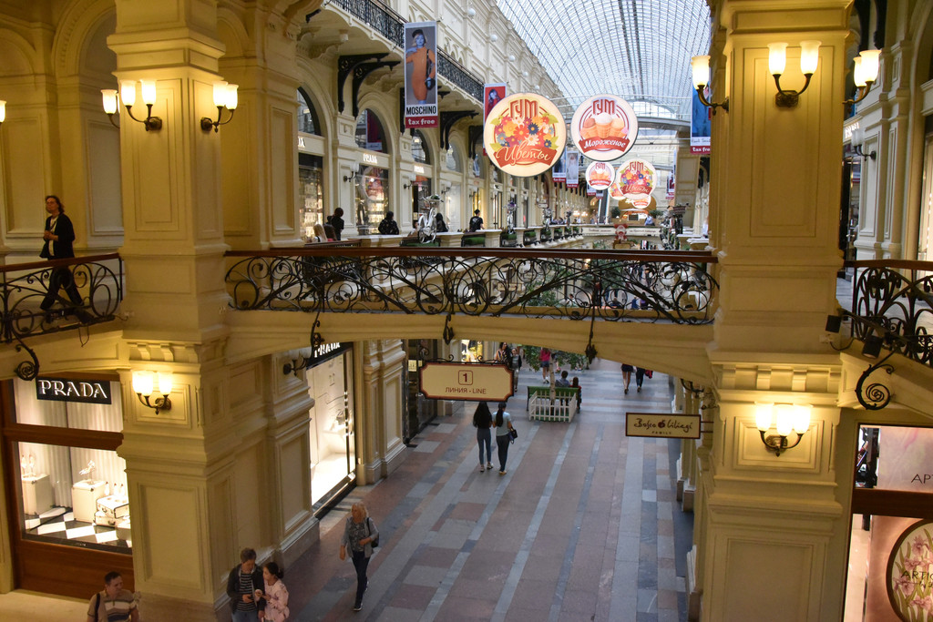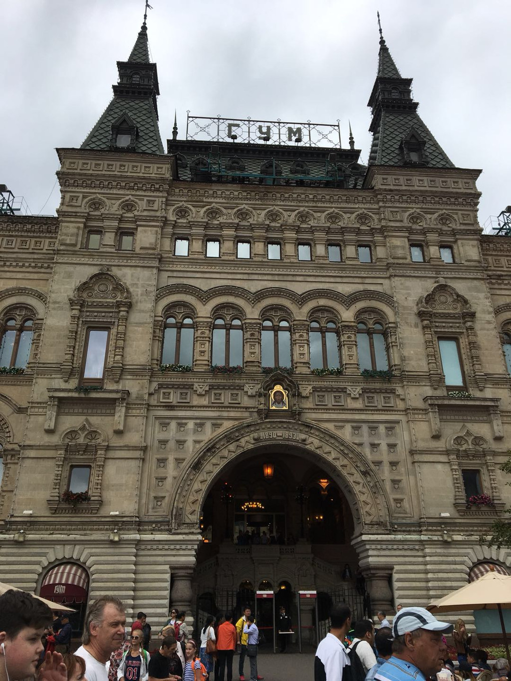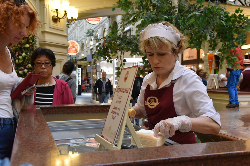 克里姆林宫红墙的对面是有着上百年历史的顾姆百货商场,商店是两层建筑,大理石贴面,拱形圆顶,进入后中间是宽大的人行通道,两侧是店铺,里面的店铺如何真的不知道,因为我们进来的目的是为寻找那里著名好吃的冰激凌,原来50卢布两个球,现在100卢布,小娟大呼涨价了不爽,我们是爽不爽都要尝尝,嗯,确实不错。
