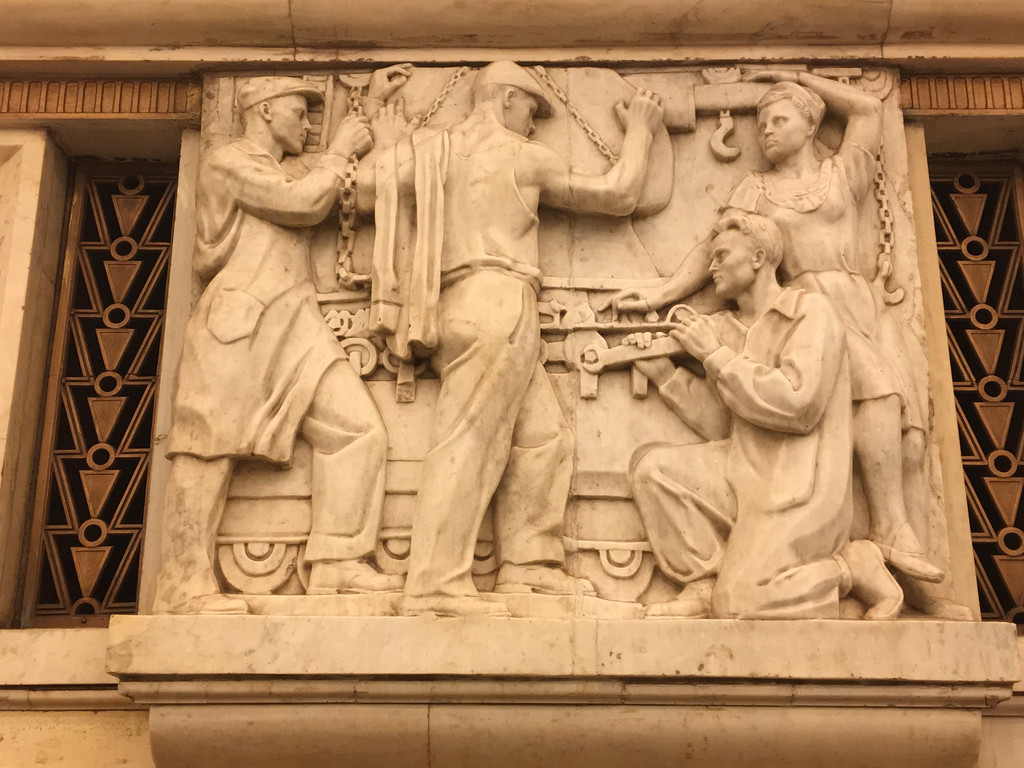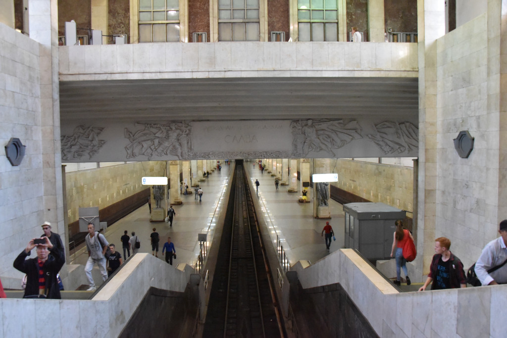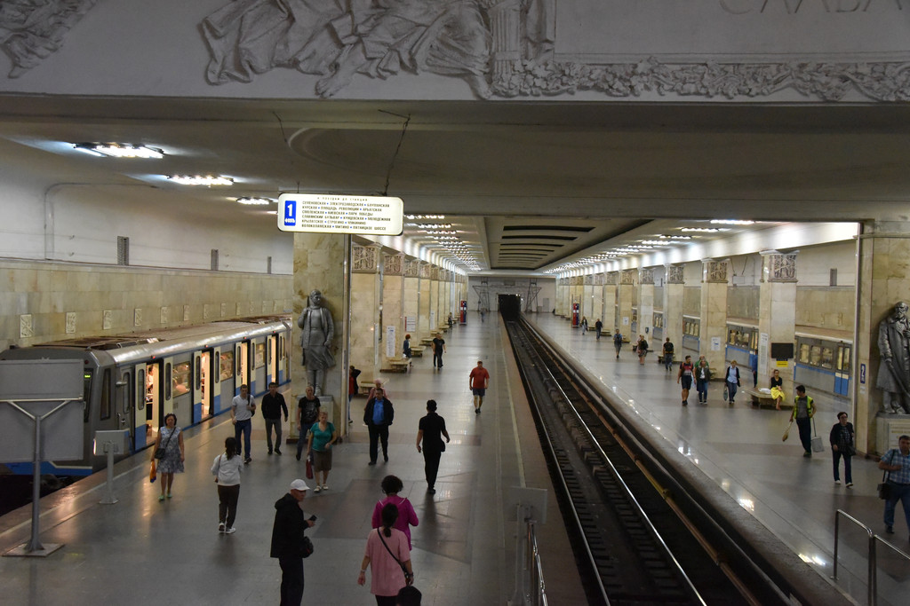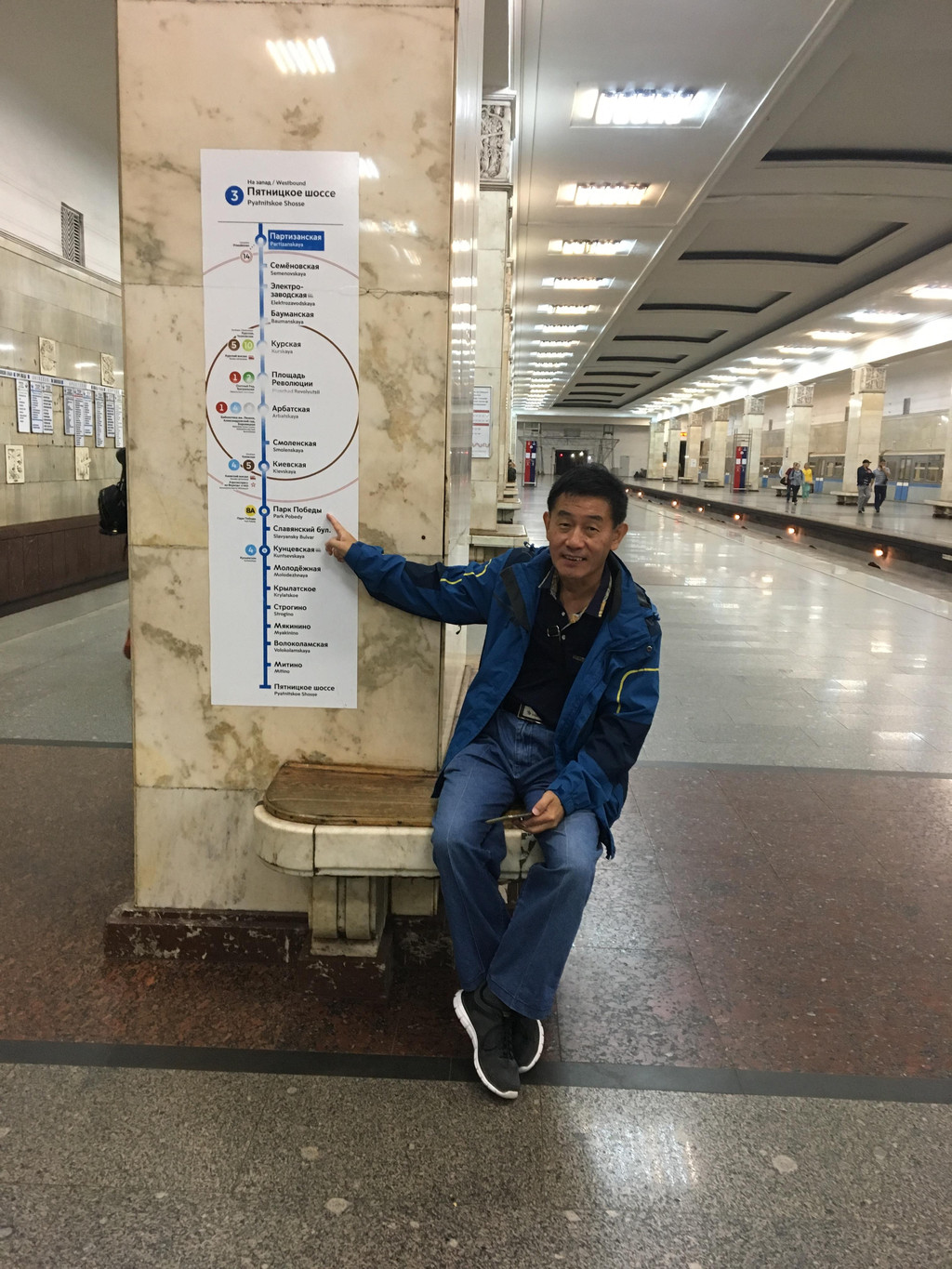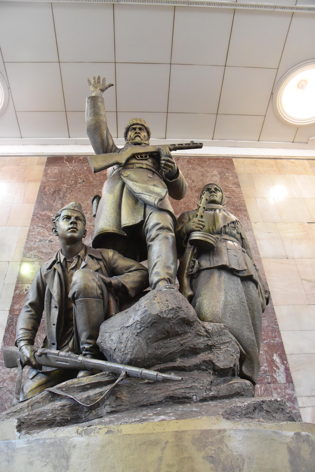 莫斯科地铁被公认为是世界上最漂亮的地铁,原本行程中没有安排,在大家的一致要求下临时增加了项目,忙里偷闲跑一趟,坐上两站体验一下,地铁标志是红色的M,莫斯科地铁是上个世纪三十年代开始兴建,1935年5月15日正式开通,目前有12条线路全长310多公里,设171个站台,每天运送乘客900多万人次,今天正值周六,没有太多拥挤的人群,从我们酒店附近的地铁站进入,地铁中基本是大理石建筑,宽敞明亮,到处是雕像和浮雕,我们所在的地铁站雕像主要是卫国战争时期的游击队员,浮雕为工农劳动场景,