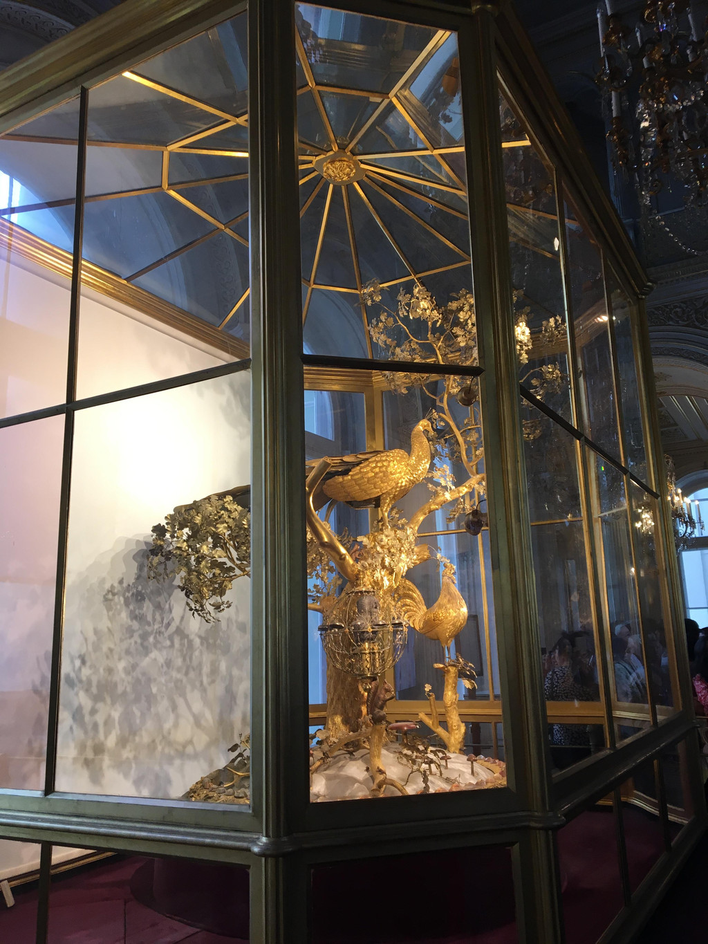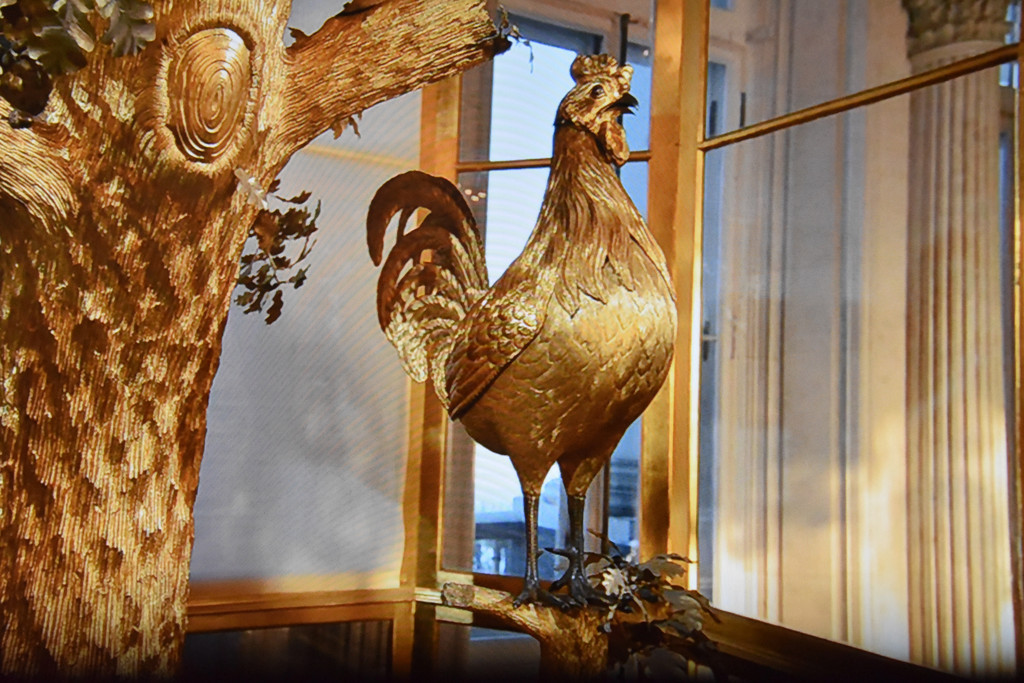 其中一个玻璃罩子里面是一只金孔雀站在树枝上,有金鸡到点打鸣,这是一个自鸣钟。